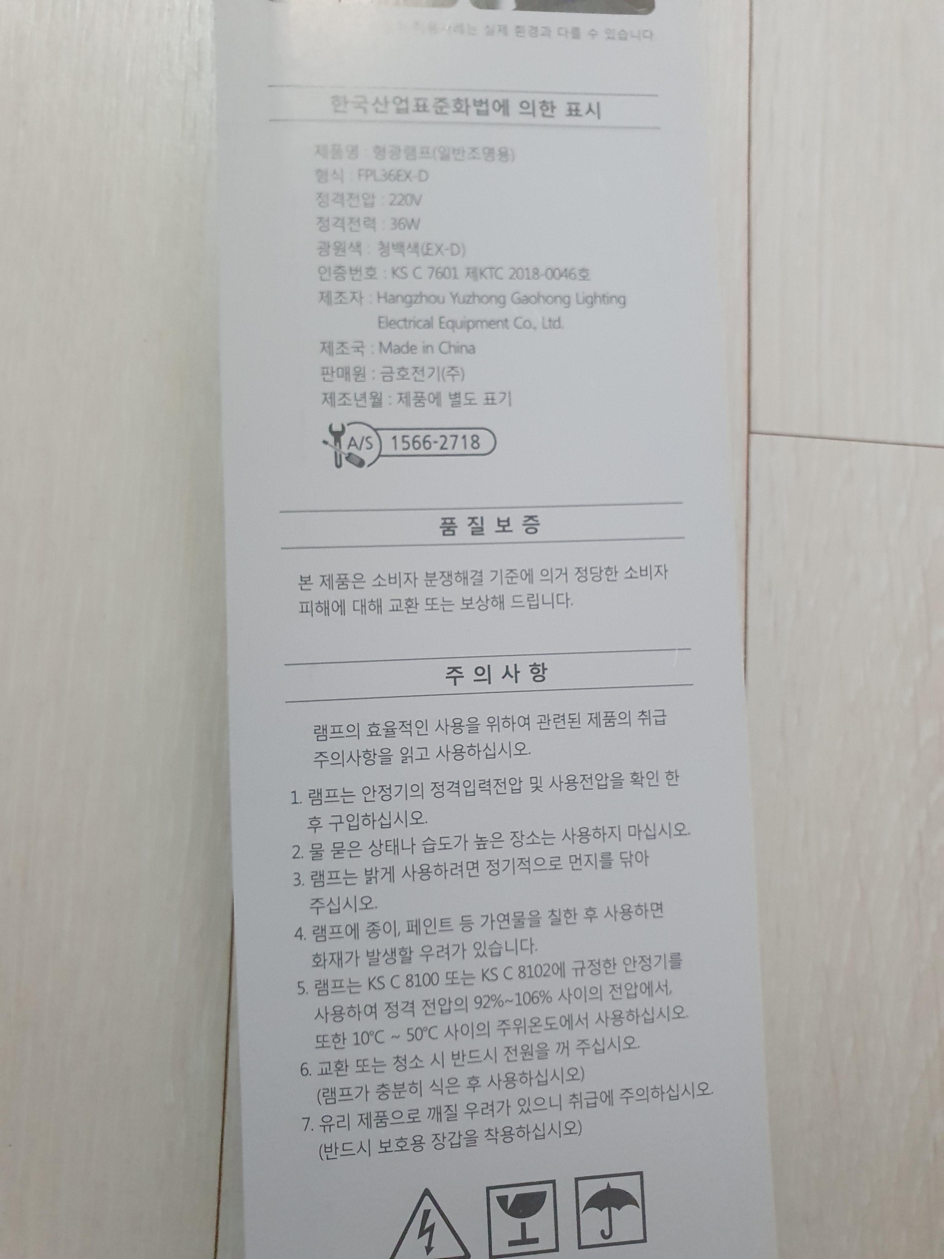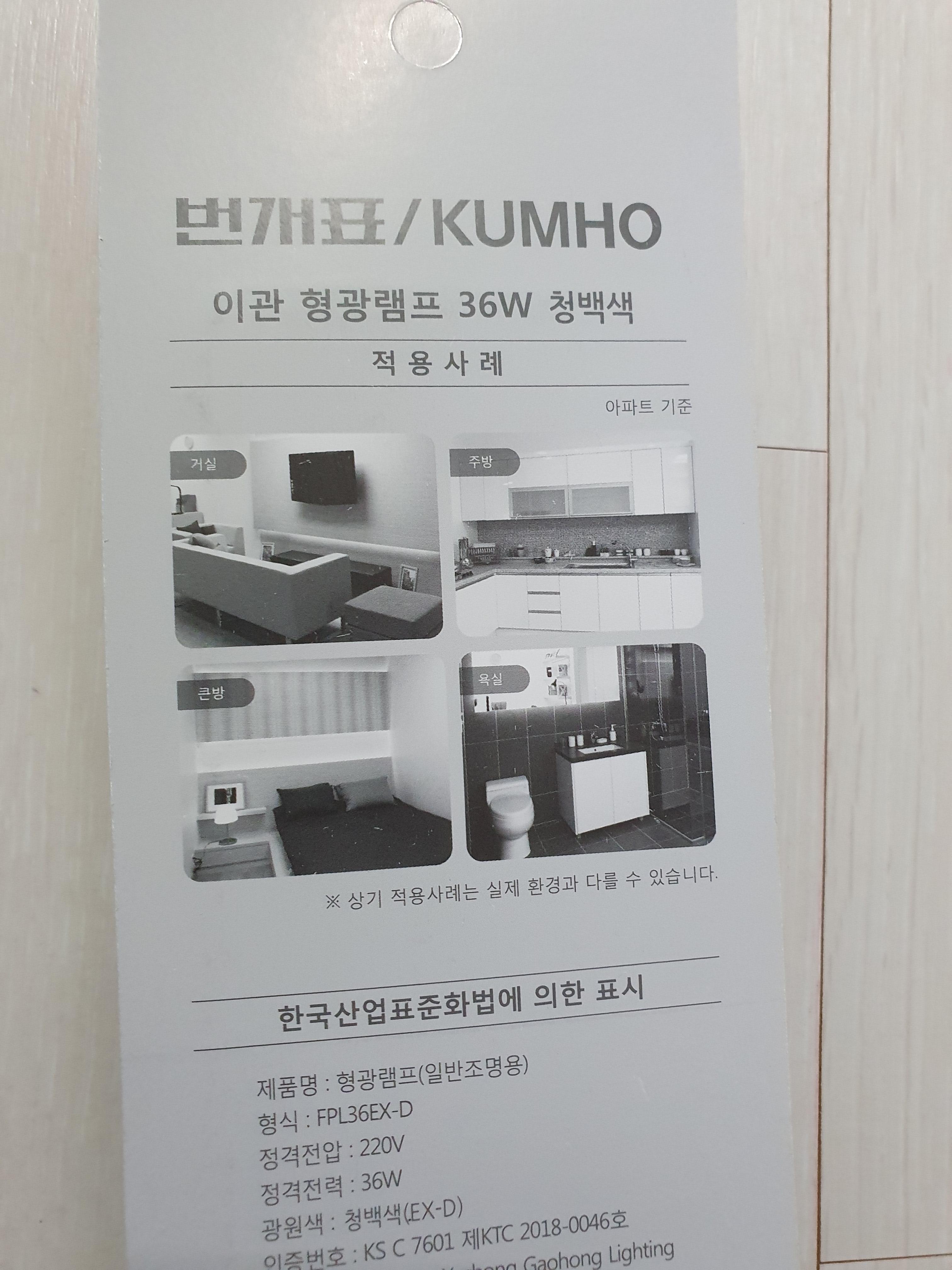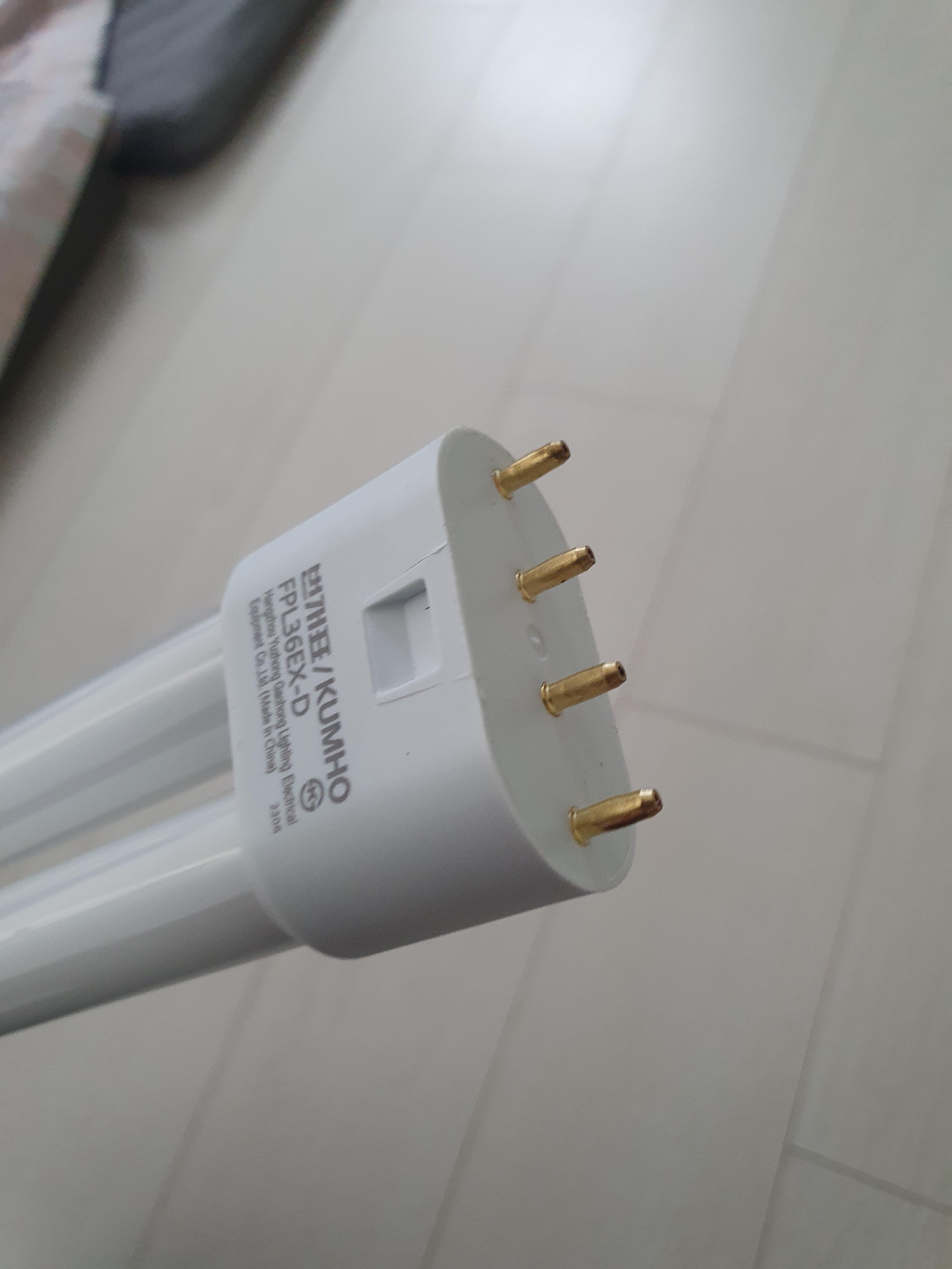 번개표 KUMHO 36W짜리 청백색 형광등이었고 형식은 FPL36EX-D이다. 그냥 가정에서 사용하는 일반적인 형광등이다. 길이도 딱 맞고 보편적으로 사용하는 그것 맞다.