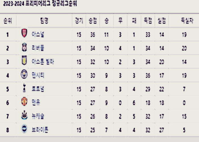 하지만 바로 4위 '맨시티'는 득실차 19, 3위 아스톤 빌라 14, 2위 리버풀 20, 1위 아스널 19이다.