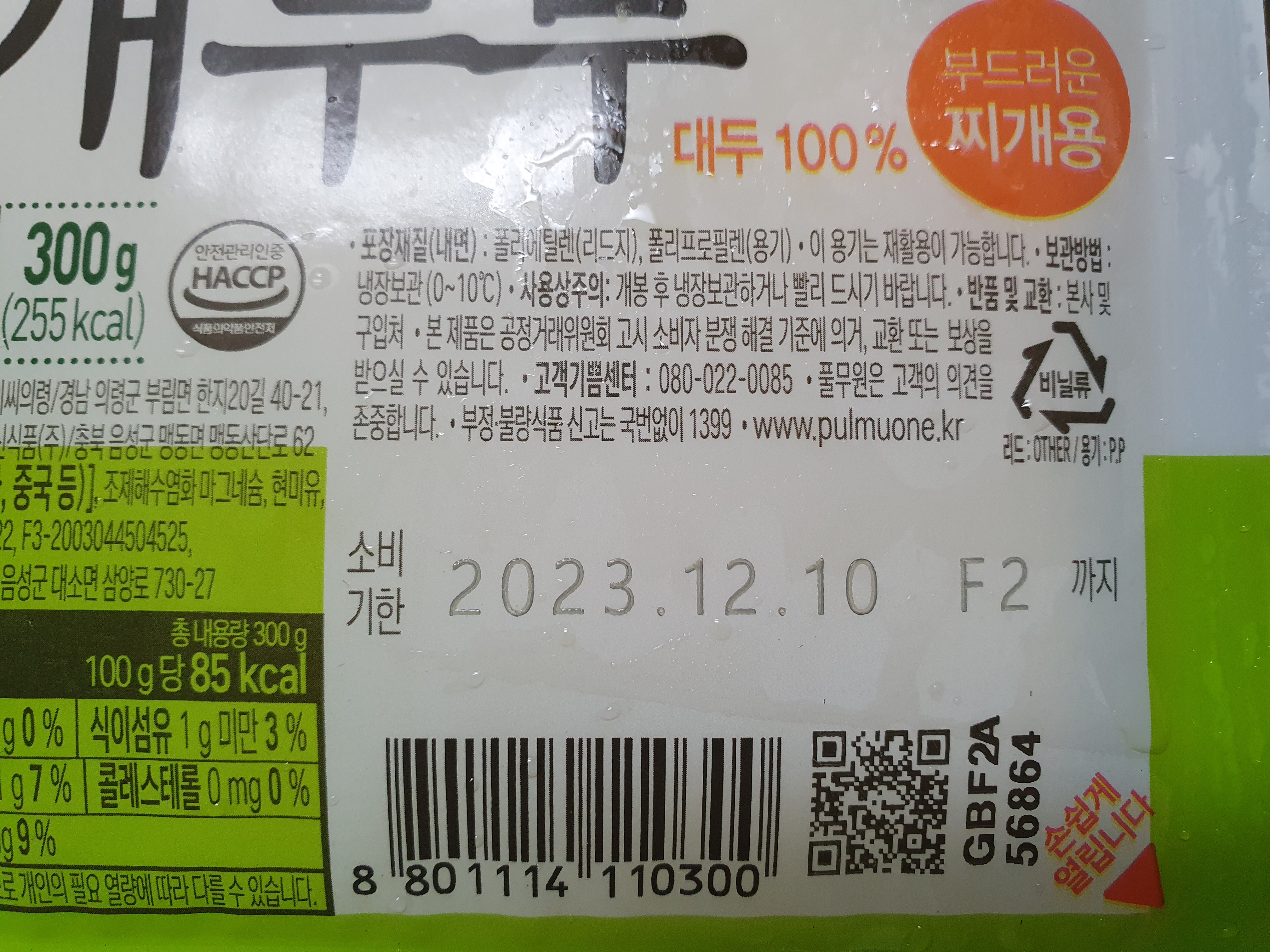 소비기한은 그리 길진 않지만 그렇다고 아주 짧지도 않기 때문에 너무 미루지만 않는다면 유통기한이 지나는 일은 없다. 하하.. 하지만 일하던 입장으로는 양은 많은데 유통기한은 좀 짧은 편이고 굉장히 잘 팔리지만 또 굉장히 자주 들어오는 상품이라서 유통기한 관리하는 게 참 짜증난다.-_-ㅋ 물론 풀무원 두부만 그런 게 아니라 두부류 그리고 유제품이 다 그렇다.