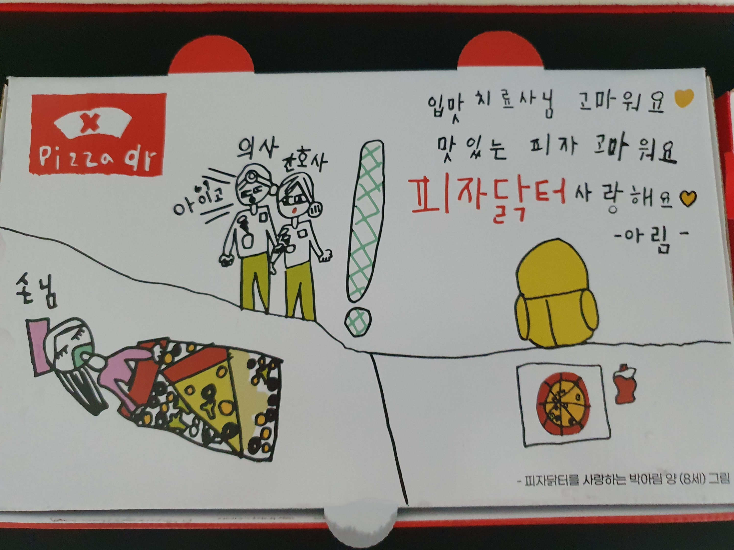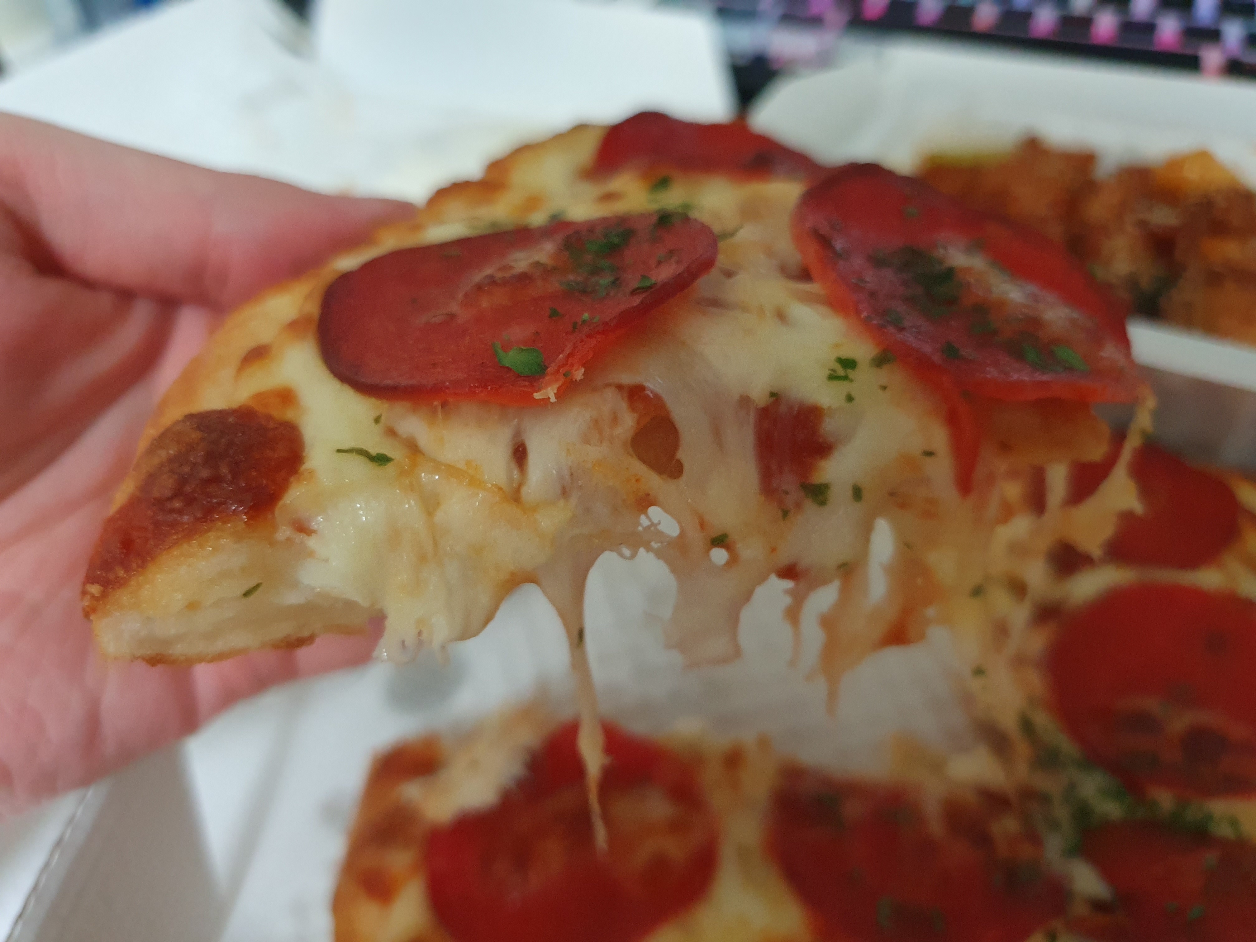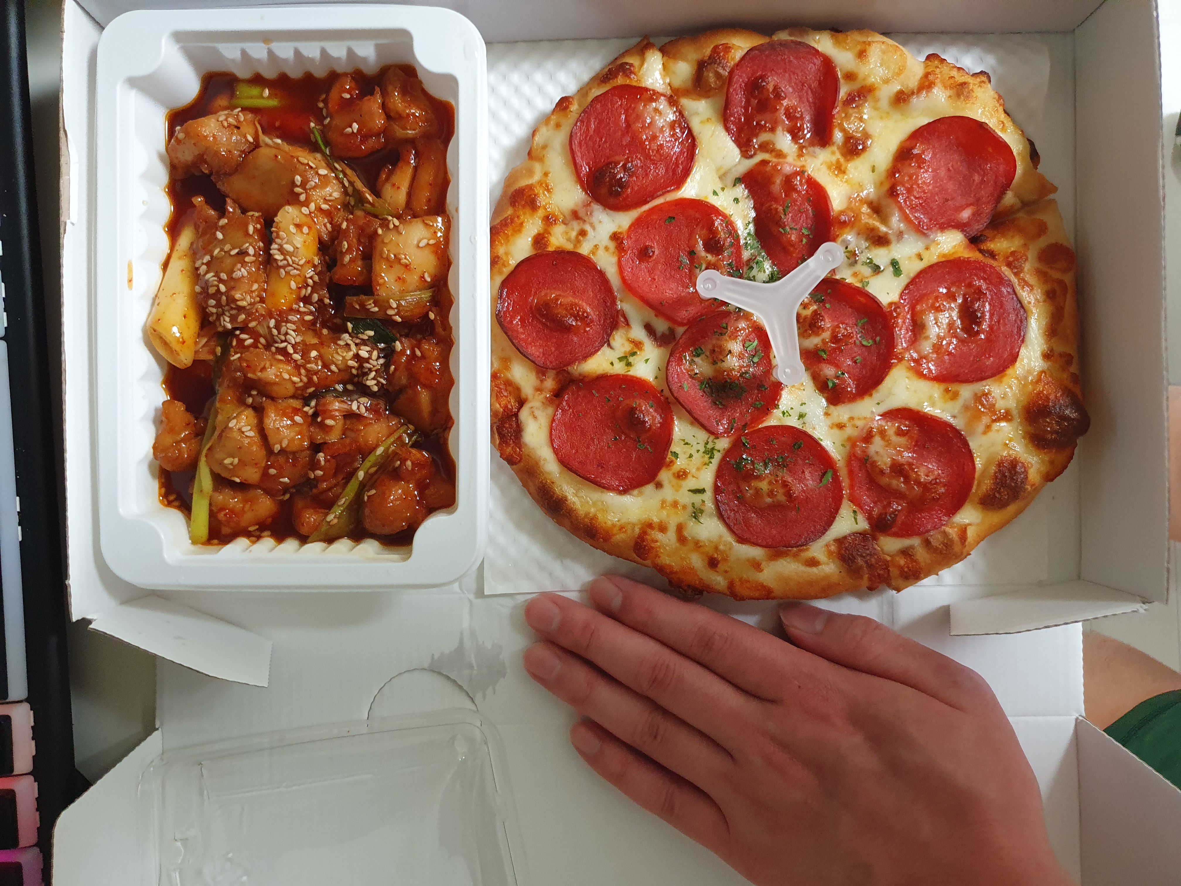피자와 치킨의 사이즈를 대충 체감해보라고 비교샷을 준비했고 크기는 작지만 도톰하고 무엇보다 맛이 좋아서 나는 괜찮았다.
