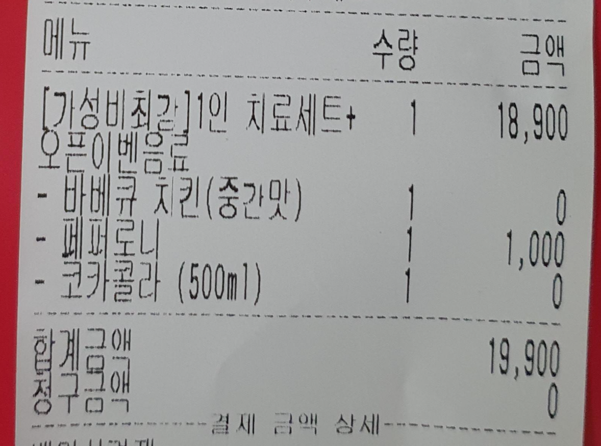 나는 1인 치료세트를 주문했고 세트 가격은 18900원인데 피자는 종류별로 가격이 달라서 페퍼로니 +1000원으로 배달료는 없고 총합 19900원 나왔다.