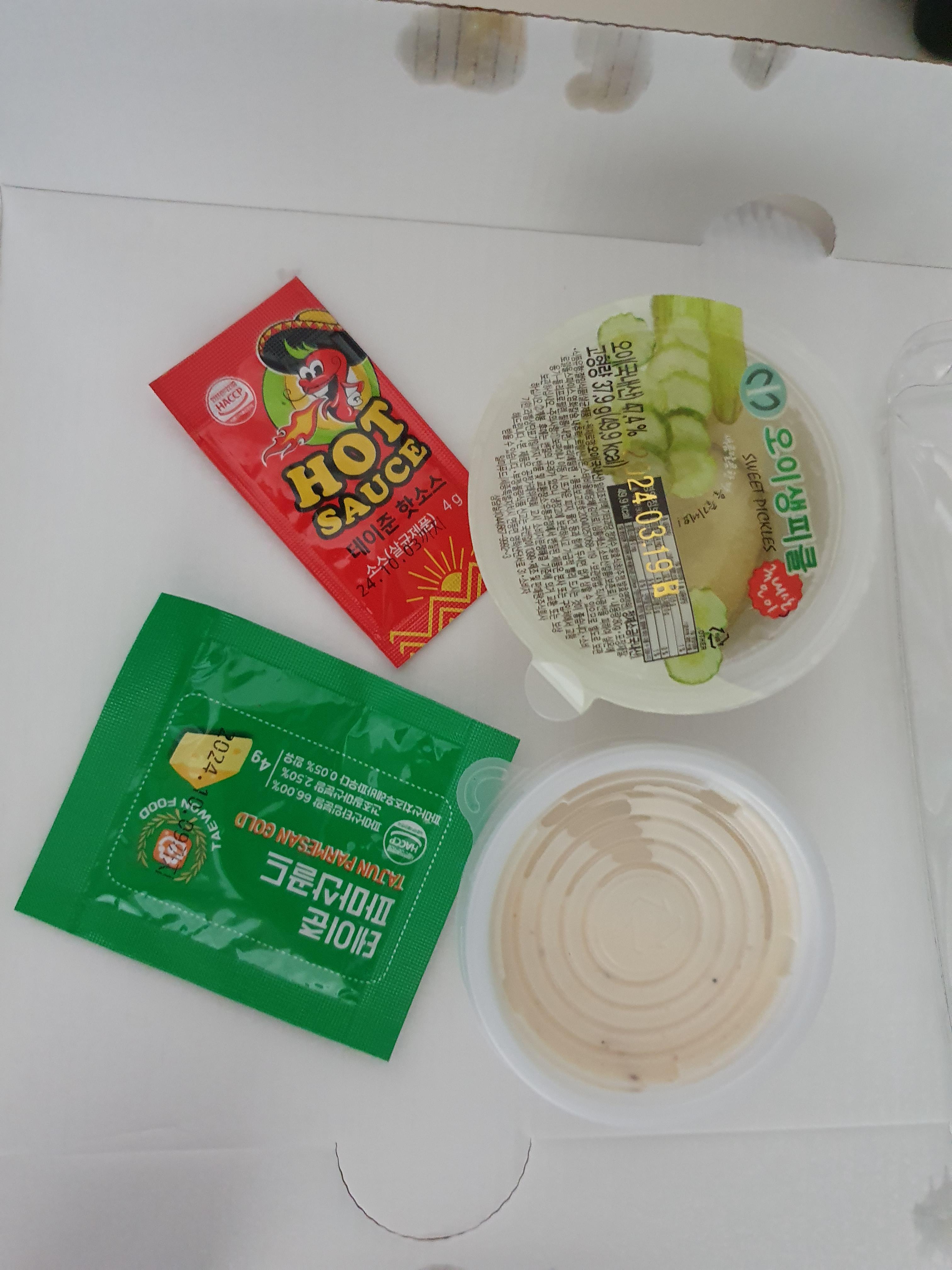 나름 컨셉을 중요시하는 곳인 듯 싶다. 약봉투에 피클, 핫소스 등등 사이드를 넣어서 준다. 뭐가 체크되어있는데 음식 먹으라는 사용법만 적혀있고 다 체크되어있다.