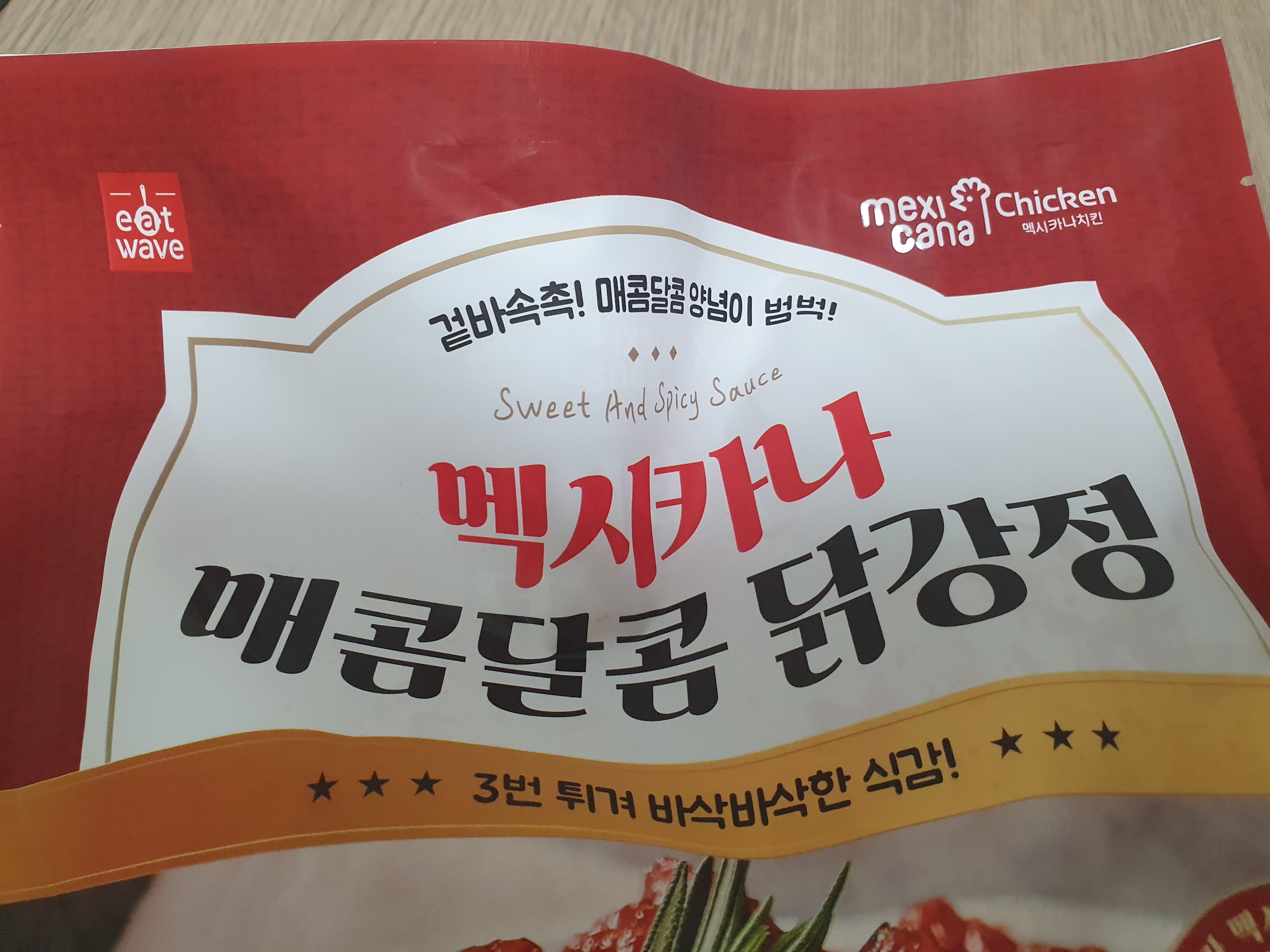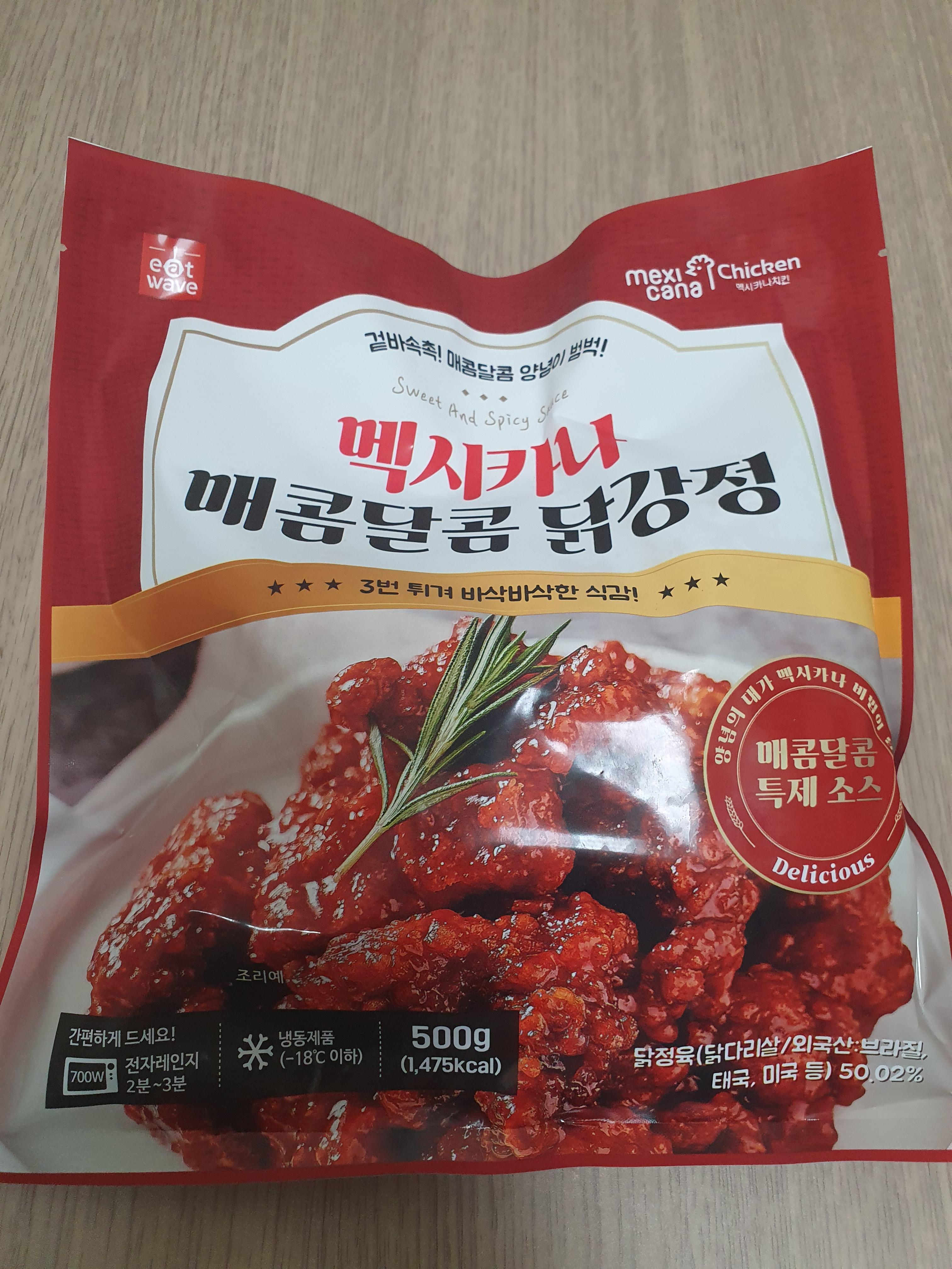 다들 아는 그 멕시카나 치킨 제품이다. 멕시카나 매콤달콤 닭강정인데 그렇게 많이 맵지 않다. 말 그대로 매콤한 정도이다. 막 혀가 매울 정도의 매운맛이 아니라 맛을 위해서 매콤함이 있는 정도라고 보면 된다.