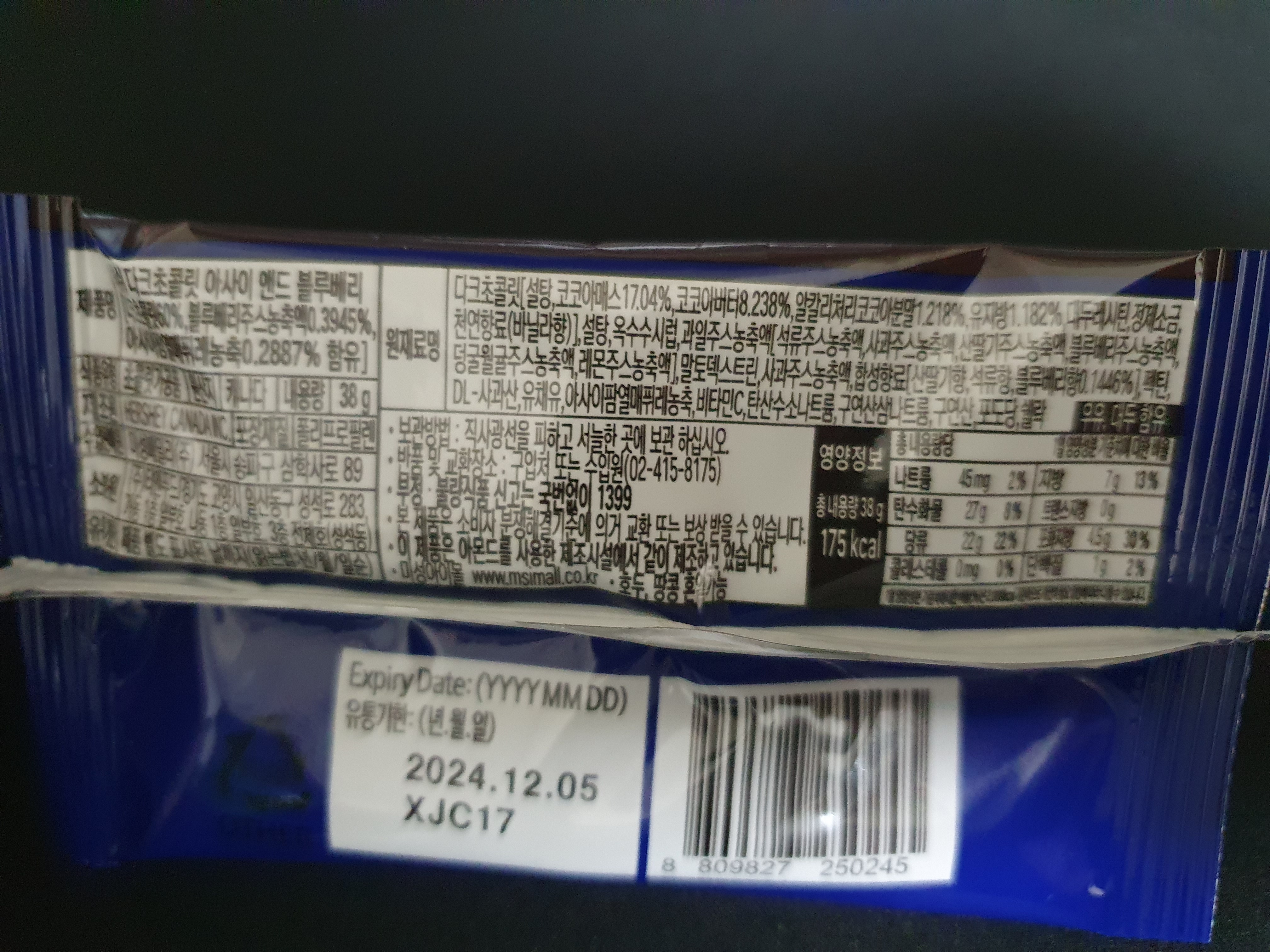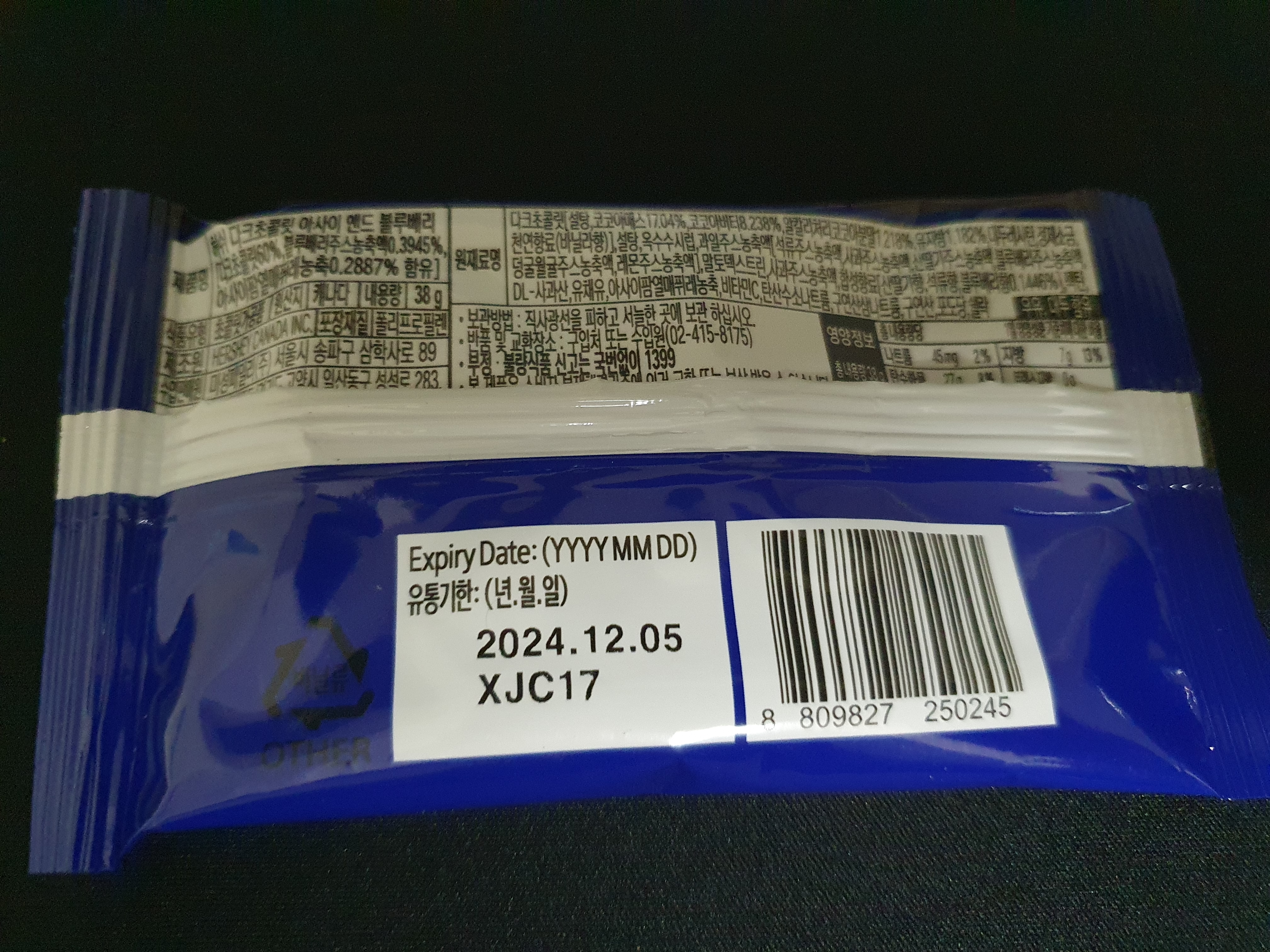 제품명을 제대로 안보고 겉모습만 봐서 이런... 그랬구나... 허쉬 다크초콜릿 아사이 앤드 블루베리이고 다른 맛으로 석류가 있었는데 크흠... 석류를 살 걸 그랬군.