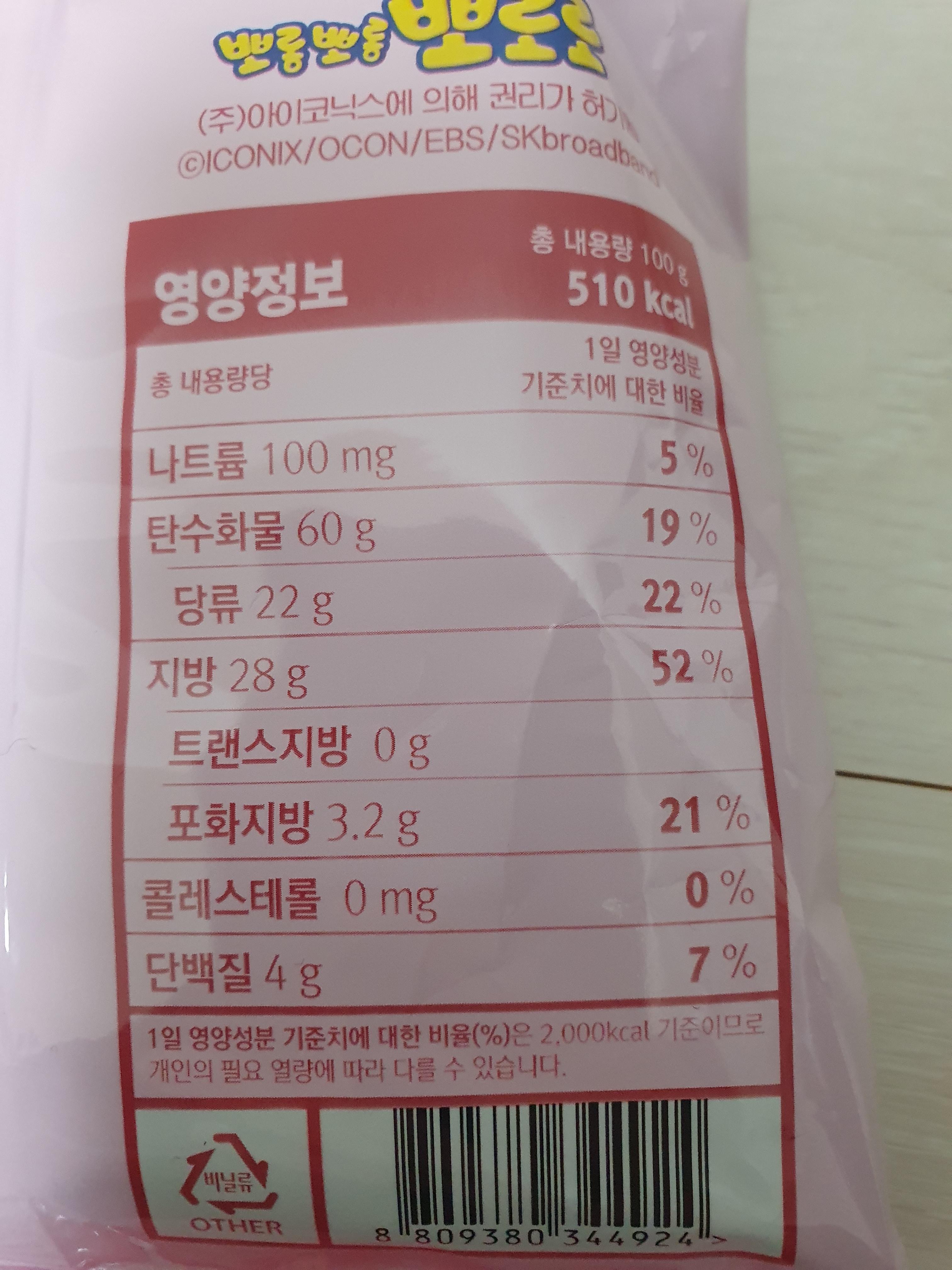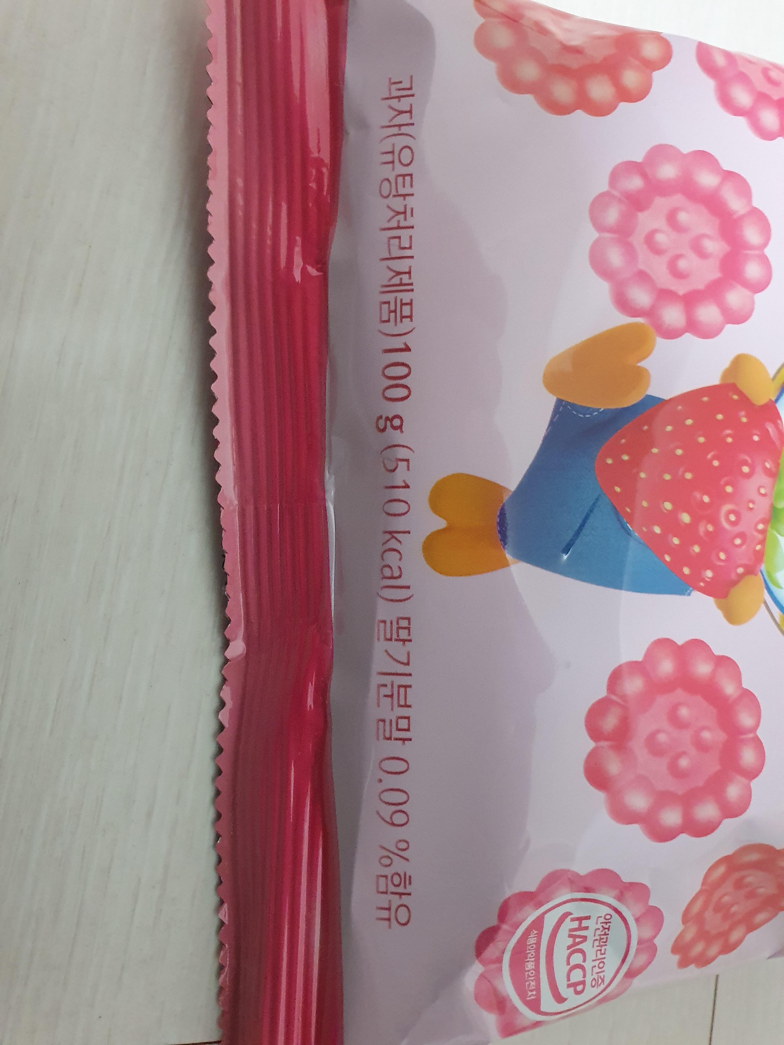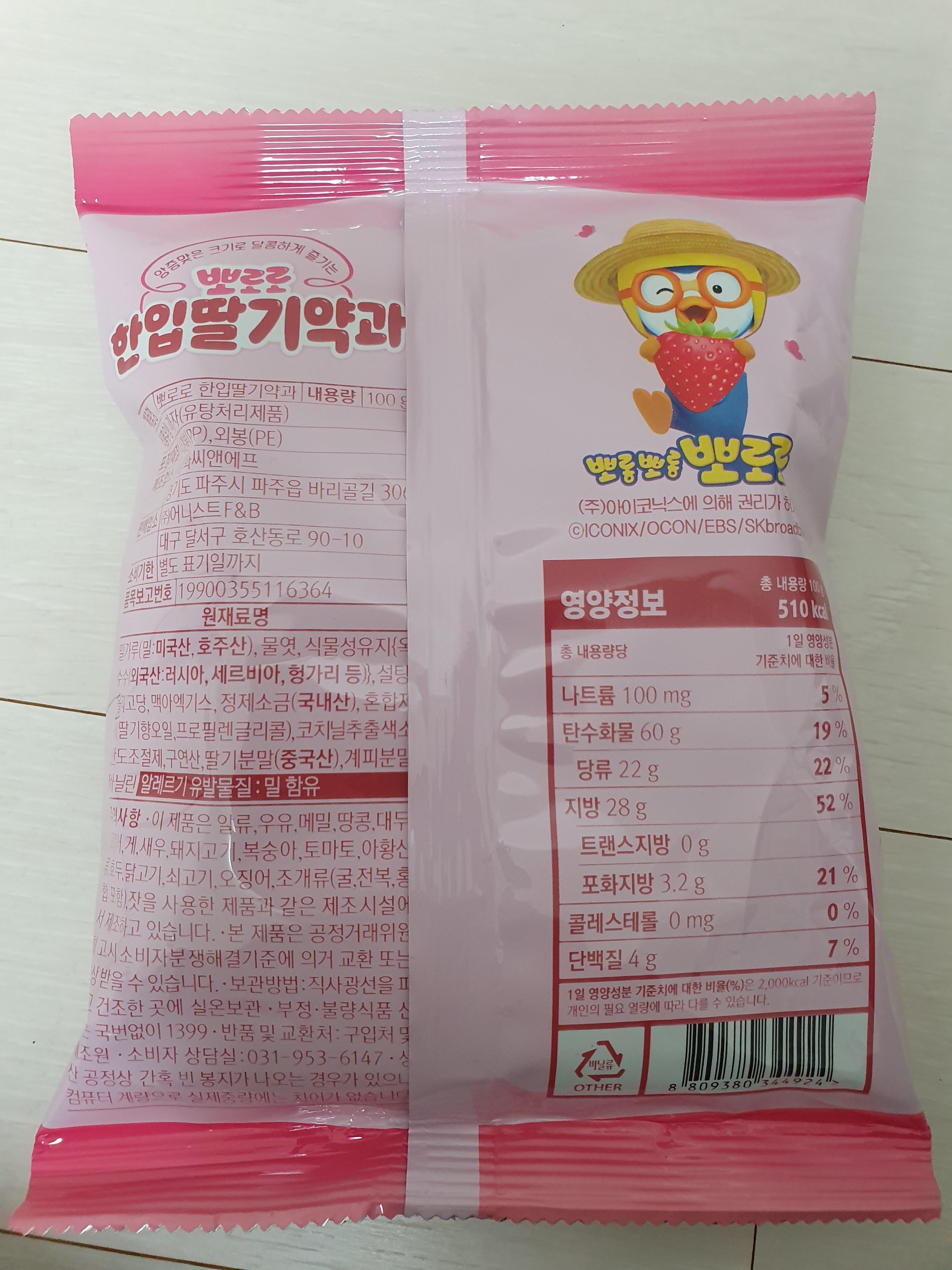 가격은 2000원 정도이고 100g이다. 칼로리는 총 510칼로리이다. 딸기분말은 0.09% 함유되어있다.