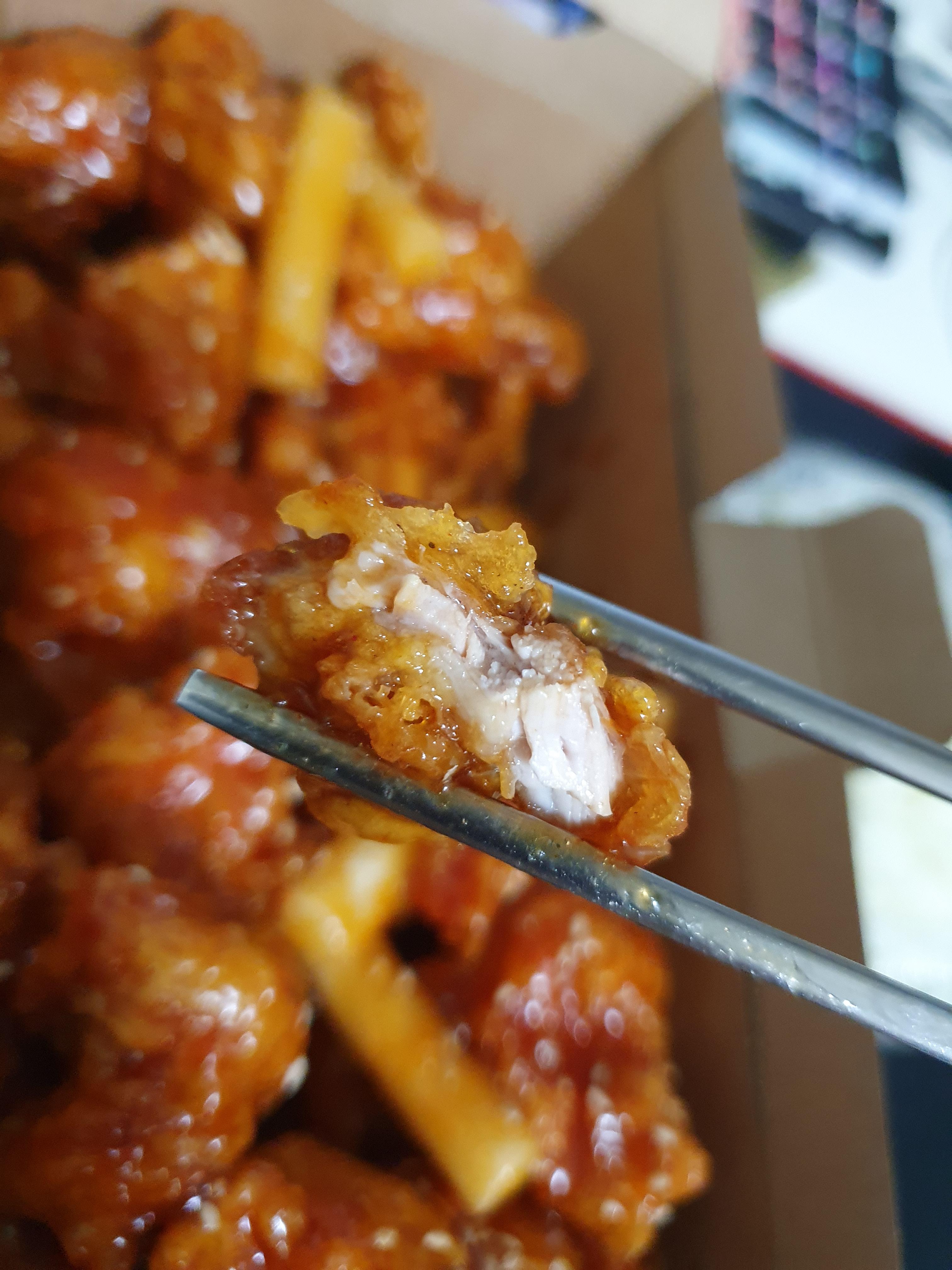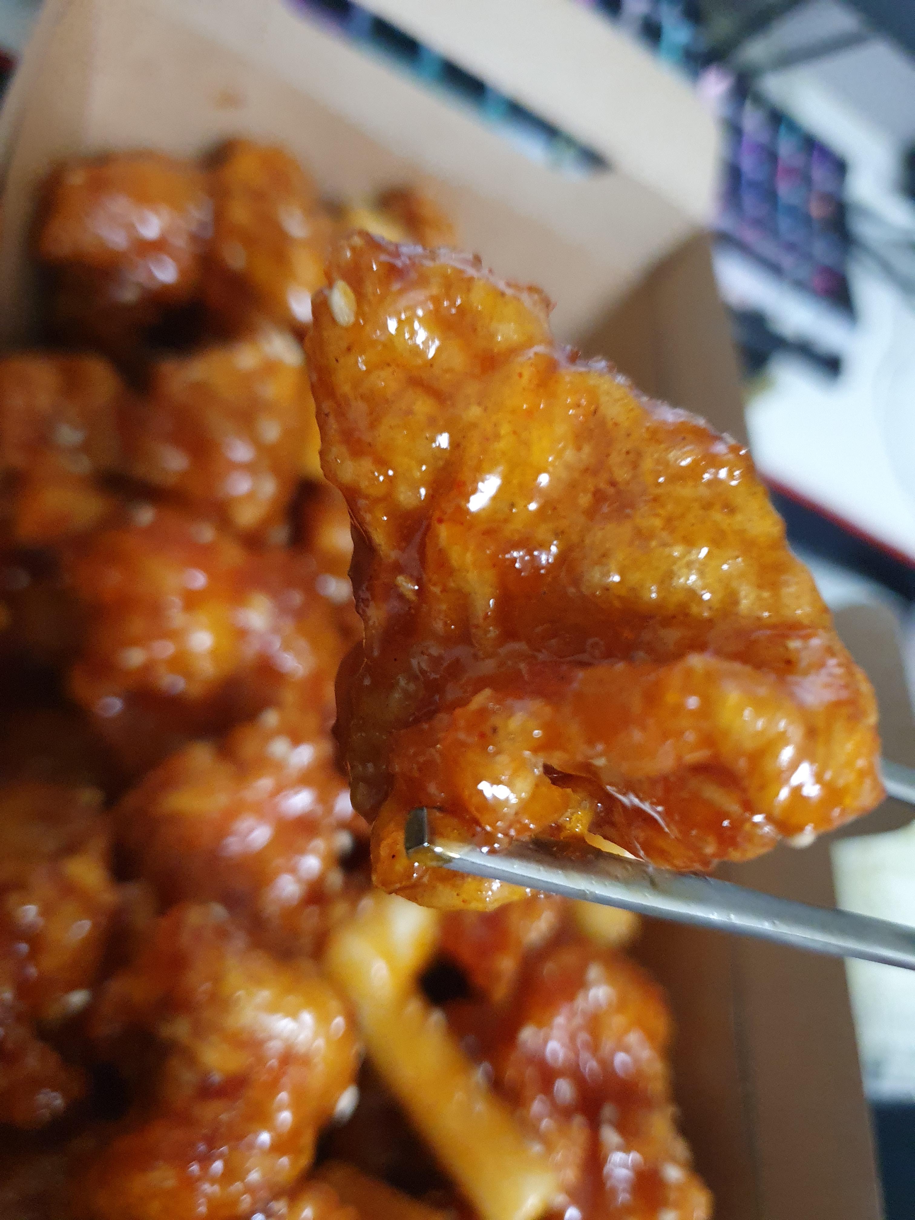 농도가 충분한 수준이라고 보면 되어서 옛날 양념치킨처럼 질척하면서 진한 맛은 충분한, 그런 양념치킨 소스였다. 해서 너무 묽어서 막 머시기한 거 없고 아주 그냥 맛난다.