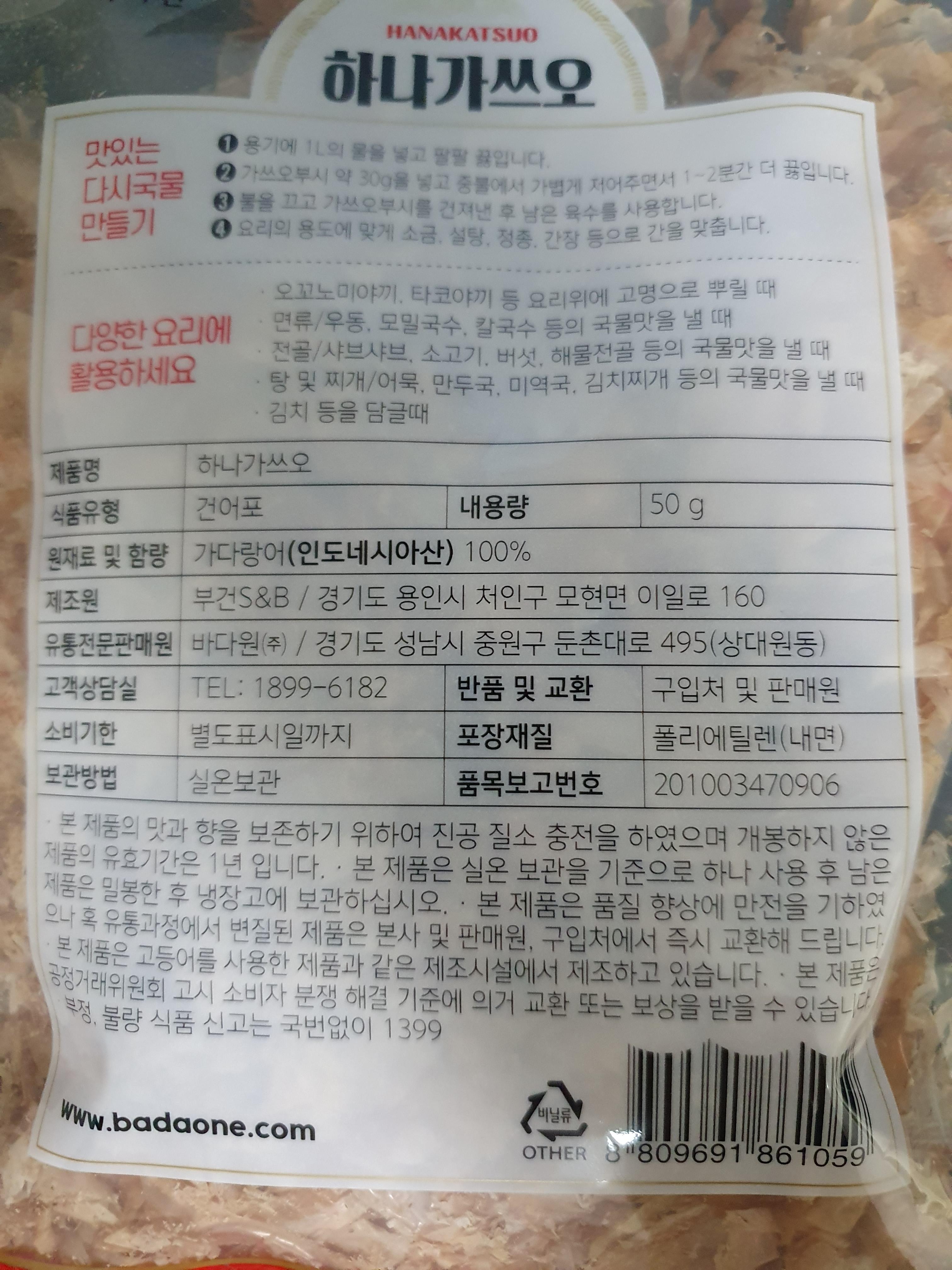국물에도 넣고 요리에 얹어도 먹고 하려고 구입을 했다. 바다원 '하나가쓰오'이고 말 그대로 가쓰오부시이다. 가쓰오부시는 좋은 하는 사람들이 많을텐데 이렇게 직접 구매해서 갖가지 음식들에 얹어먹는 것도 좋은 것 같다.