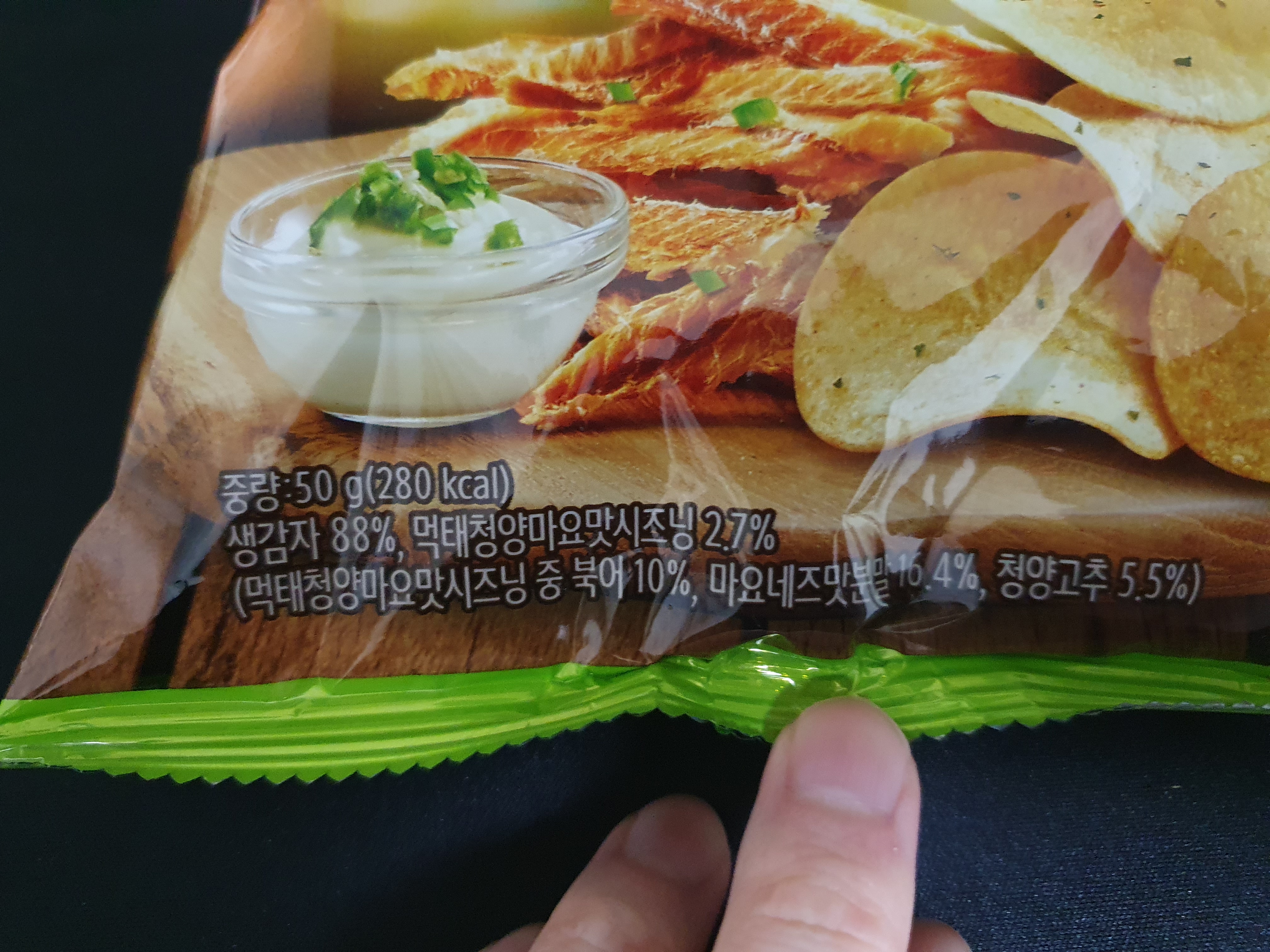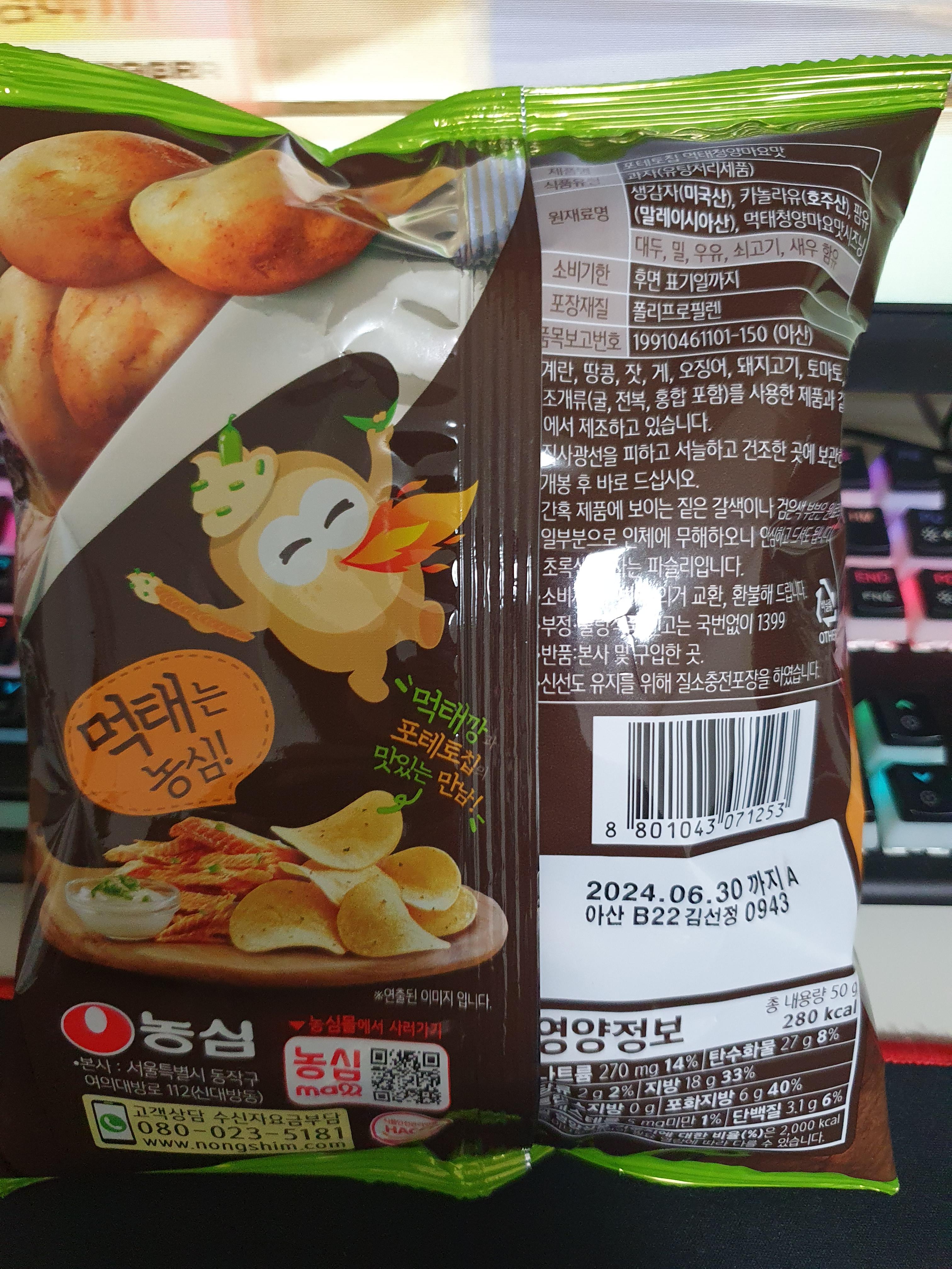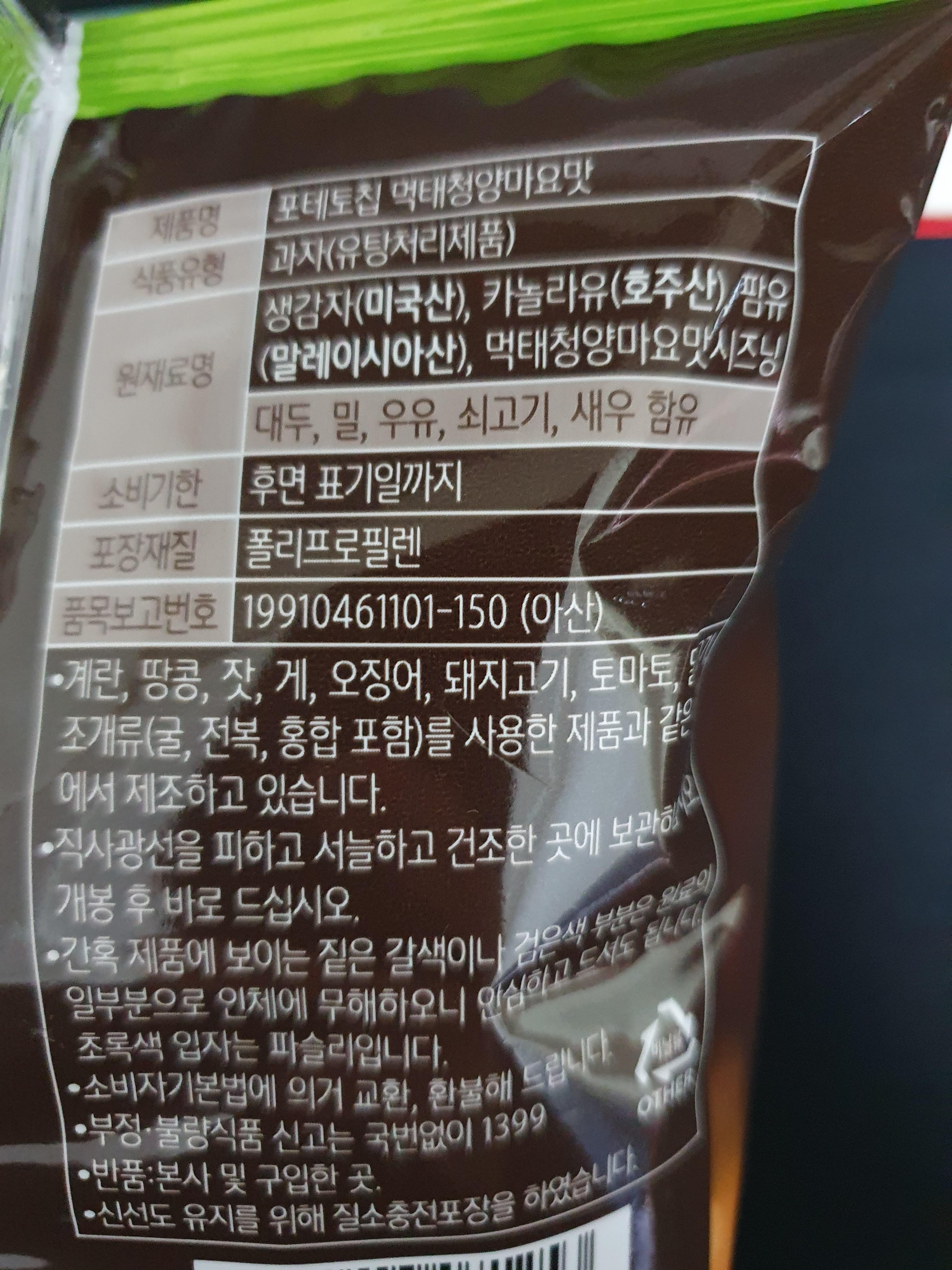 <원재료명> 생감자(미국산), 카놀라유(호주산), 팜유(말레이시아산), 먹태청양마요맛시즈닝