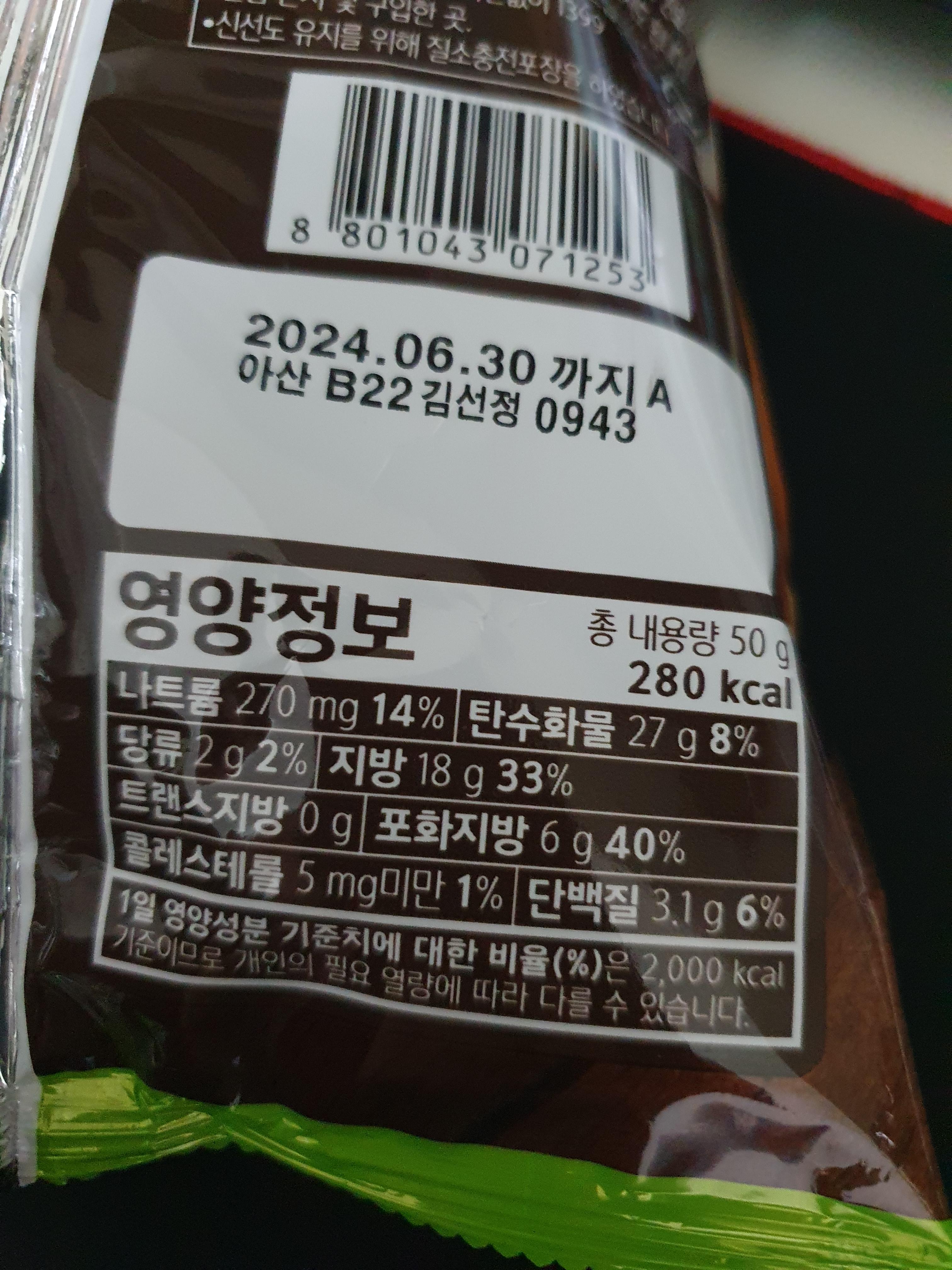 소비기한은 내가 보기에... 대략 10개월 이하? 인 것 같다. 정확히는 모르겠다. 1년은 아닌 것 같은데... 뭐 넘어가고 칼로리는 280칼로리이다. 내용량이 적다보니까 칼로리도 양만큼이다.