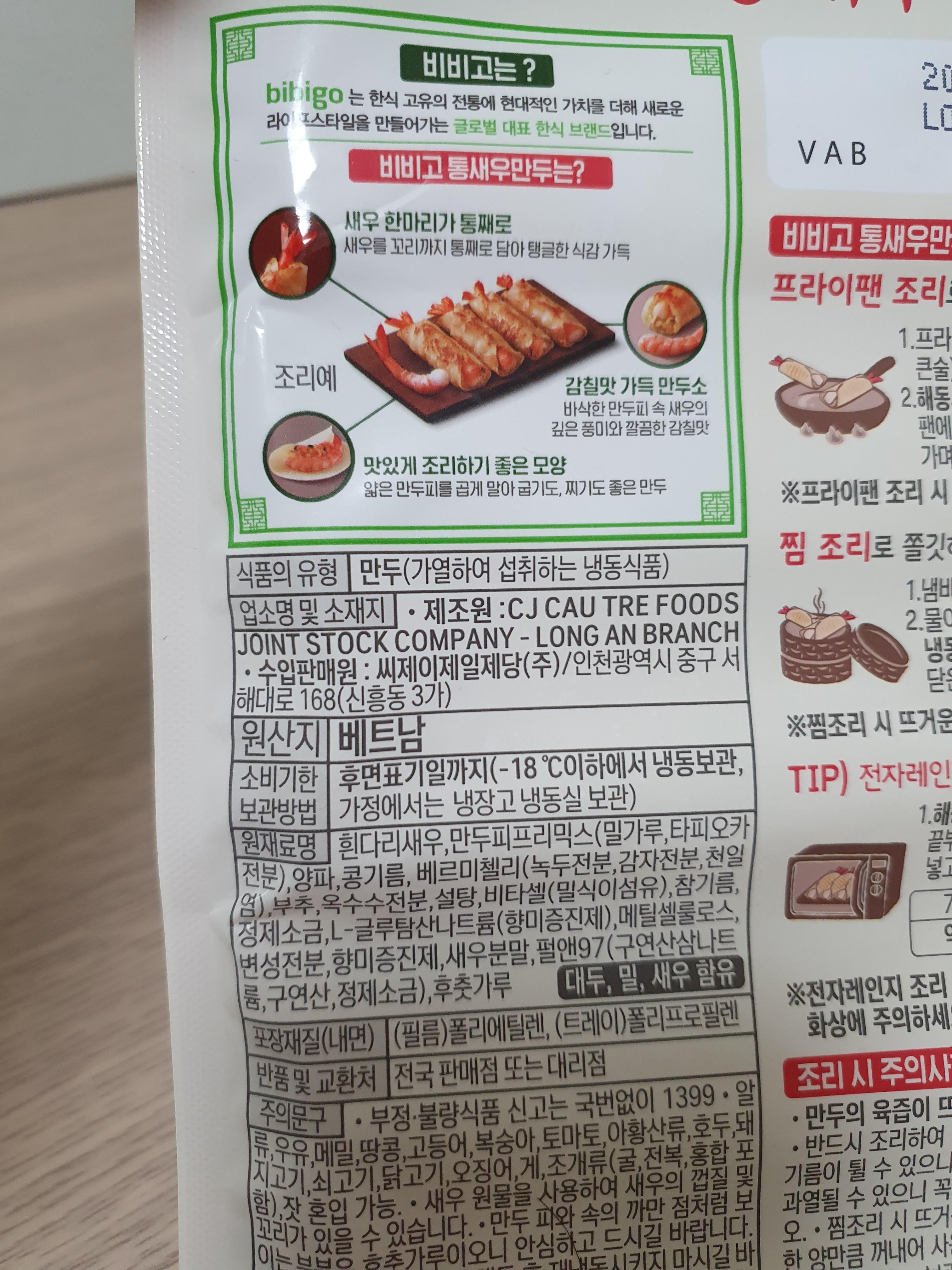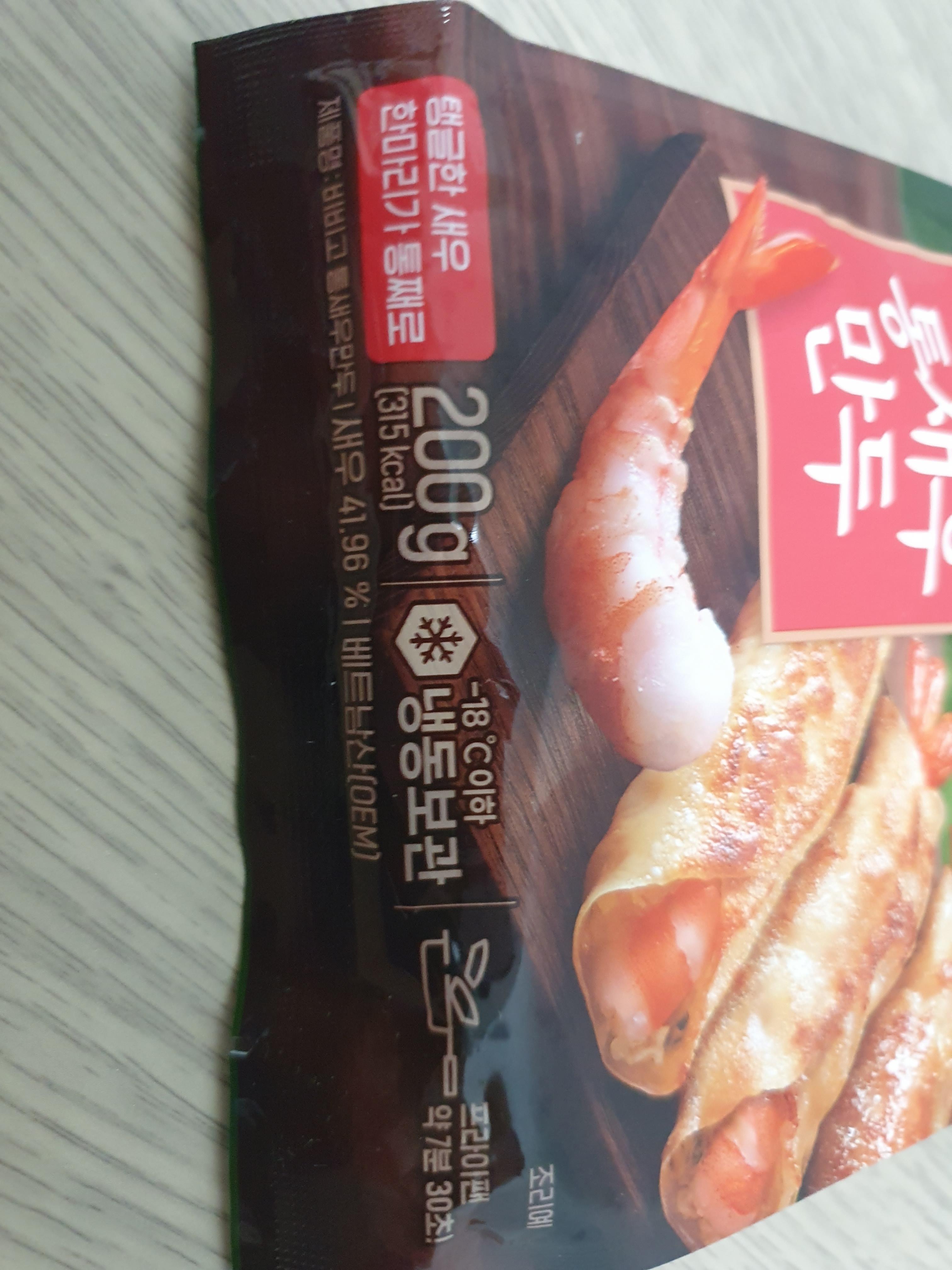 <원재료명> 흰다리새우, 만두피프리믹스(밀가루 타피오카전분), 양파, 콩기름, 베르미첼리(녹두전분 감자전분 천일염), 부추, 옥수수전분, 설탕, 비타셀(밀식이섬유), 참기름, 정제소금, L-굴루탐산나트륨(향미증진제), 메틸셀룰로스, 변성전분, 향미증진제, 새우분말, 펄앤97(구연산삼나트륨, 구연산, 정제소금), 후춧가루