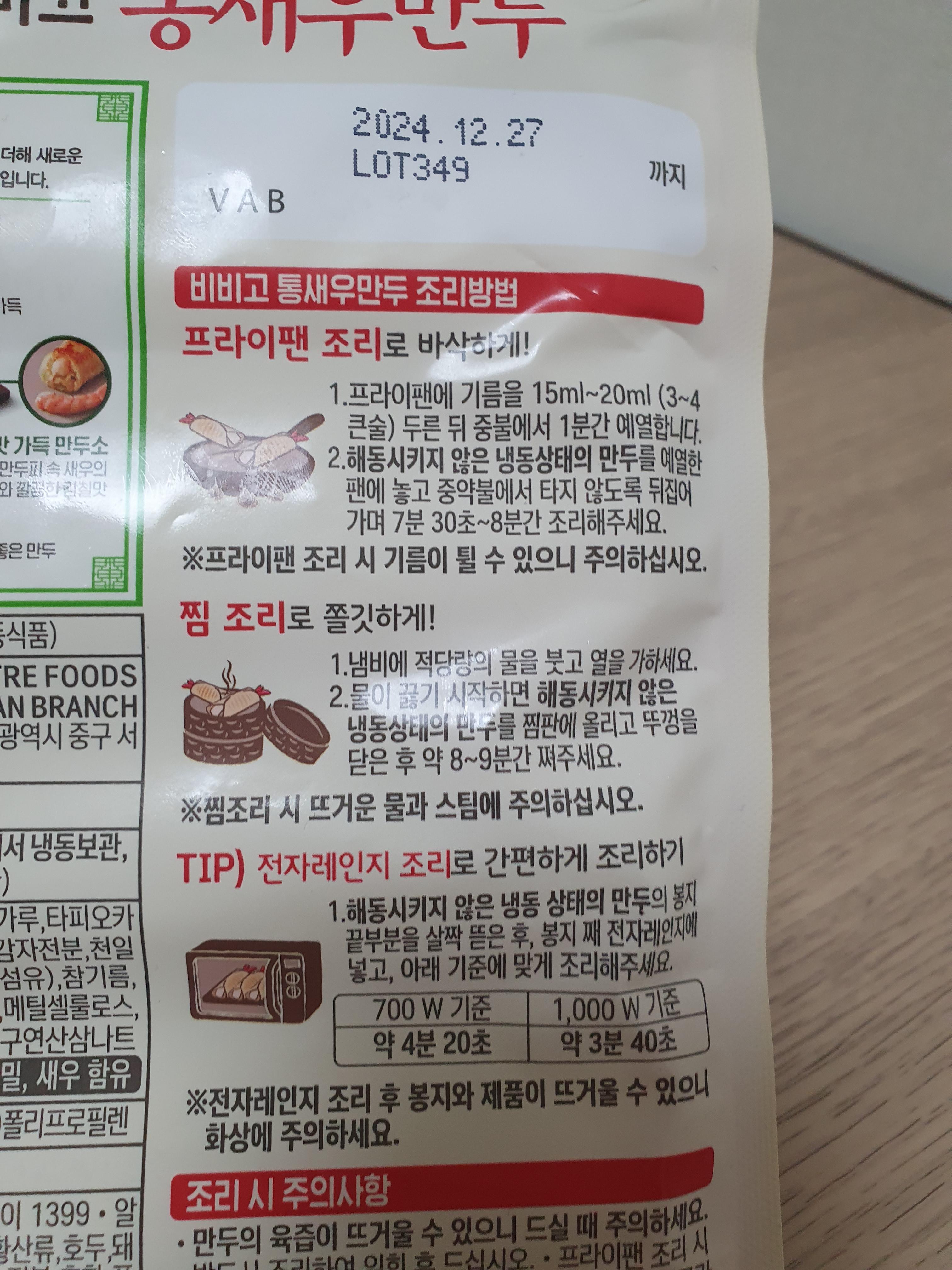 보다시피 프라이팬, 찜, 전자레인지가 조리방법으로 적혀있는데 내 기억에 에어프라이어도 가능한 것으로 기억하는데 잘못 봤나?... 아아 맞네... 구매 리뷰보니까 에어프라이어로 조리했단 사람들 많이 보인다. 근데 내가 해본 건 아니니 일단 패스.