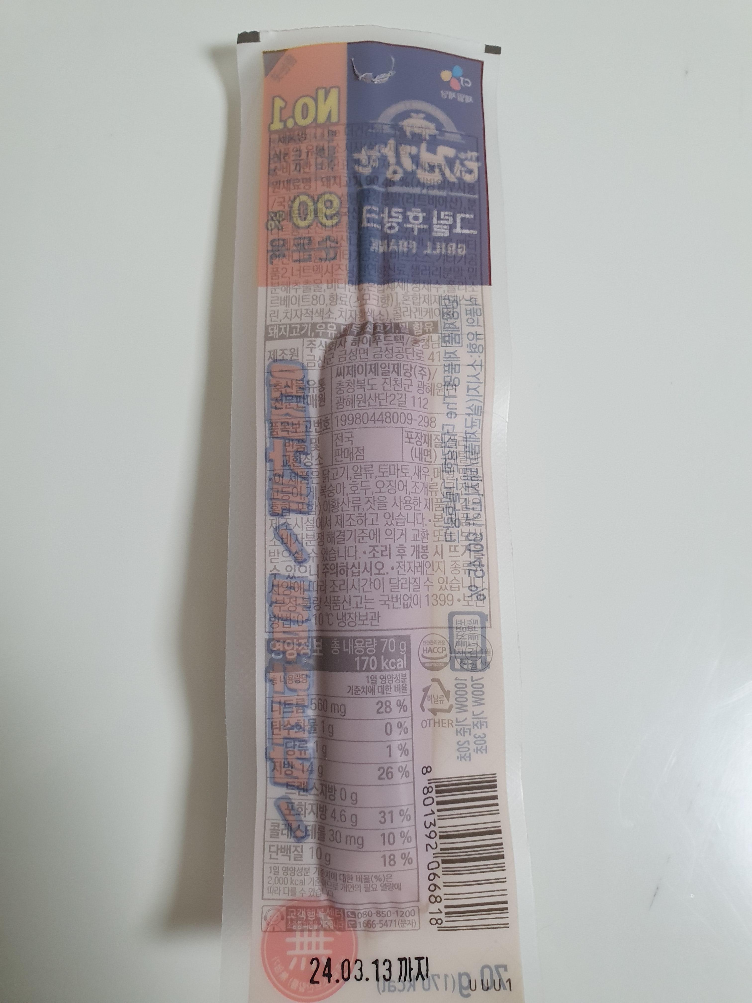 내용량 70g에 170칼로리이다. 재구매의사 있는데 2500원이라... 맛은 좋긴 하다만, 솔직히 가격적으로 이럴 바엔 그냥 핫바 말고 꼬치 없는 후랑크로 구매하는 게 더 낫겠단 생각이 드는 건 어쩔 수가 없다.