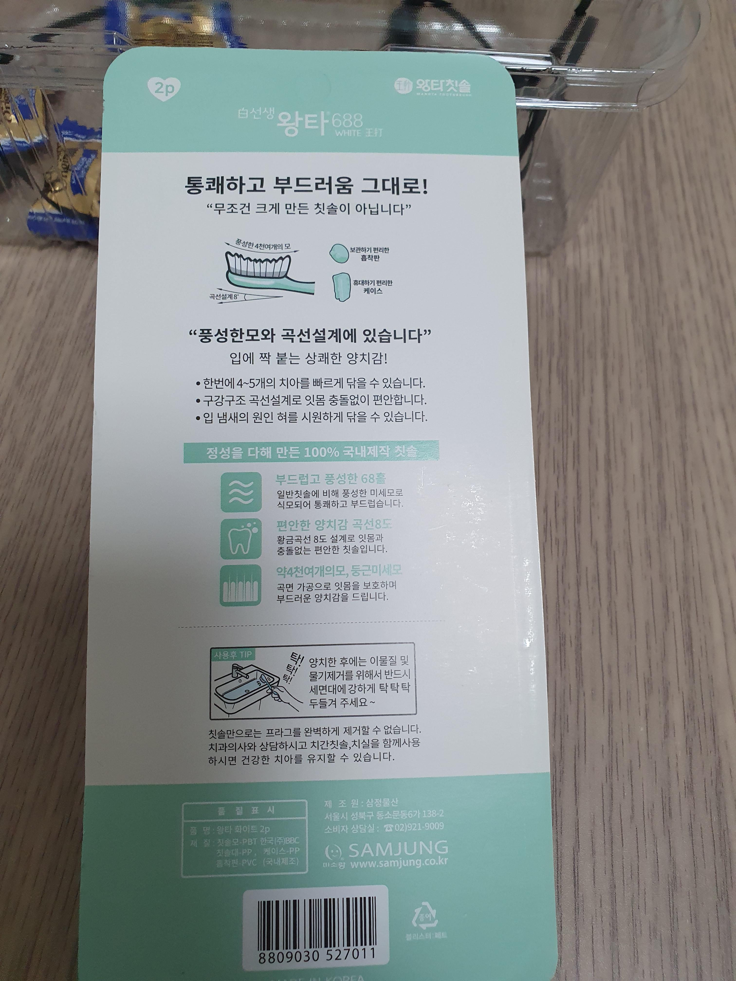 아하, '삼정물산' 제품인갑네. 아무튼 내가 구입한 건 '왕타 화이트 칫솔'이다. 이외로 정보를 살펴보면... 칫솔모가 4천여 개 있고 어? '곡선설계'였네. 몰랐다...