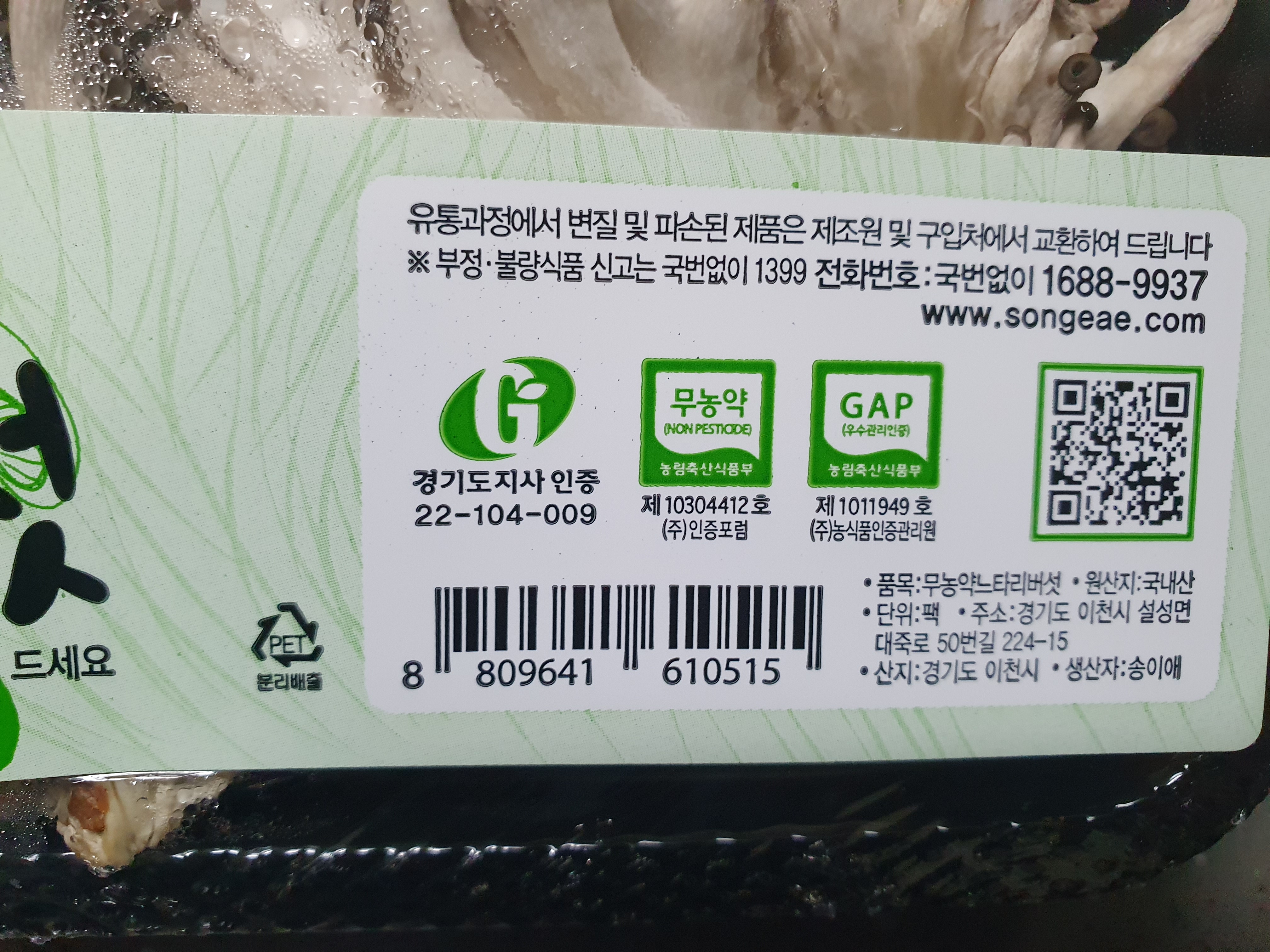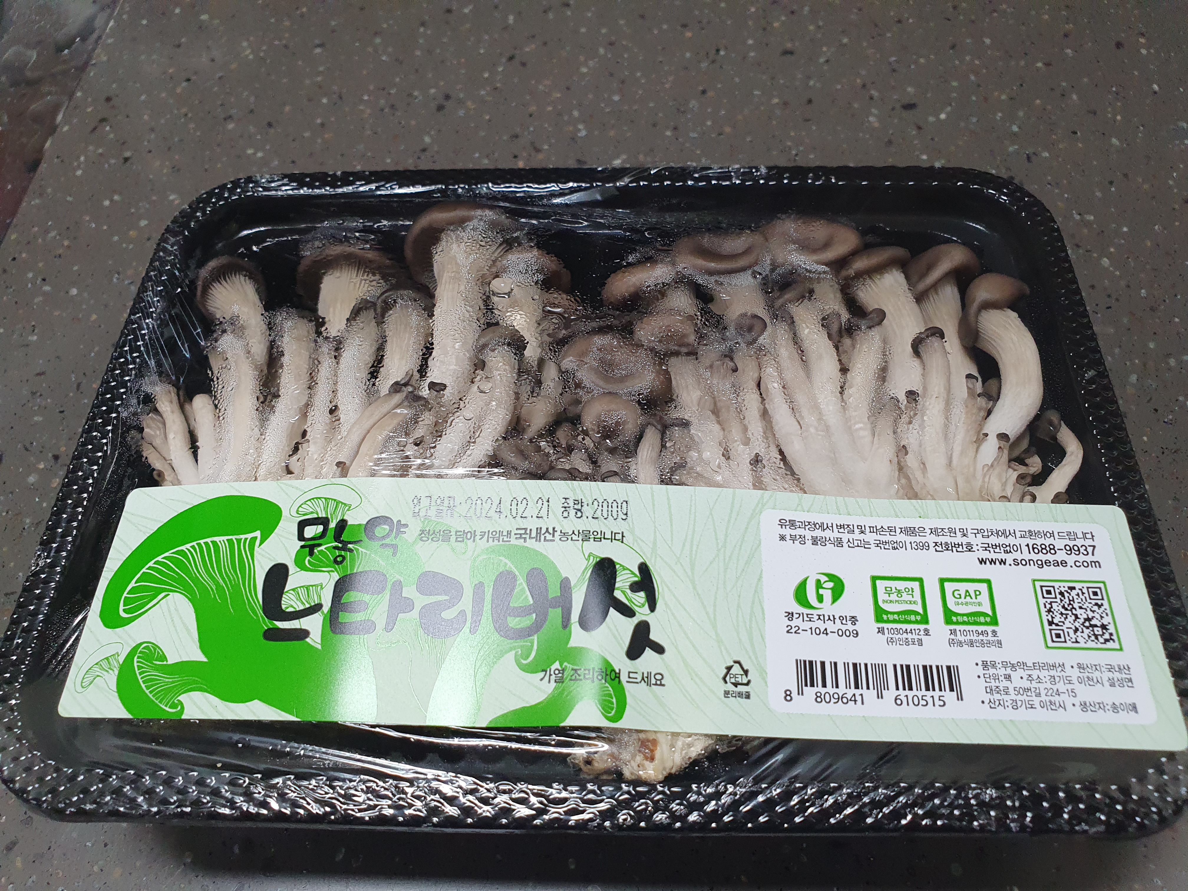 '송이애 무농약 느타리버섯 200g'이고 가격은 1900원 정도한다. 느타리버섯이 이게 은근히 양이 많아서 된장찌개 두 번 끓일 동안 아주 풍족하게 잘 먹었다.