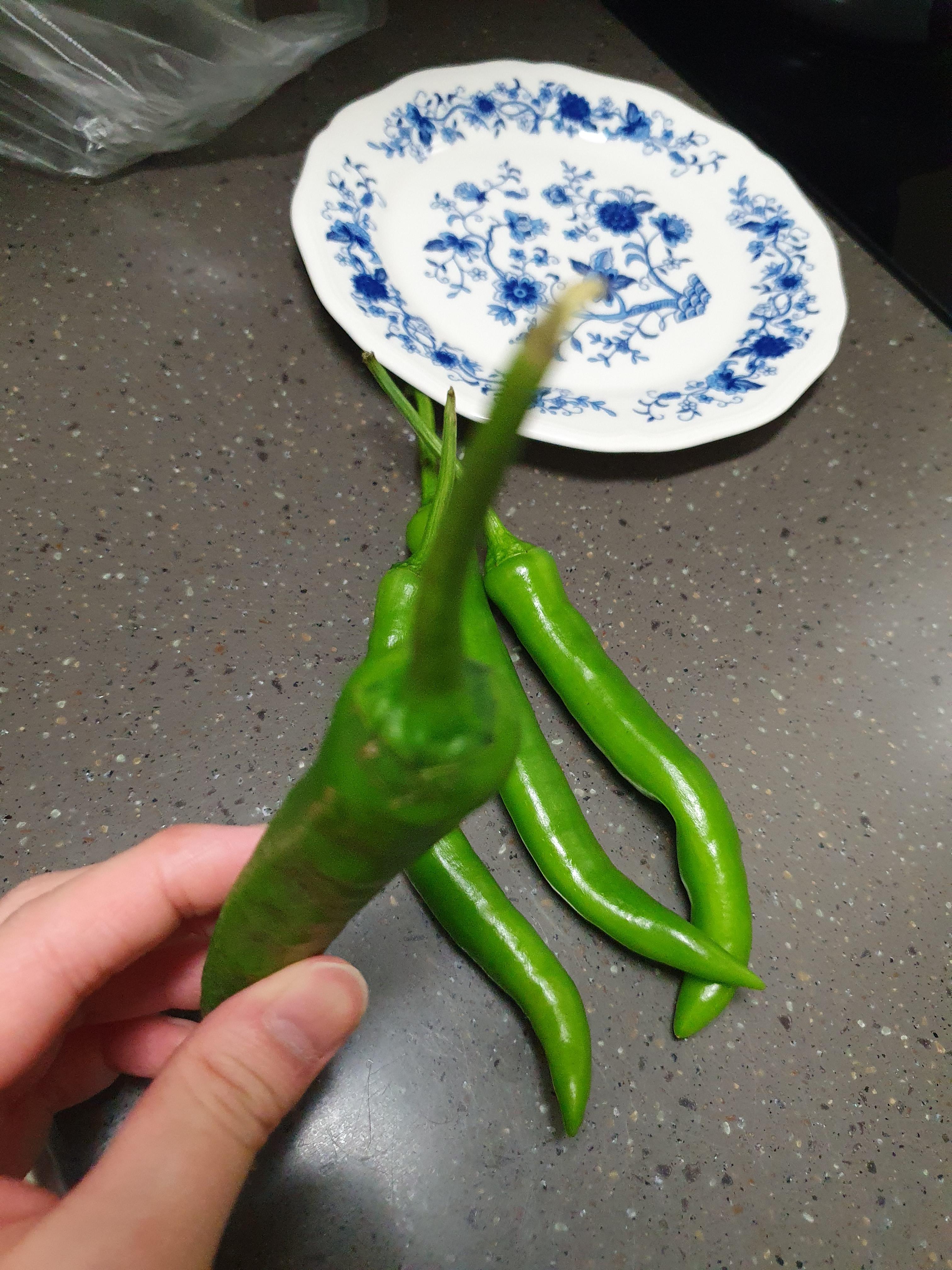 작은 고추는 아니고 보통 사이즈의 고추로 보면 될 것 같다. 적당한 크기이고 싱싱했고 탱글했다. 다만 좀 질긴 건 있긴 했다. 아주 아삭한 느낌은 아니고 아삭하긴 한데 완전 만족감 빵빵한 아삭아삭함은 아니었다.