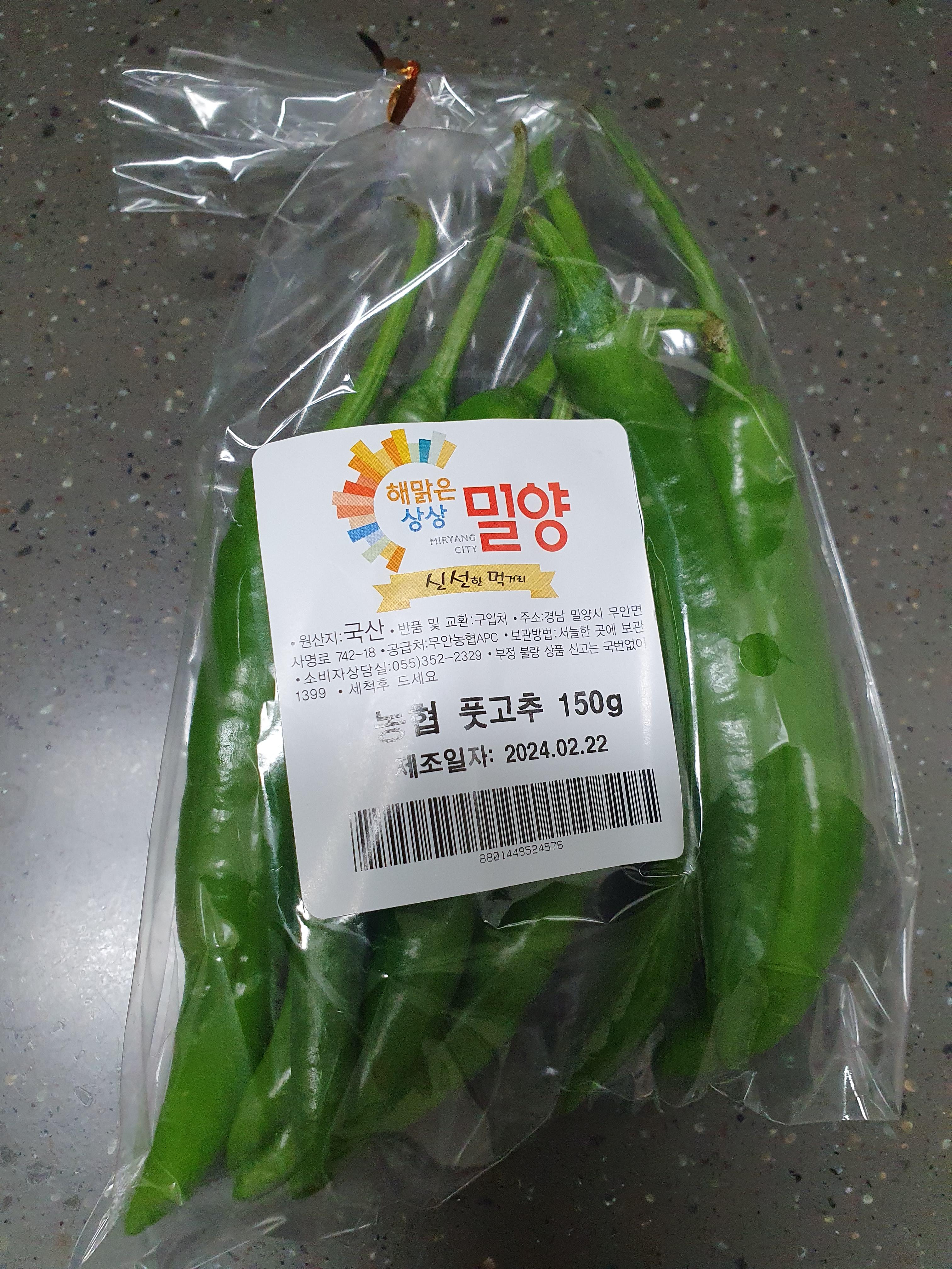 밀양 풋고추인데 앞에 농협이 붙어있긴 하다만, 그냥 '밀양 풋고추'라고 하겠다. 150g으로 구매를 했고 풋고추라서 여러개 들어있긴 하다.