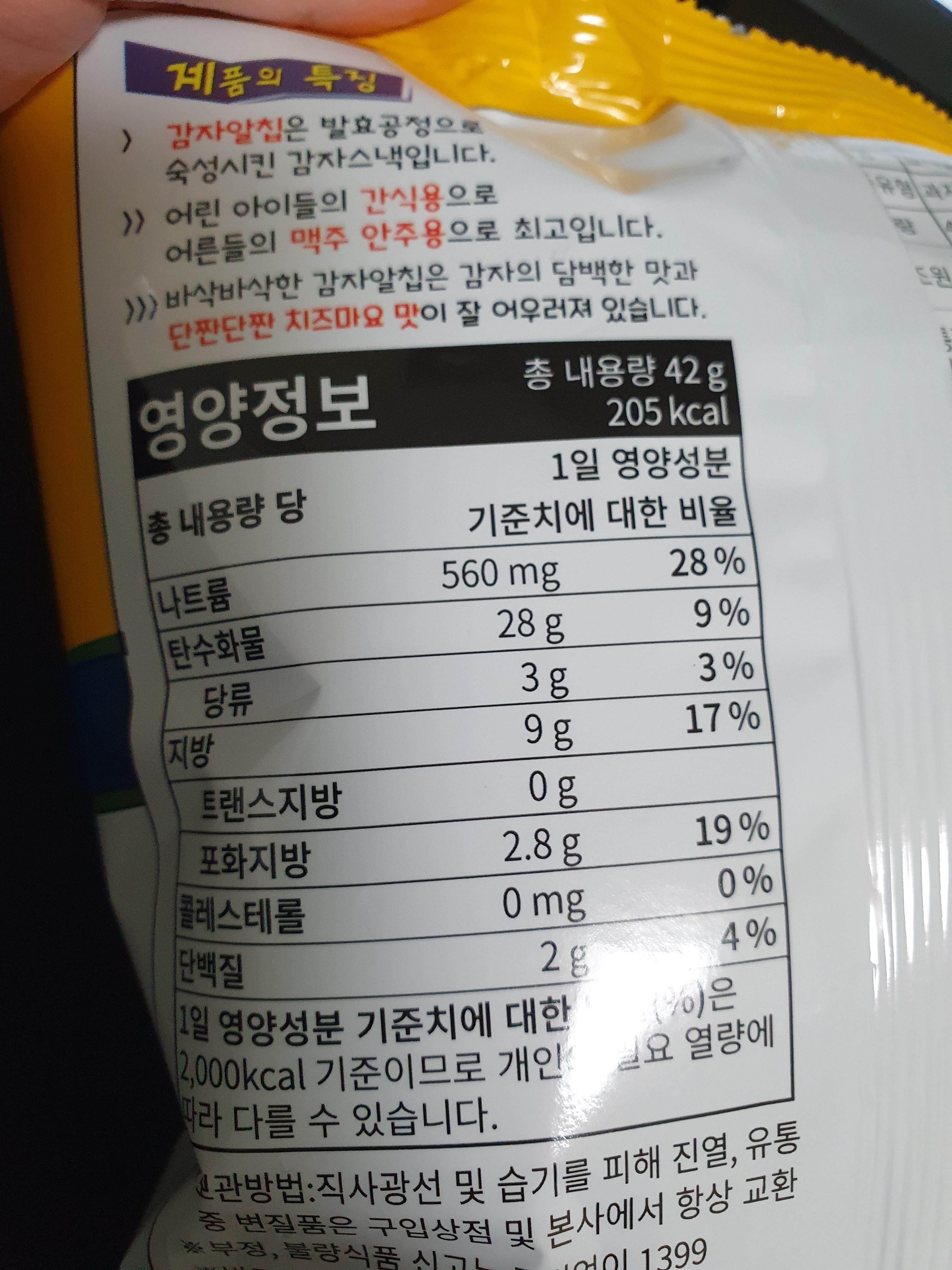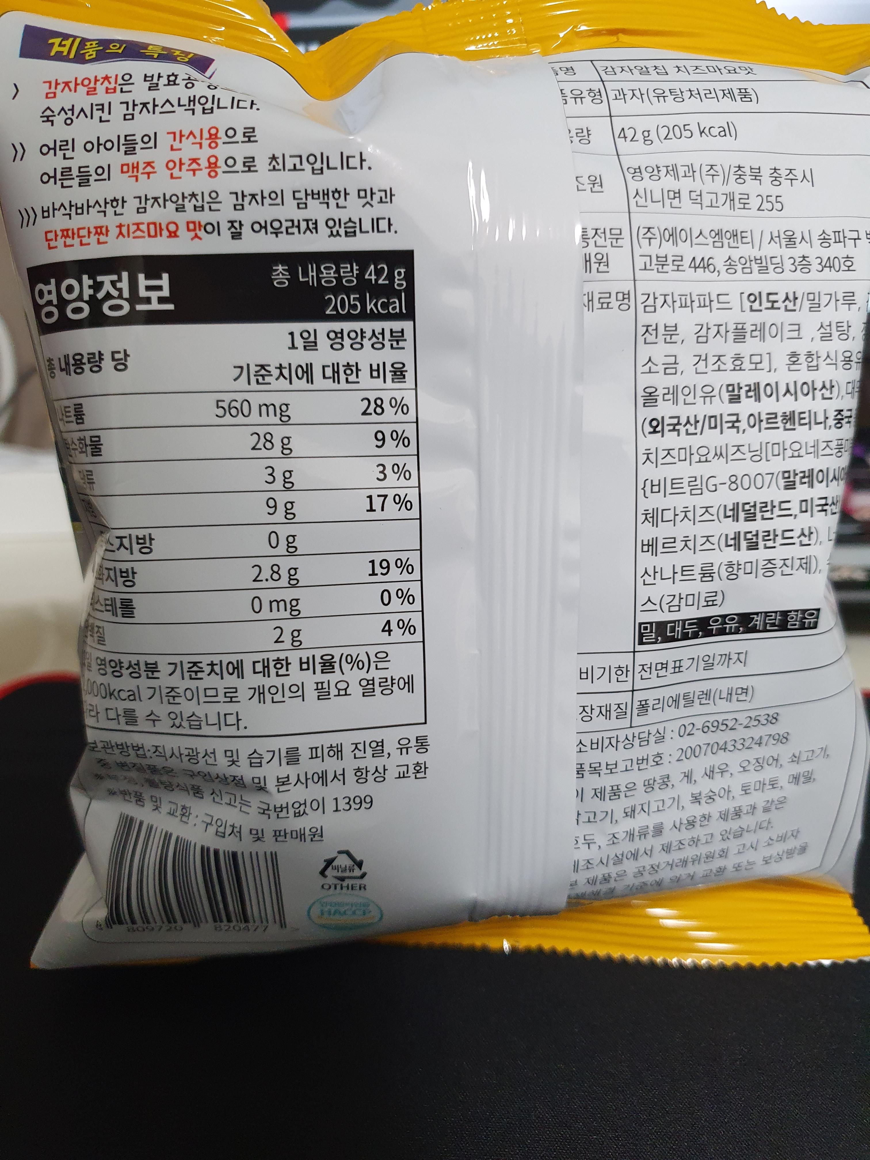 나쁘지 않다. 나쁘지 않은데... 또, 맛도 괜찮다. 식감도 아주 바삭하니 좋았다. 감자알칩은 치즈마요맛하고 볶음고추장맛이 있는데 내가 먹어본 건 치즈마요맛이다.