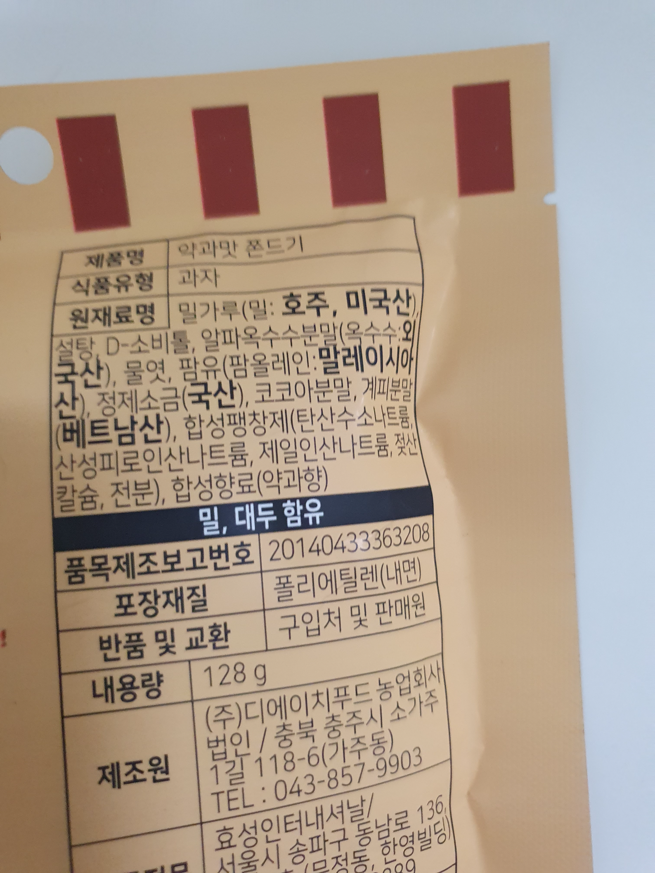{원재료명} 밀가루(호주산 미국산 밀), 설탕, D-소비톨, 알파옥수수분말(외국산 옥수수), 물엿, 팜유(말레이시아산 팜올레인), 정제소금(국산), 코코아분말, 계피분말(베트남산), 합성팽창제(탄산수소나트륨, 산성피로인산나트륨, 제일인산나트륨, 젖산, 칼슘, 전분), 합성향료(약과향)