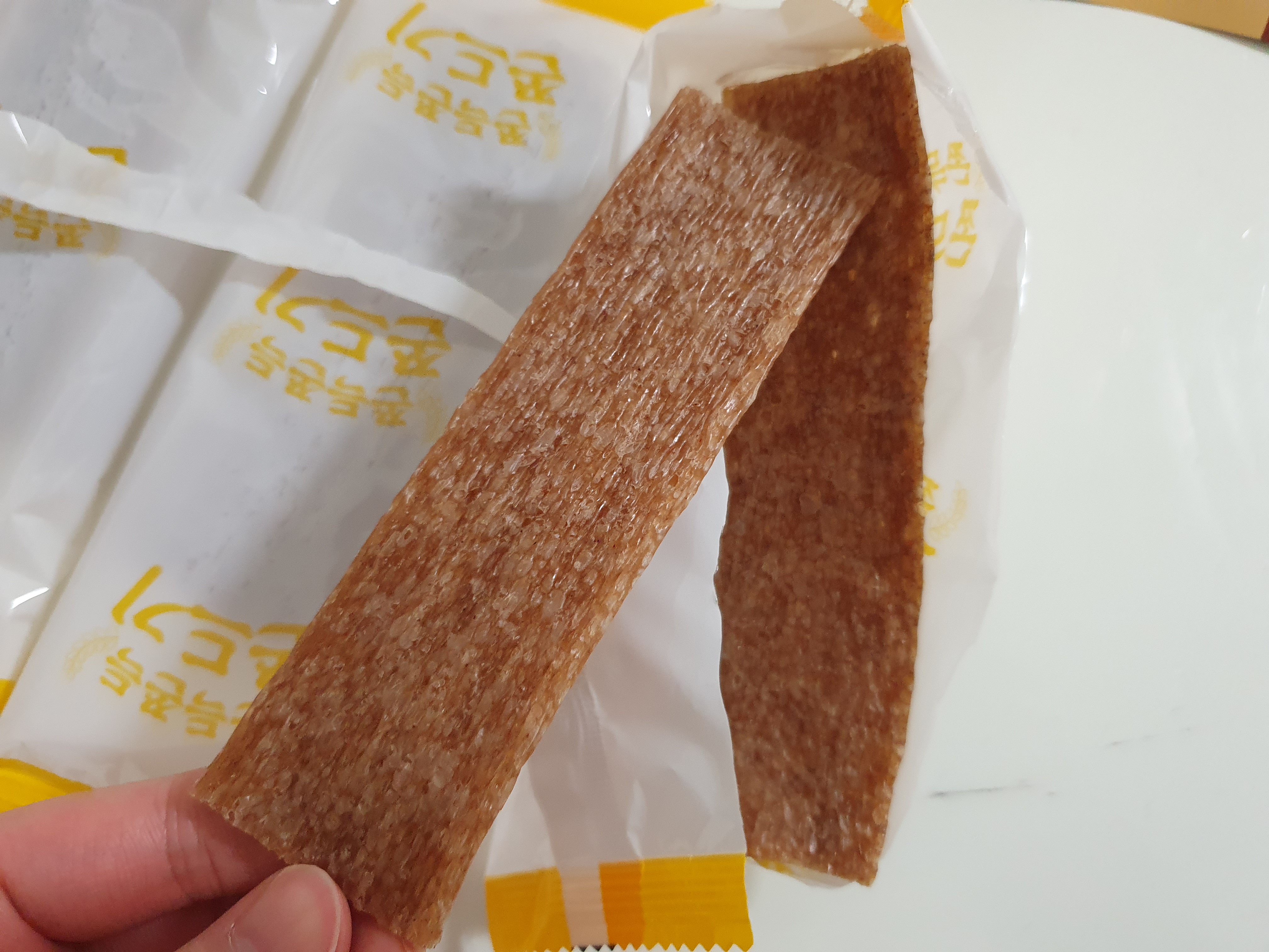 약과의 맛은 정말 살짝? 있는 정도이고 거의 계피맛이라 해야하나... 좀... 흑설탕+계피 살짝 같은 맛? 방금 말했듯이 맛이 없는 건 아니고 맛있다. 근데 굳이 비교하면 똑같이 무직타이거 쫀드기 중에 호박맛 보다는 좀 아쉬운 건 사실이었다.