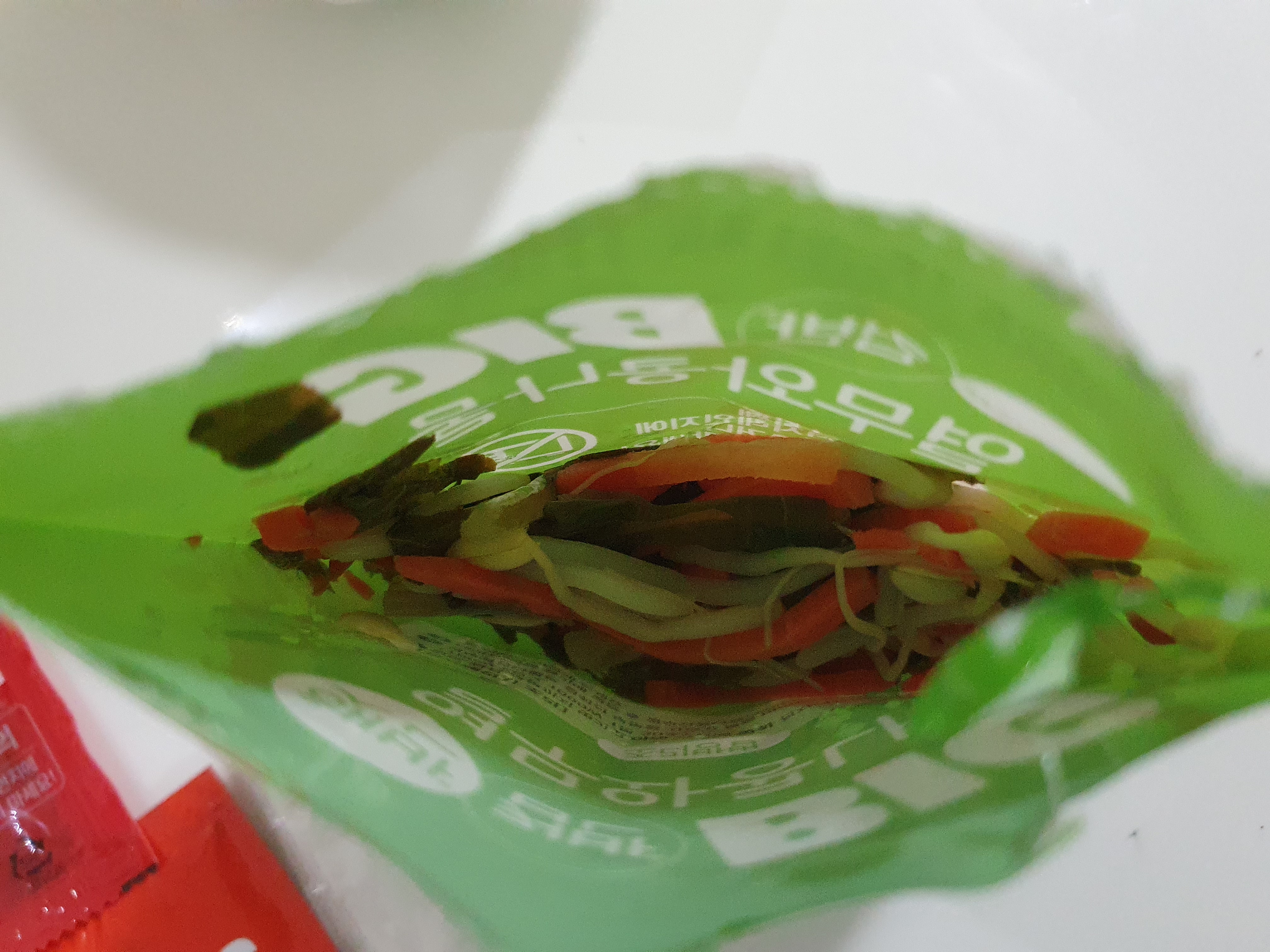 야채는 국물이 많아서 국물을 버려야했다. 봉지에도 '열무와콩나물의 물은 완전히 버려주세요.'라고 친절하게 적혀있다.