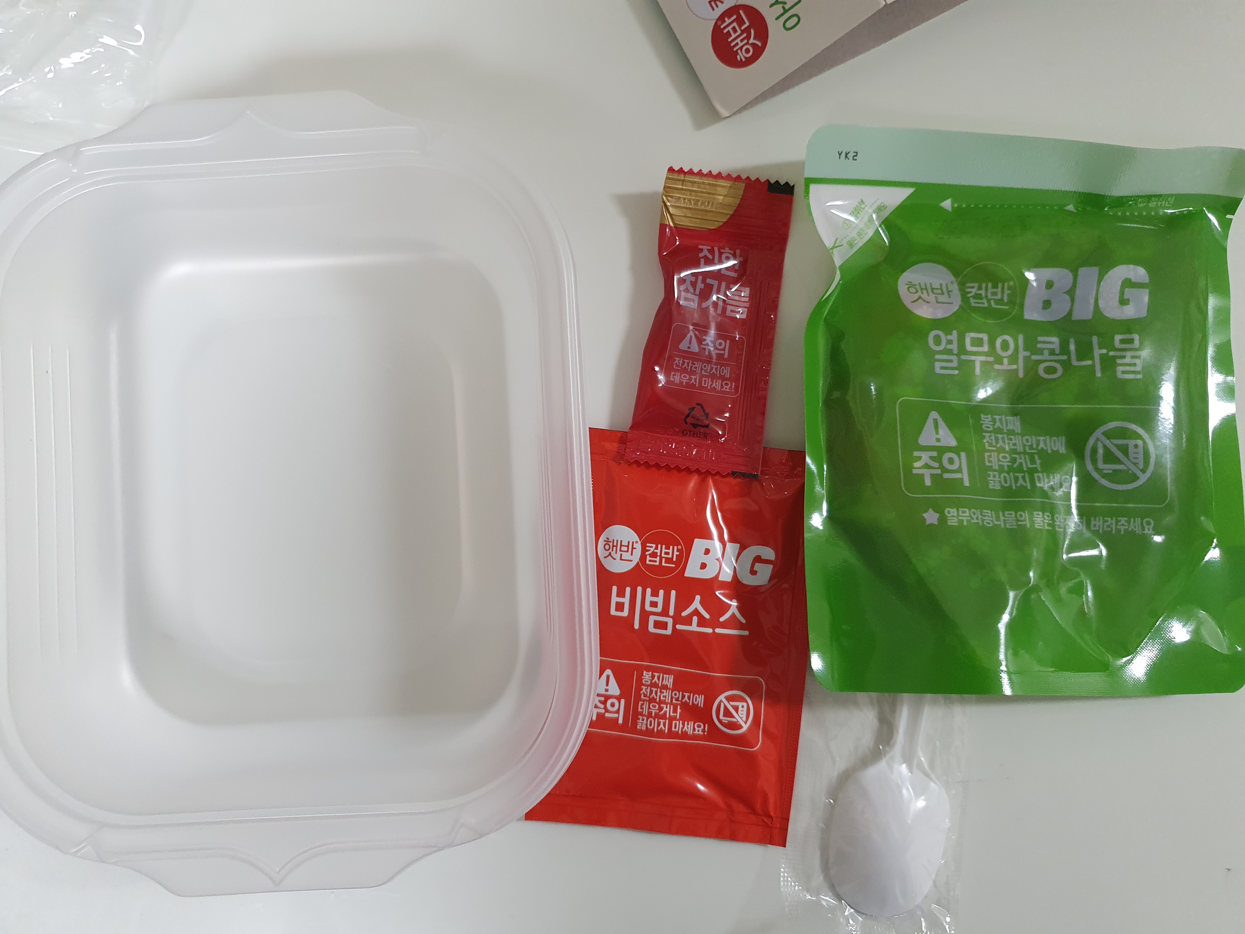 구성품은 보다시피 비벼먹을 수 있는 용기하고 건더기, 비빔소스, 참기름, 미니숟가락이 들어있다. 전자렌지만 있으면 간편히 바로 먹을 수 있는 인스턴트 비빔밥 구성이다.