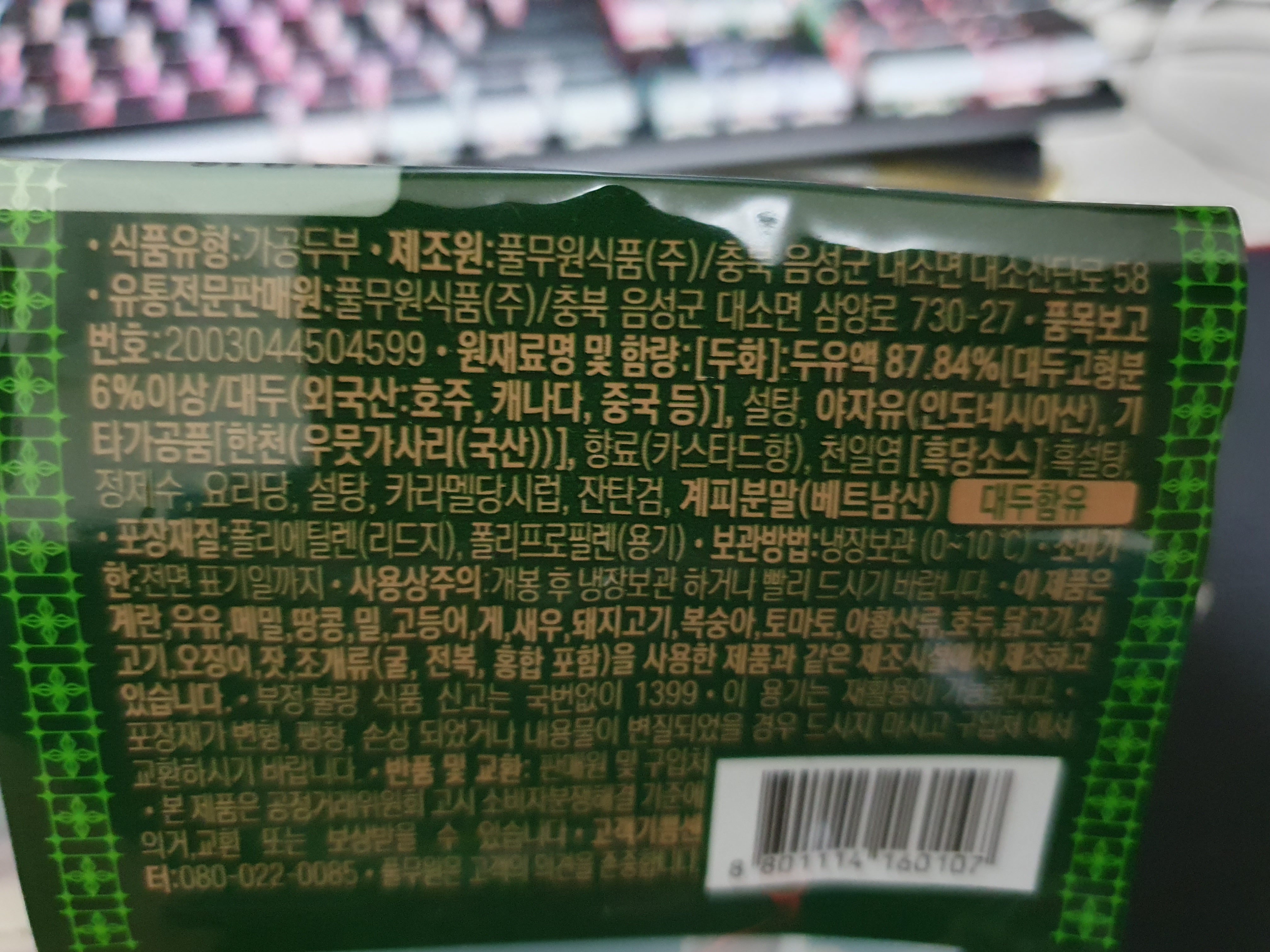 [원재료명] 두화(두유액 87.84%), 설탕, 야자유, 기타가공품(한천), 향료(카스타드향), 천일염(흑당소스:흑설탕, 정제수, 요리당, 설탕, 카라멜당시럽, 잔탄검, 계피분말)