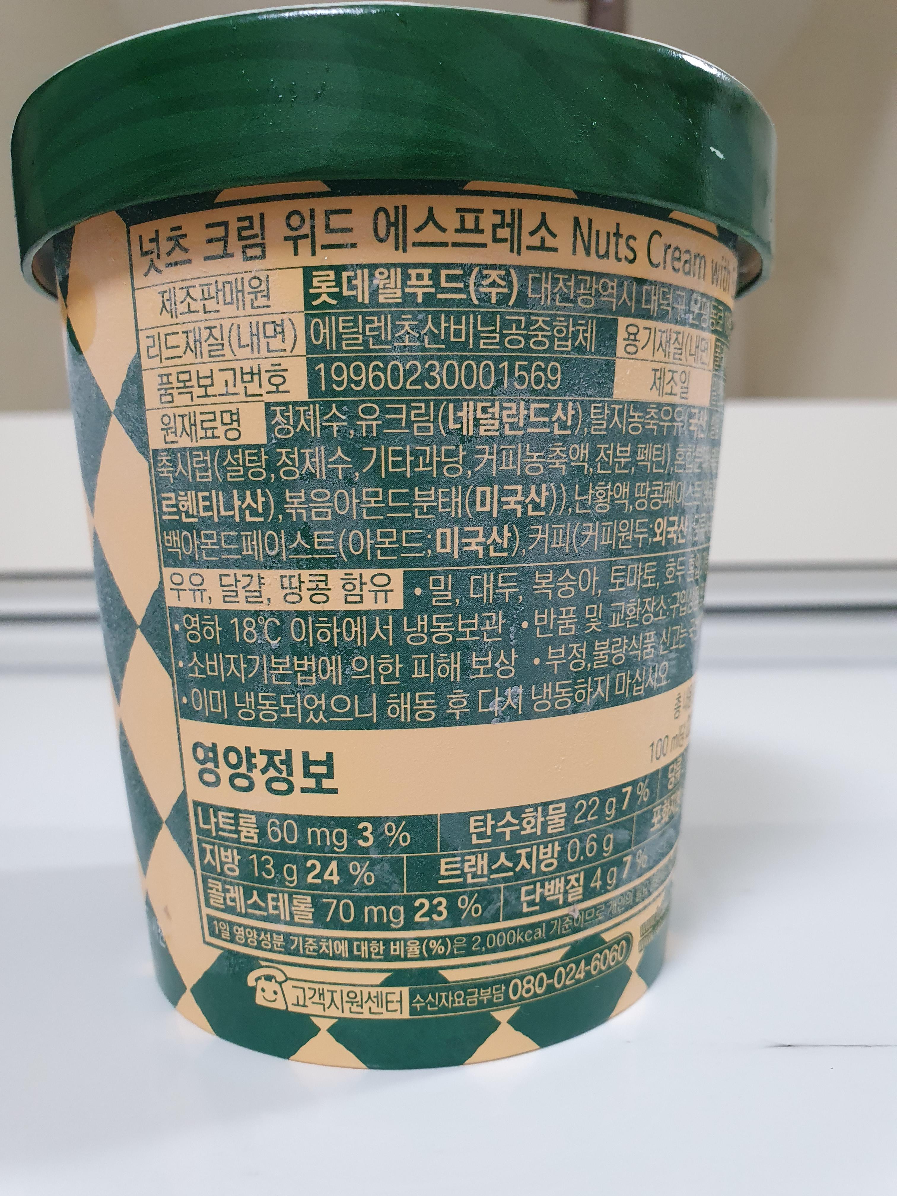 [원재료명] 정제수, 유크림, 탈지농축우유, 설탕, 에스프레소농축시럽, 혼합분태, 볶음아몬드분태, 난황액, 땅콩페이스트, 볶음백아몬드페이스트, 커피, 당류가공품, 정제소금