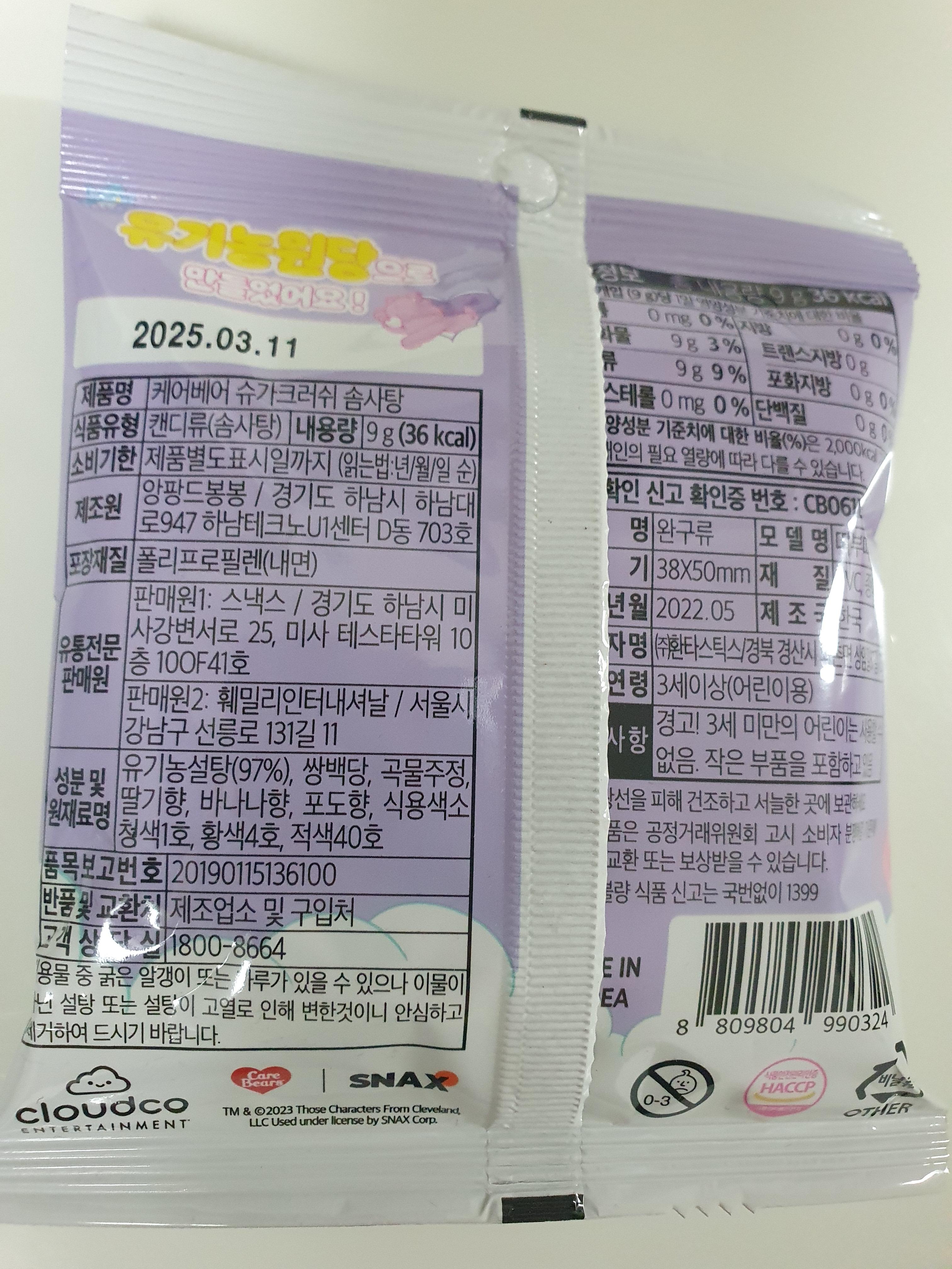 [원재료명] 유기농설탕, 쌍백당, 곡물주정, 딸기향, 바나나향, 포도향, 식용색소 청색1호, 황색 4호, 적색 40호