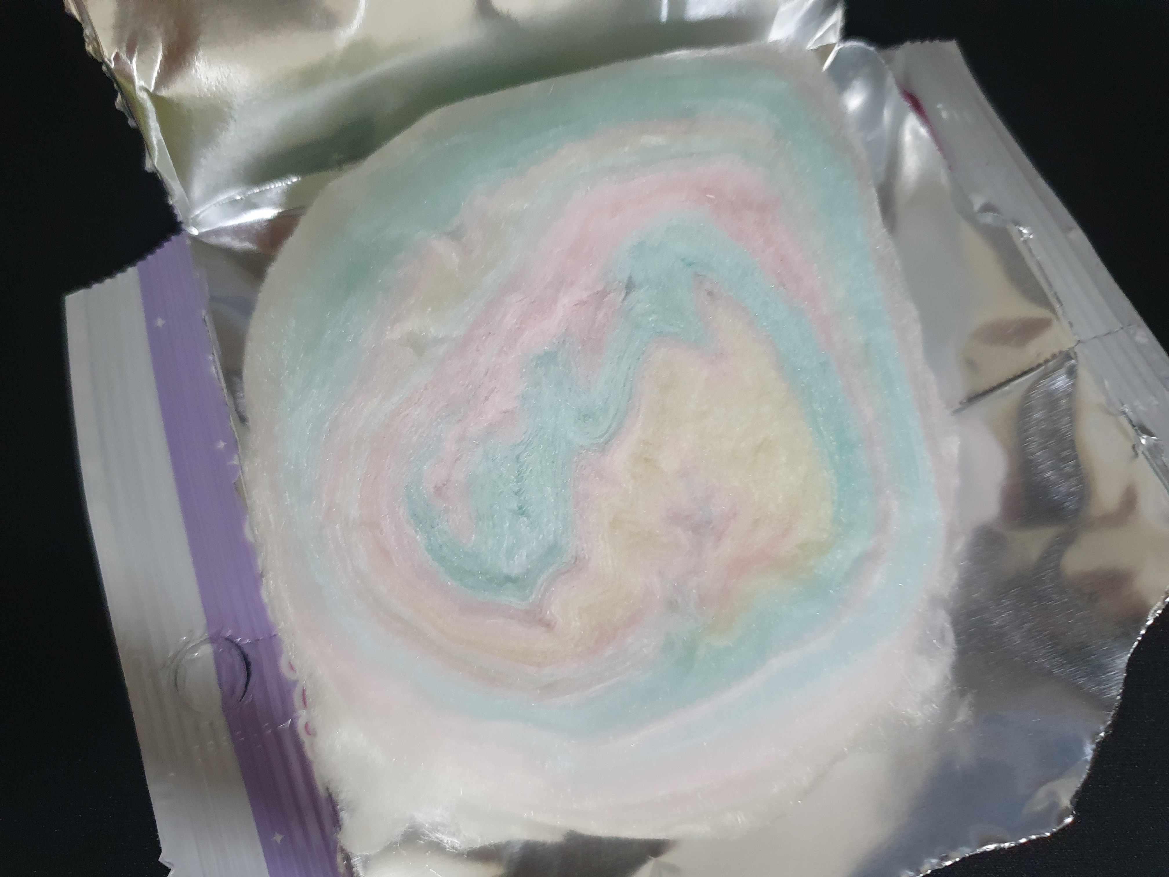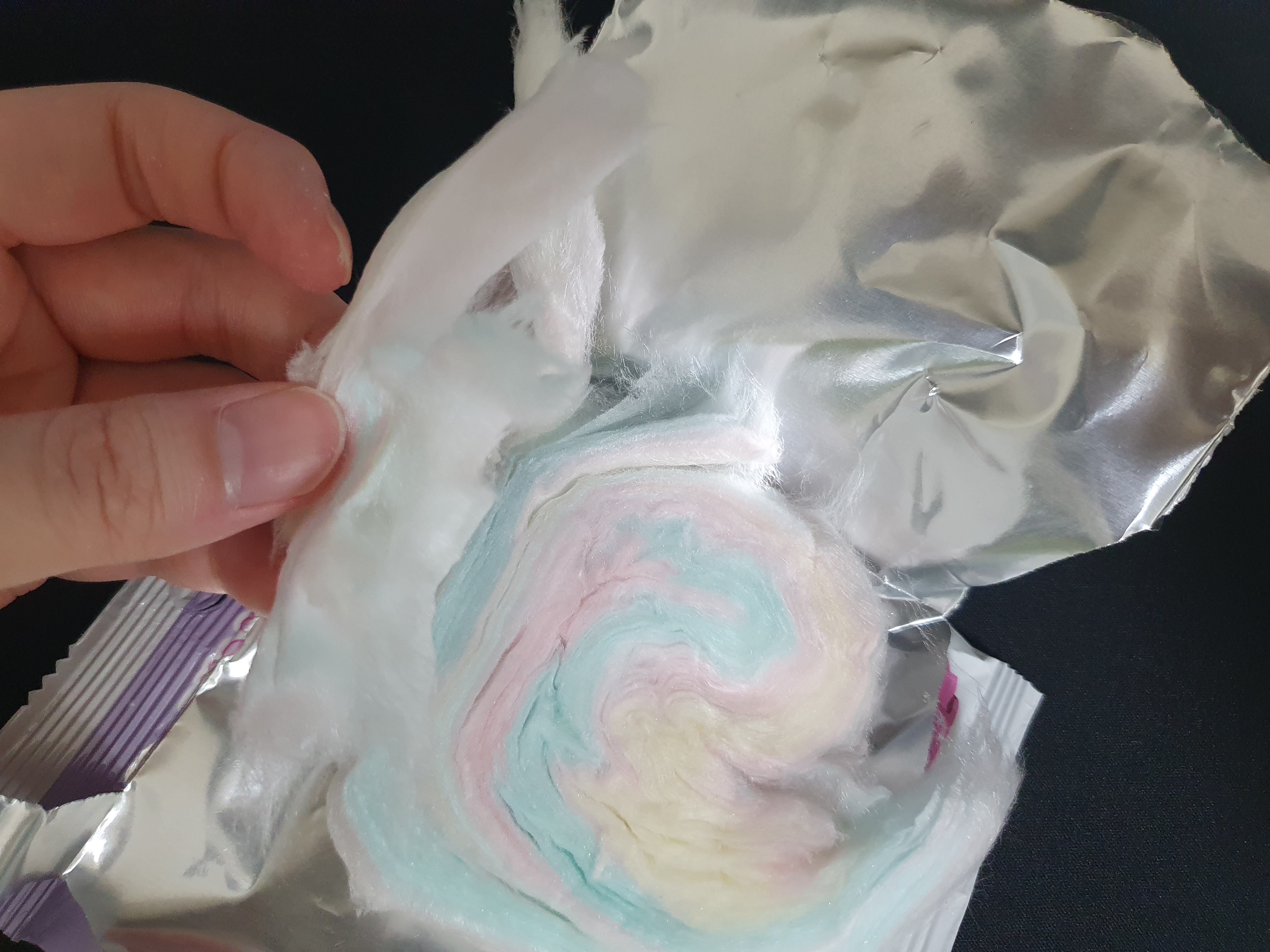 가격은 2000원 정도이고 양은 보다시피 매우 적다. 살짝 좀 너무 많이 압축되어있는 솜사탕이면 어쩌나... 했는데 생각보다 그렇게 많이 압축된 느낌은 아니고 적당한 수준인 것 같다.