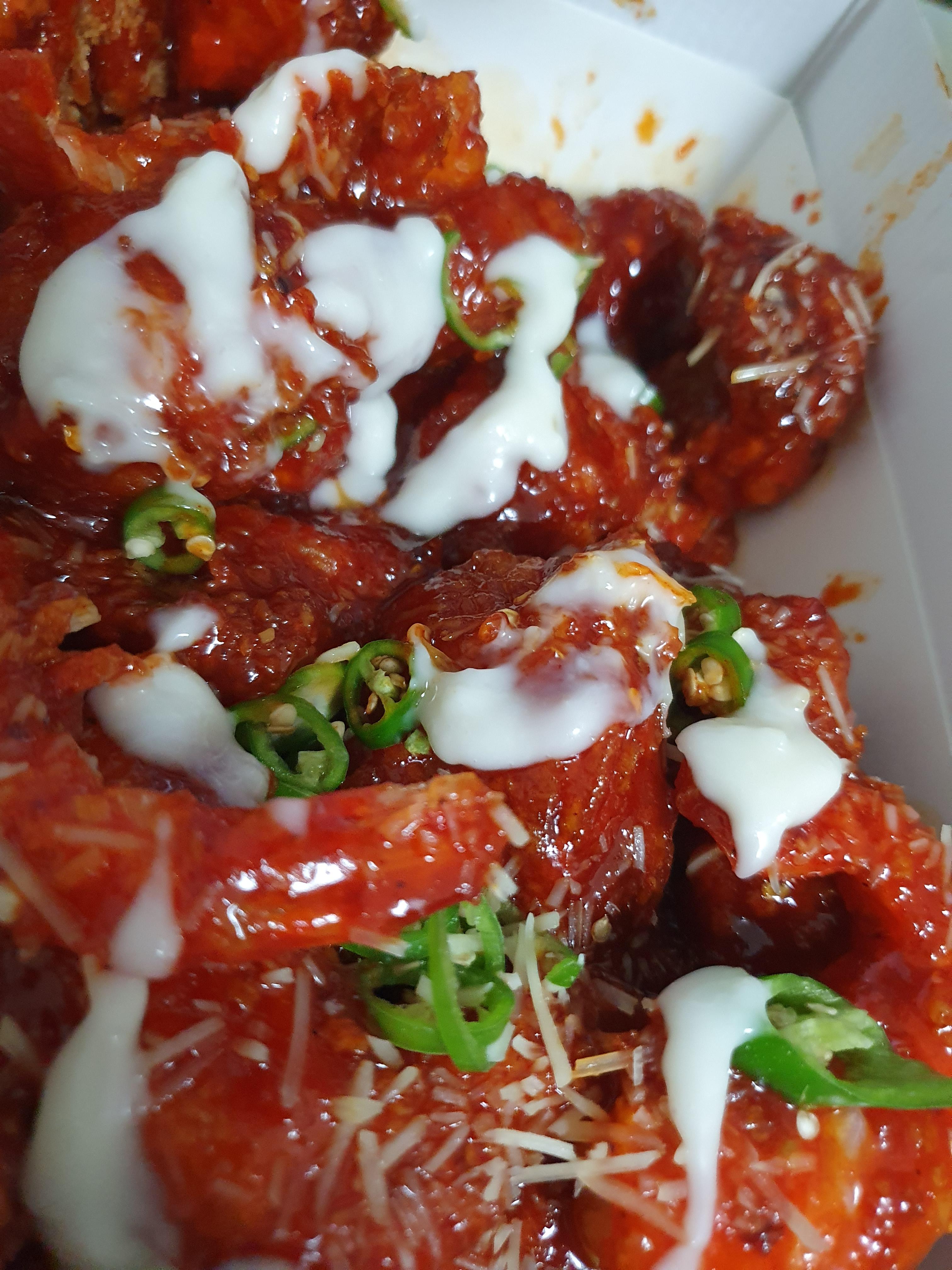 양념은 당연히 기본적으론 맵지만 많이 안맵다. 이거 먹어도 딱히 위장에 자극이 크지 않을 것 같은 느낌 정도이다. 실제로 별다른 이슈(?)는 없었다.