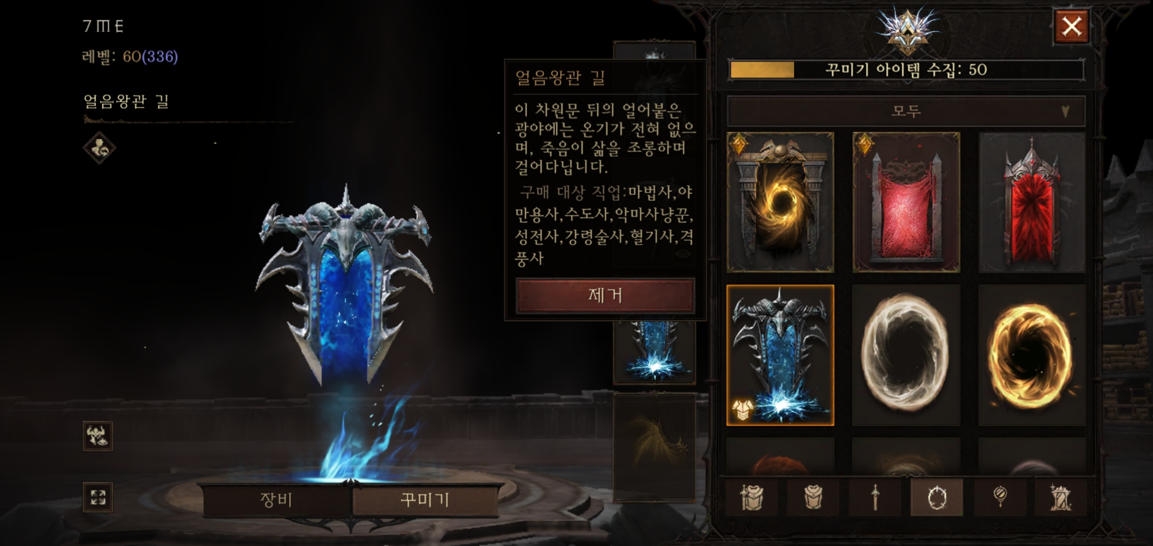 배틀 패스 보상은 아니고 이번에 서리왕 이벤트 보상 차원문 스킨인데 마침 얻어서 그냥 같이 첨부했다. '얼음왕관 길'인데 오우~ 그래~ 딱! 내가 원하던 포탈 스킨이다.