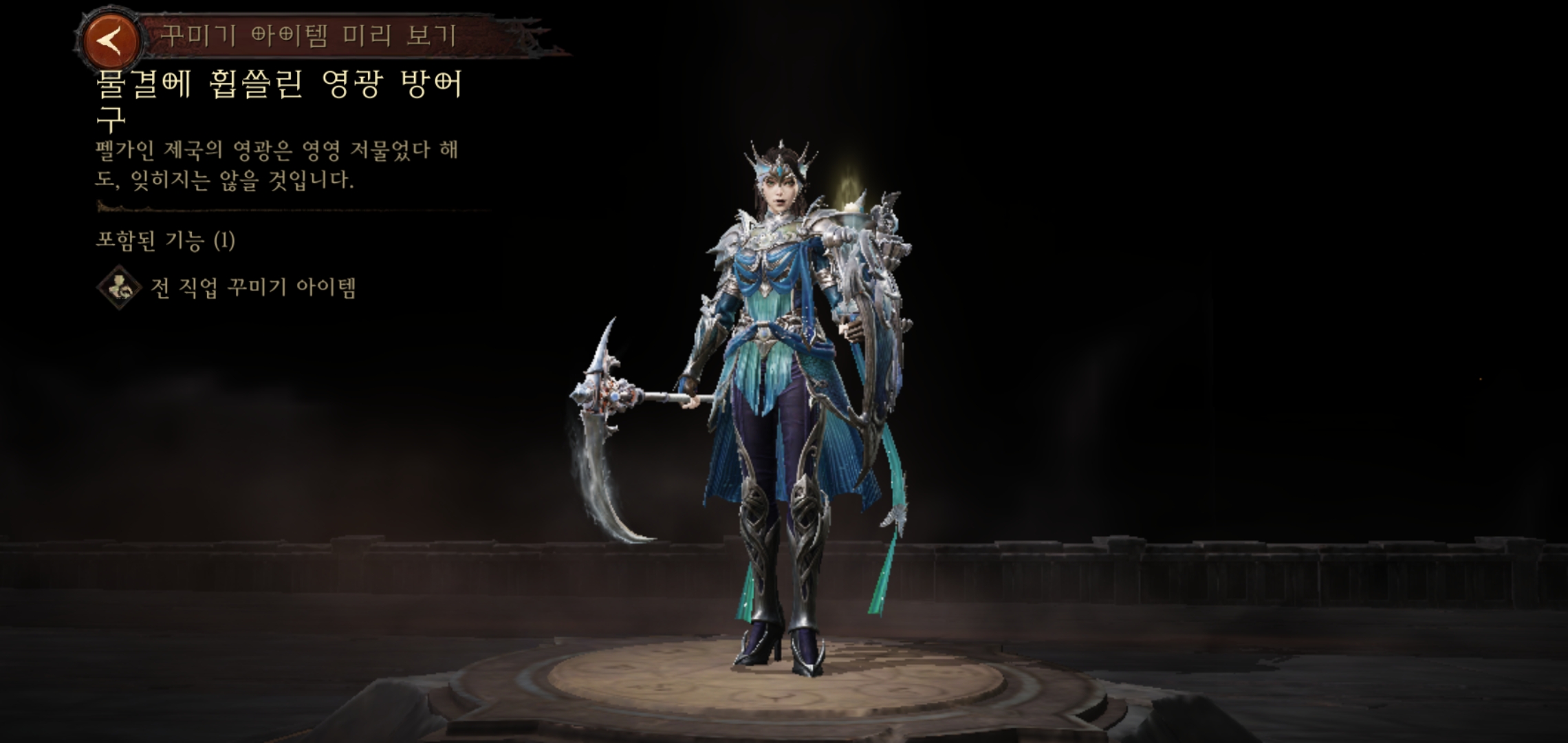 크게 막 이펙트가 걸려있는 스킨은 아니지만, 보다시피 깔끔하고 아주 고급스럽고 정갈하다. 강령술사는 낫과 방패를 들고 있는데 방패는 단단한 미스릴 갑옷 같은 느낌으로 비닐이 씌어져 있고 좌우 대칭으로 세련미를 더 살렸다.