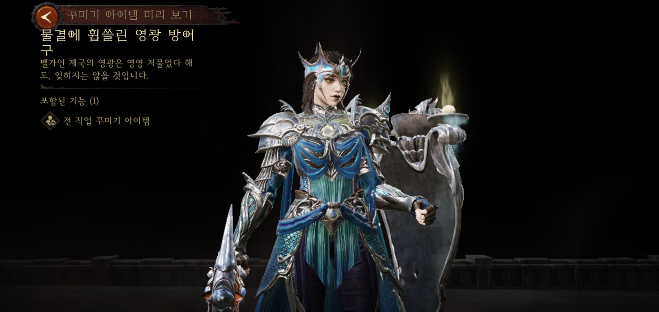 크기도 큼직해서 상당히 보는 맛이 좋고 아무래도 탑뷰 시점에서는 캐릭터가 워낙 작다 보니까 디테일한 부분들이 눈에 들어오진 않지만, 방패의 경우 이동할 때 등딱지가 되는데 물결에 휩쓸린 영광 방어구의 등딱지 모습은 뭐 나쁘진 않았다.