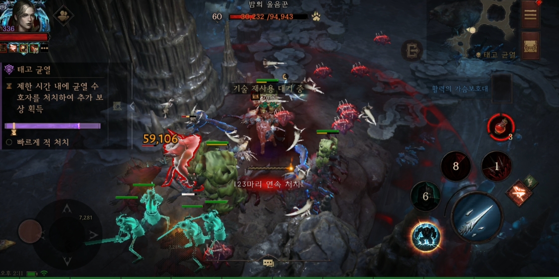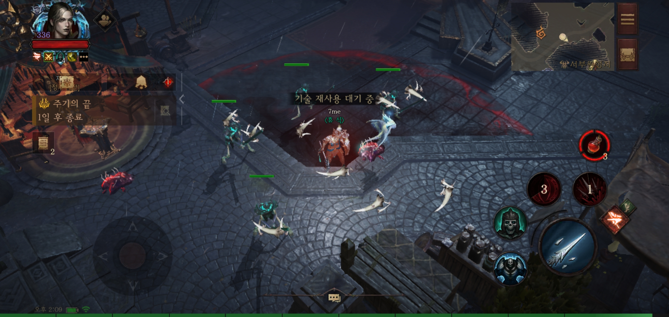 하지만... '귀찮'... 사신의 낫까지 쓰면 손이 너무 바빠서 나는 같이 안쓰고 있다. 근데 같이 쓰면 확실히 효율이 훨씬 높다. 피해량도 당연히 높아지고 사신의낫은 알다시피 적에게 적중시 시체를 생성하기 때문에 뼈의 소용돌이를 더욱이 쉽게 맥시멈 상태로 만들 수 있다.