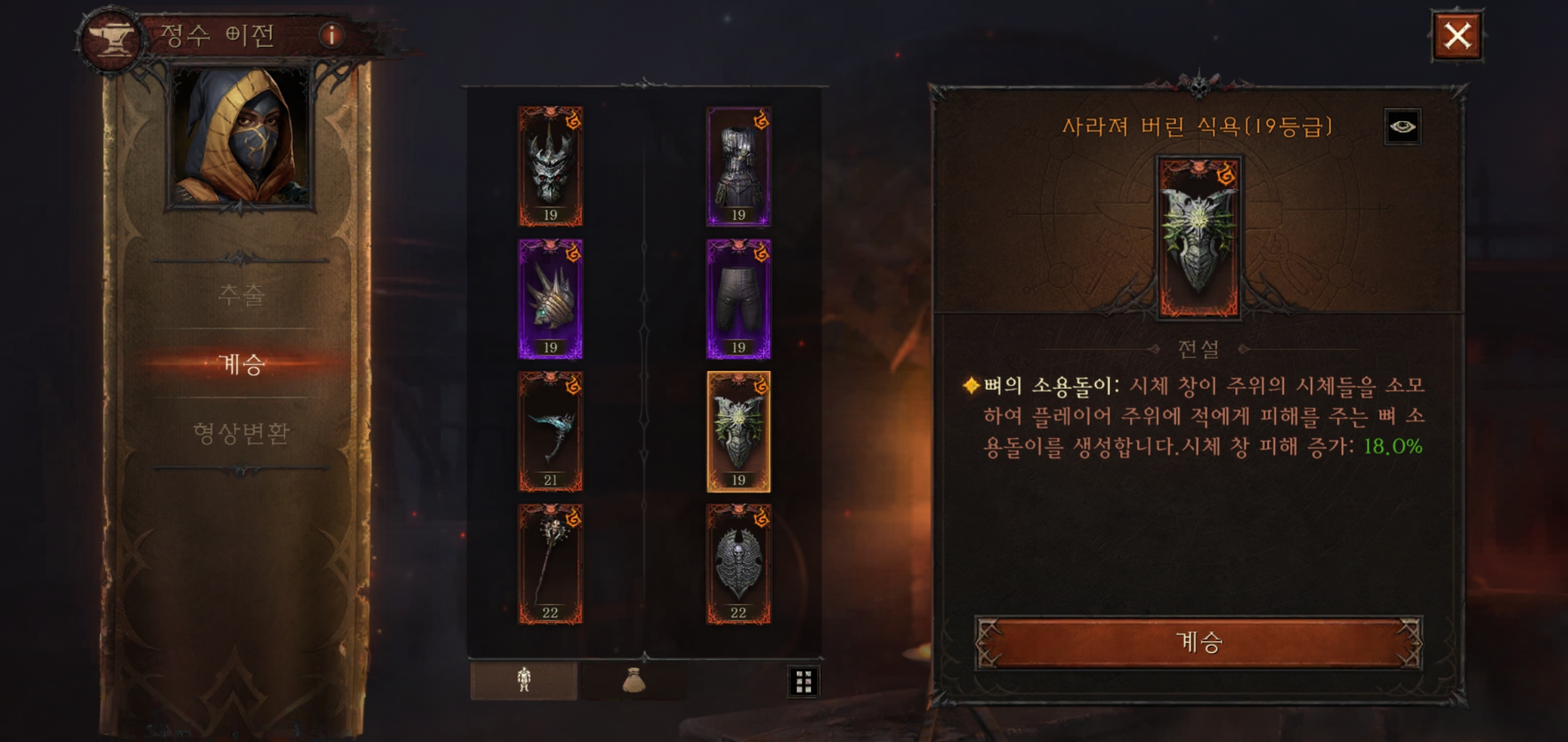 시체 창 관련해서 주력 스킬들이 많이 생겼는데 그중에 하나가 전설 장비 방패 부위에 착용하는 '사라져 버린 식욕'의 '뼈의 소용돌이'이다.