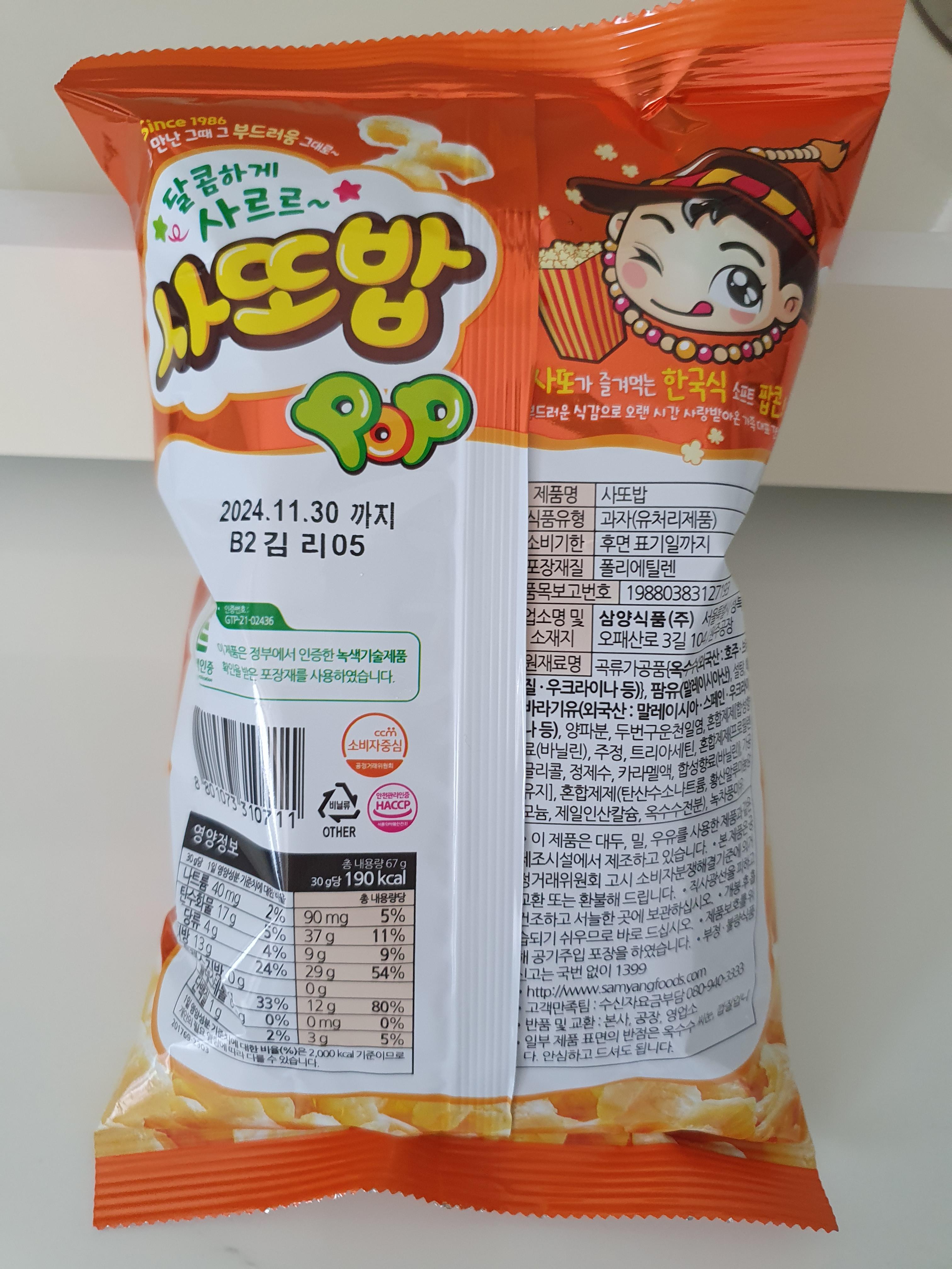 삼양식품 과자이고 '한국식 소프트 팝콘'이라고 소개가 되어있다. 그래그래~ 나도 어릴 때 기억이 난다. 그 당시에 팝콘이 지금처럼 이렇게 흔하지가 않았고 한국에서 팝콘이라고 하면 좀 오바해서 말하면 꽤나 신문물 같은 이미지가 살짝 있었다.