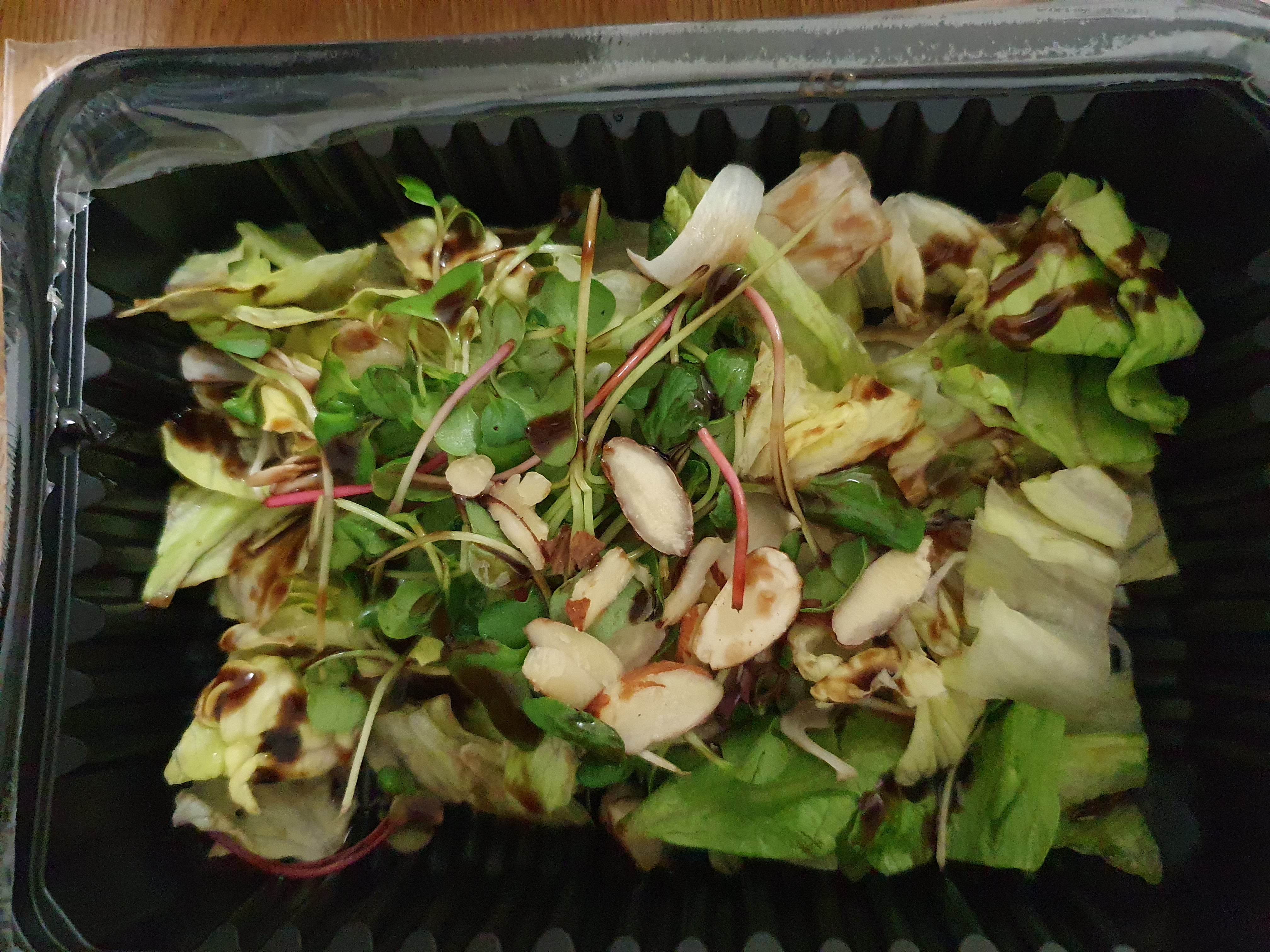 샐러드도 같이 준다. 오른쪽 사진에 보이는 샐러드는 2인분이고 1인분은 작은 통에 담겨서 온다. 샐러드... 쥰내 맛있다. 새싹 및 양상추, 아몬드 슬라이스 거기에 드레싱까지... 완벽했다. 그냥 추가금액 내고 주문하는 샐러드들 다 압살 해버릴 정도로 너무 맛있었다.