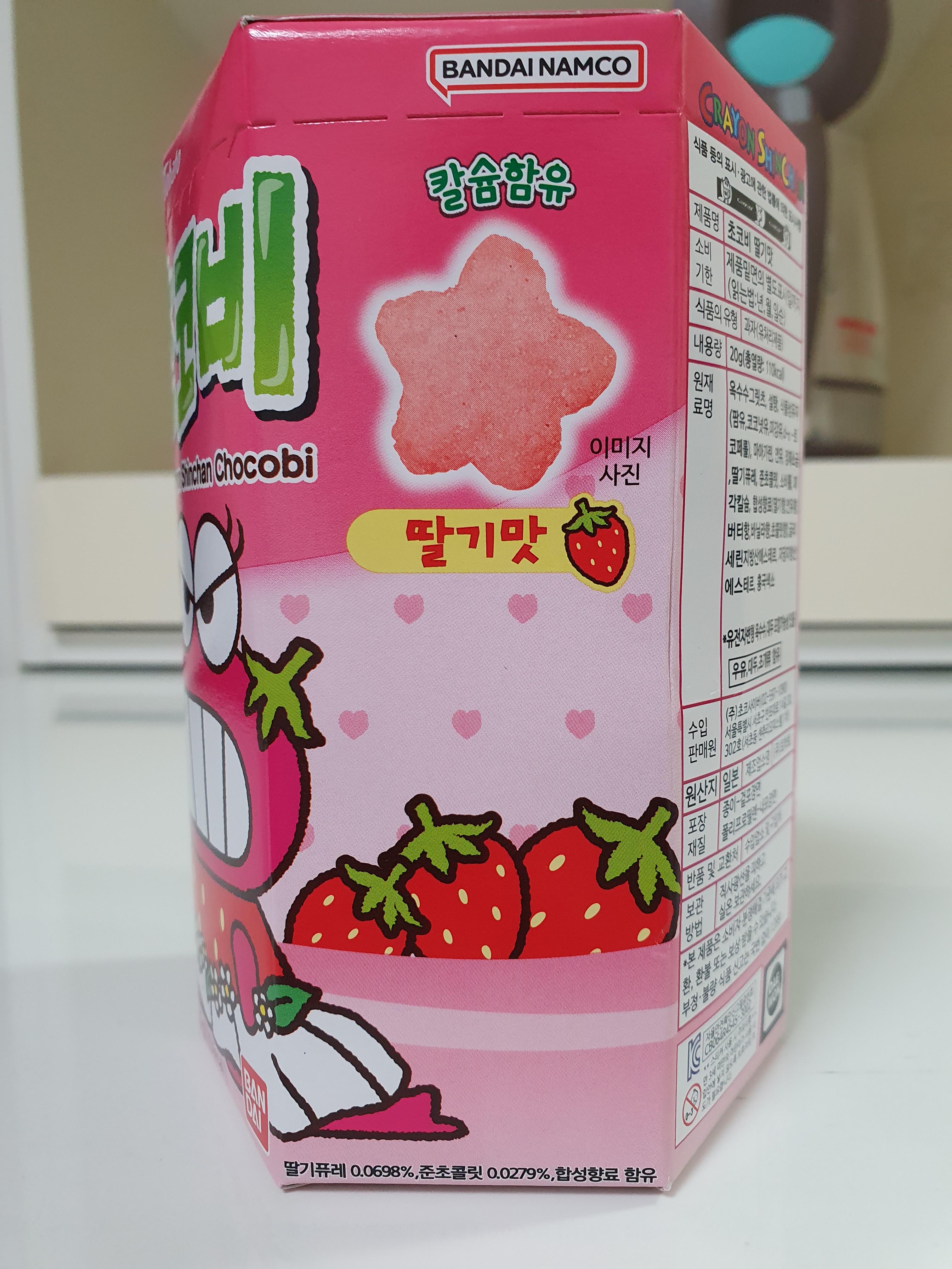 크레용 신짱~ 떡하니 박혀있는 것처럼 원산지 일본이고 우리나라에서는 '짱구는 못말려'로 유명한 애니메이션 속에서 짱구가 엄청 좋아하는 과자인 '초코비'이다.