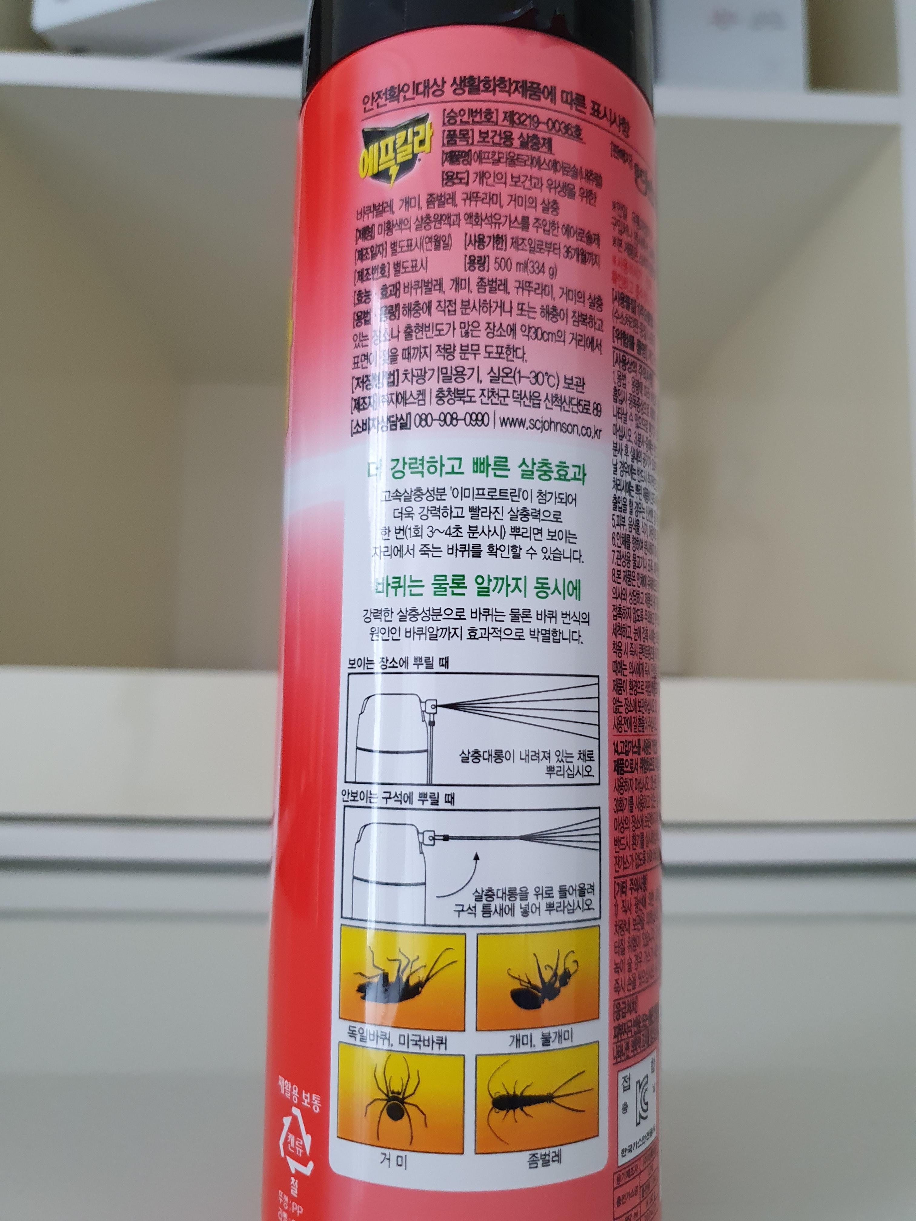 일단 바퀴벌레가 들어가 있어서 바퀴벌레 전용인 것 같기도 한데 그냥 내 경험상 각종 벌레들에게 효과가 있는 것 같다. 적혀있는 용도를 보면 바퀴벌레, 좀벌레, 개미, 귀뚜라미, 거미의 살충이라고 되어있다.