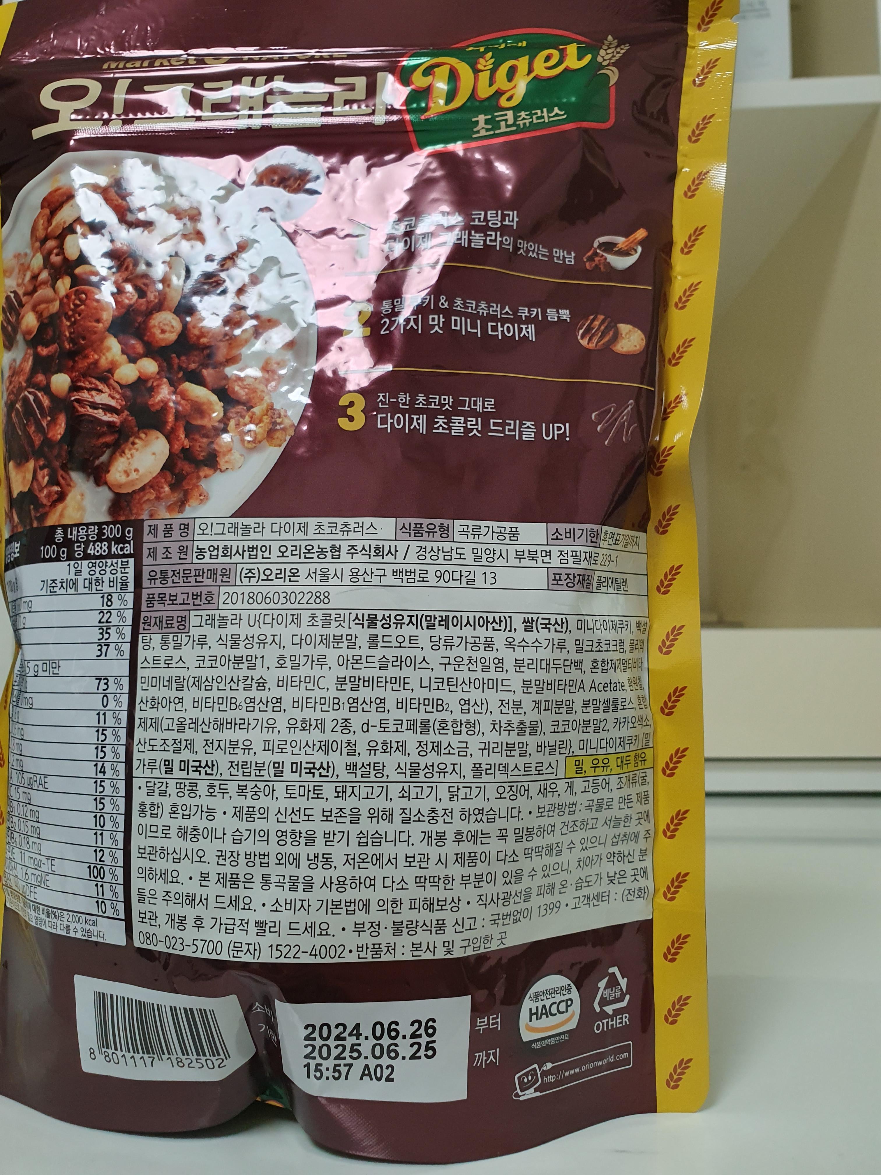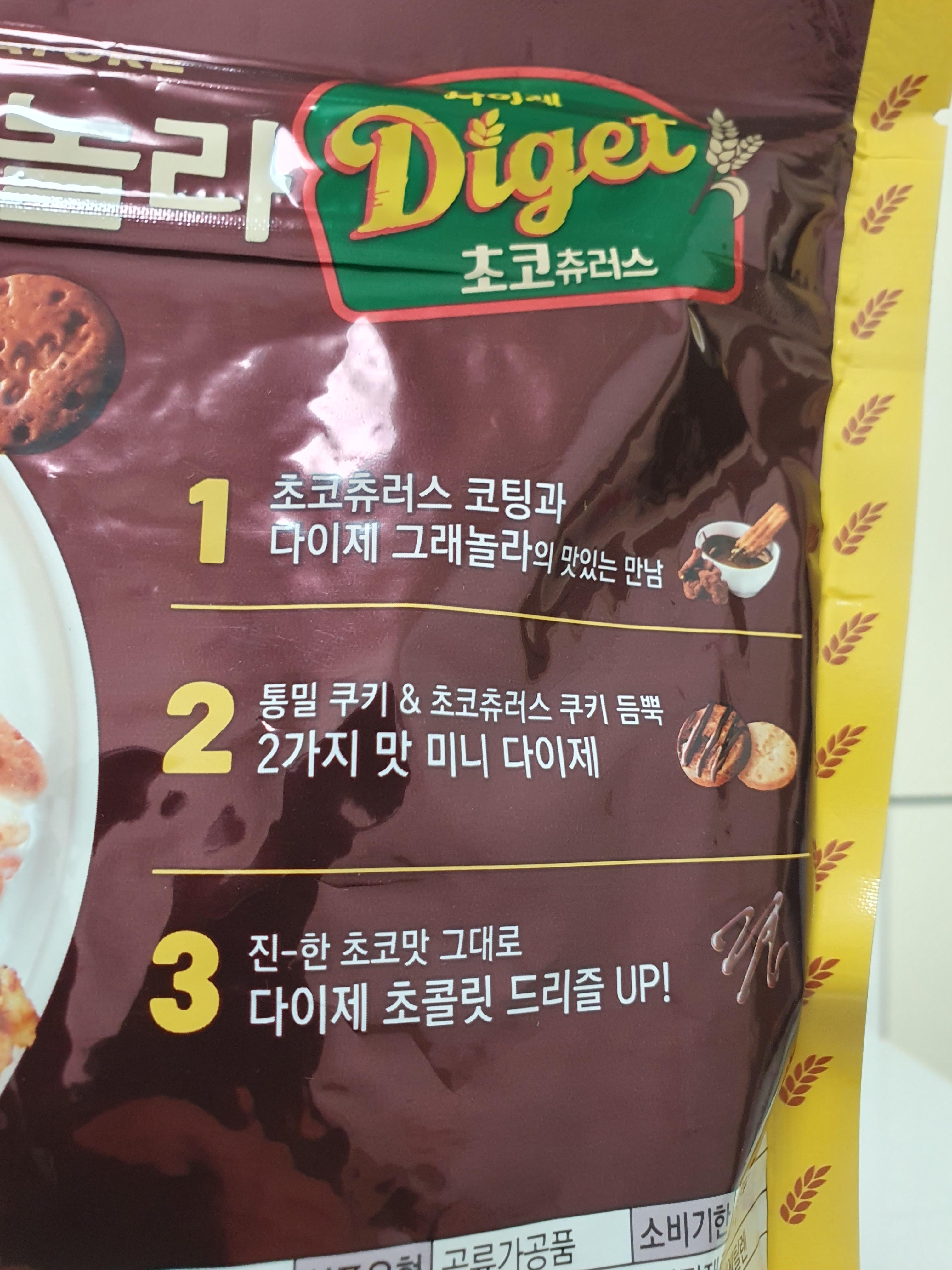 시리얼들은 보통 우유와 섞이면서 오히려 시너지 효과를 내어 우유에 말아먹는 게 맛이 더 상승하는 일인데 오그래놀라 다이제 초코츄러스 같은 경우는 우유에 말아먹는 게 오히려 맛이 떨어지는 느낌이 있다.
