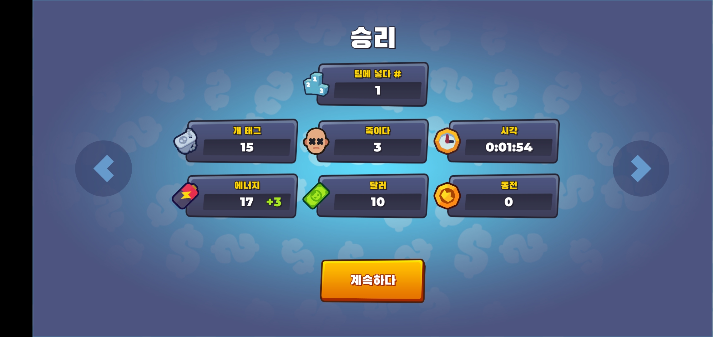 승리를 하면 결과표가 나오고 소정의 보상을 받는다. 경기 중에는 '달러'도 떨어지니까 잘 겟 해야겠다.