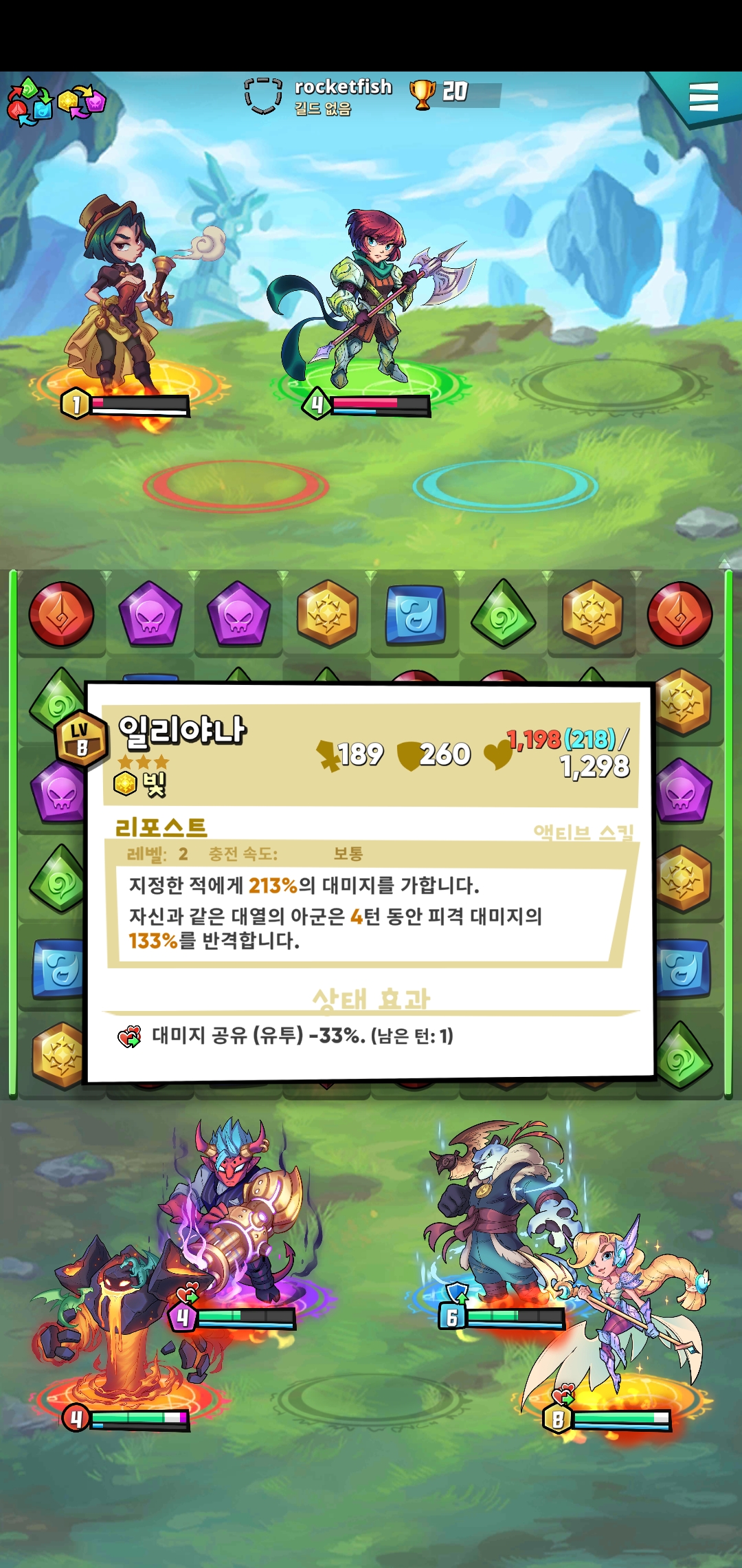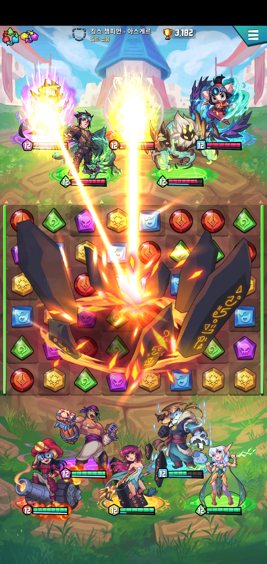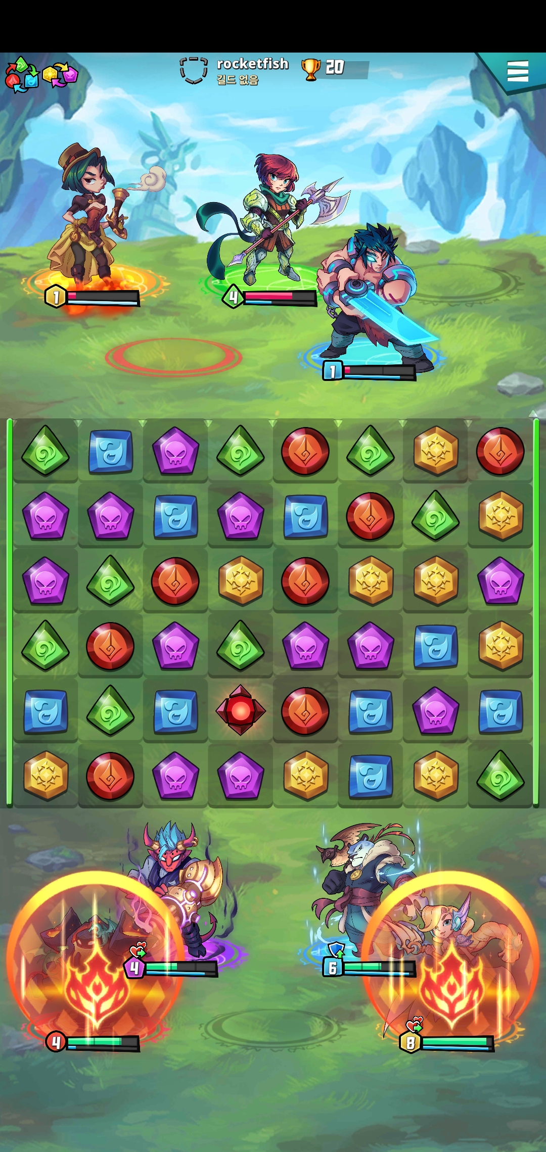퍼즐은 기존의 퍼즐 방식 그대로이다. 3줄 만들면 제거되면서 상대에게 공격을 하는데 라인을 탄다. 4줄 만들면 특수 블럭 나오고 다섯줄이면 무지개 등등 다 똑같다. 아무래도 배틀이기 때문에 특수 블럭을 만들어버리면 상대에게 유리하게 되는 것이기 때문에 특수 블럭을 만들기 보다는 '콤보'에 집중하는 것이 좋았다. 영웅들의 스킬은 해당 영웅을 꾸욱 누르고 있으면 설명창이 나온다. 해서 전투 하면서 영웅들이 무슨 스킬을 갖고 있는지 확인이 가능하고 스킬 사용은 본인 턴일 때 해당 영웅을 클릭하면 된다. 지정 타겟이 가능한 스킬은 상대 영웅을 먼저 터치한 후에 스킬을 터치하면 지정 공격을 한다.