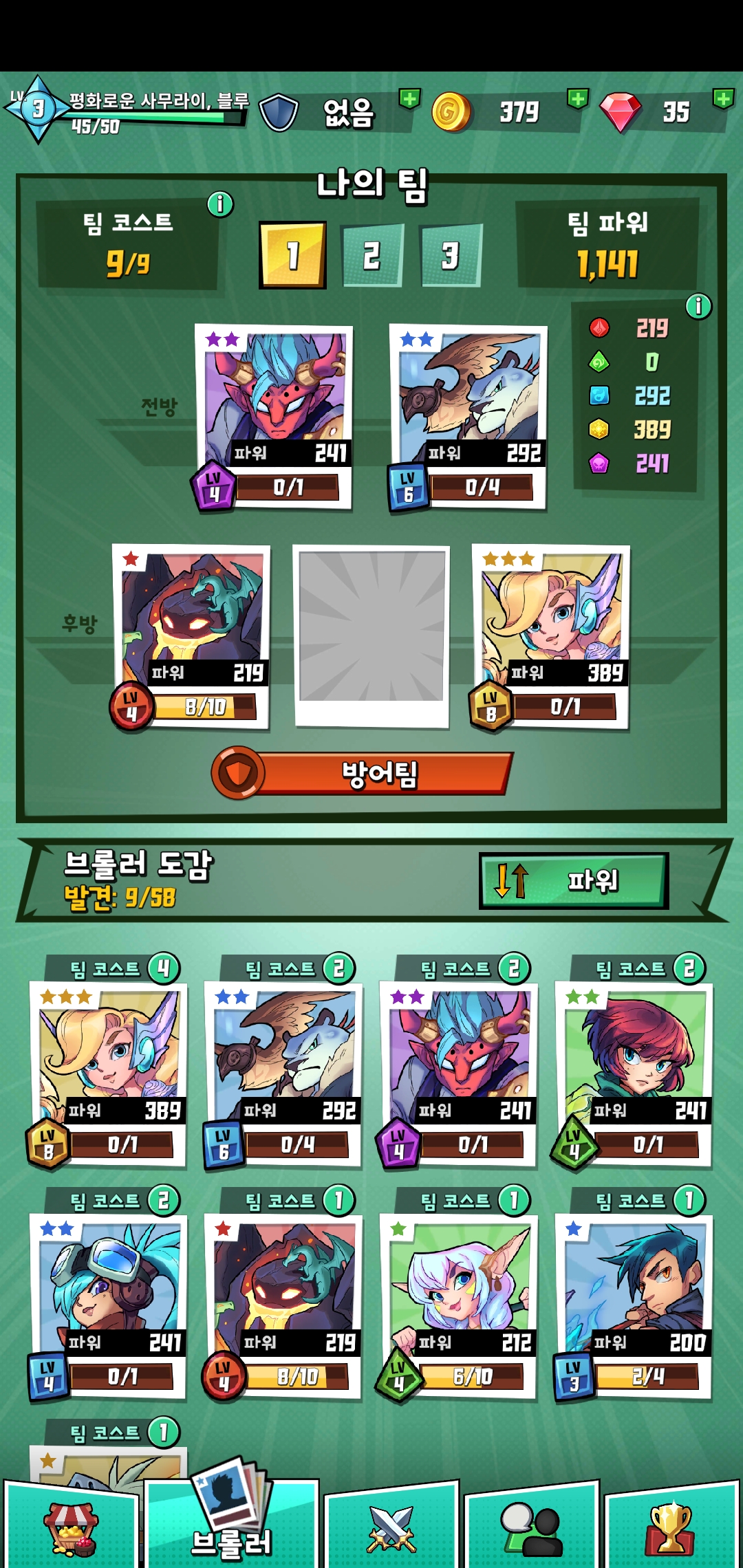 영웅 리스트에서 확인한 건 일단 4성까지 있었다. 성급업이 있는지는 모르겠지만 일단 레벨업은 있었다. 따로 성급업은 보이지 않았는데 찍먹 후기라서 나중에 뭐 해금되는지 어떤지는 모르겠다. 영웅마다 능력은 다르지만 간단히 전투력 측정을 할 수 있게 '파워'로 총합 점수가 표시되어있다. 대충 플레이 해보니까 파워 높은 게 최고이긴 했다. 공격력, 방어력, 체력과 같은 기본 스탯이 있어서 아무리 액티브, 패시브 스킬이 있어도 일단은 기본 스탯이 높은 게 최고였다. 팀은 총합 5명의 영웅으로 덱을 꾸려서 퍼즐 전투를 하게 된다. 왼쪽 상단에 보면 '팀 코스트'가 있다. 계정 레벨업을 할 때마다 코스트가 증가한다. 아무래도 코스트가 있다 보니까 조합에 대한 생각을 할 수 있게 해줘서 좋았다.