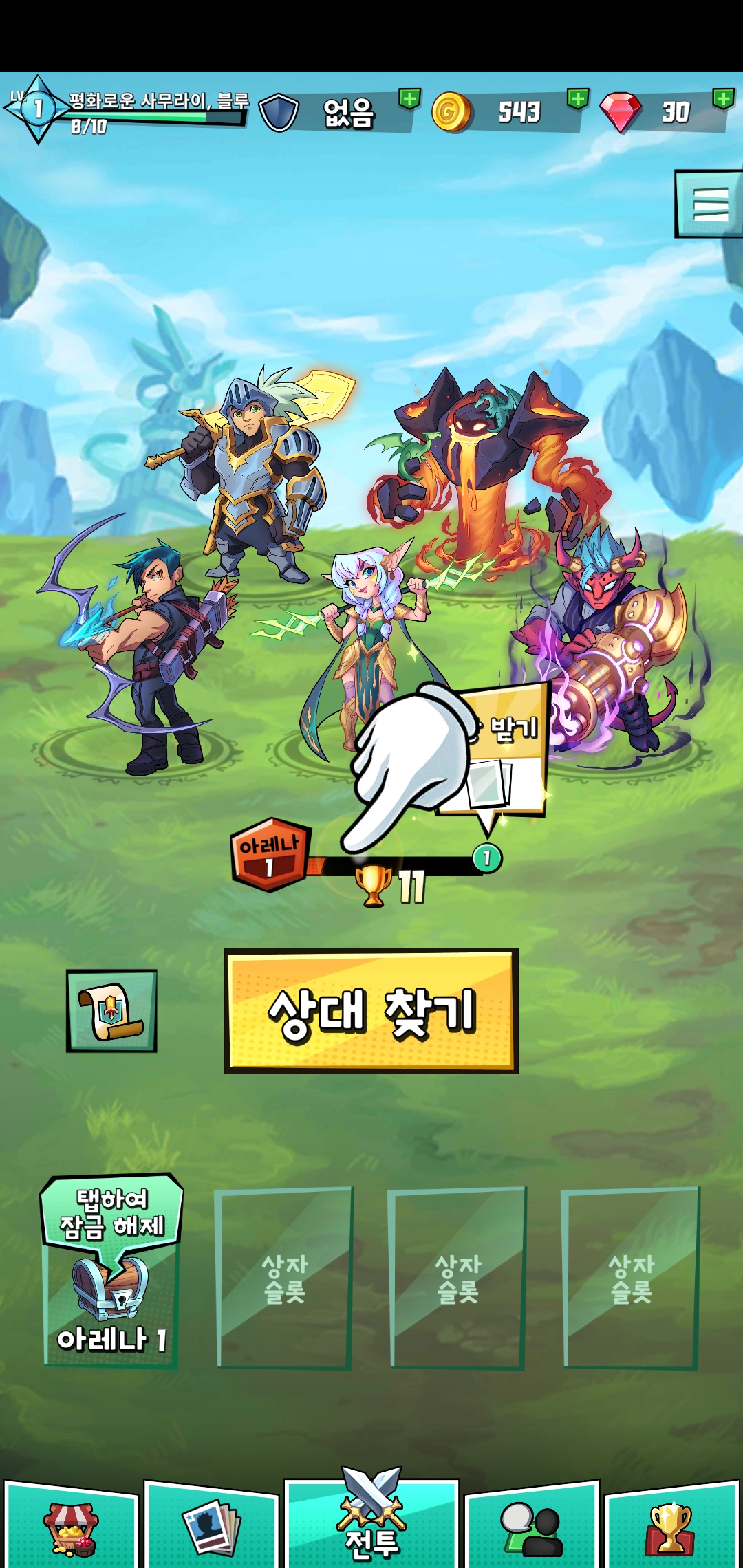 게임은 기본적으로 '매칭' 진행이다. 즉, 유저들과 배틀을 하는 형태가 메인이라 스테이지 등반이 아니었다. 이부분은 좋기는 했지만 다른 기종에서는 얼마나 접속하는지 알 수 없고 서버도 뭐 나뉘어있는지는 모르겠다만 갤럭시 게이머만 봤을 땐 하루에 약 100명 정도 접속하고 있어서 사실상 초보존은 AI매칭인데 나중에 유저를 만나면 훨씬 더 전략적이고 난이도도 높을 것으로 예상된다. 영웅들이 생각보다 전략적인 요충지가 많은 구성이라서 물론 기본적으로 성급 높은 게 최고이지만 같은 조건으로 볼 때는 조합과 전략적인 선택이 승패에 많은 영향을 미칠 것으로 보인다.