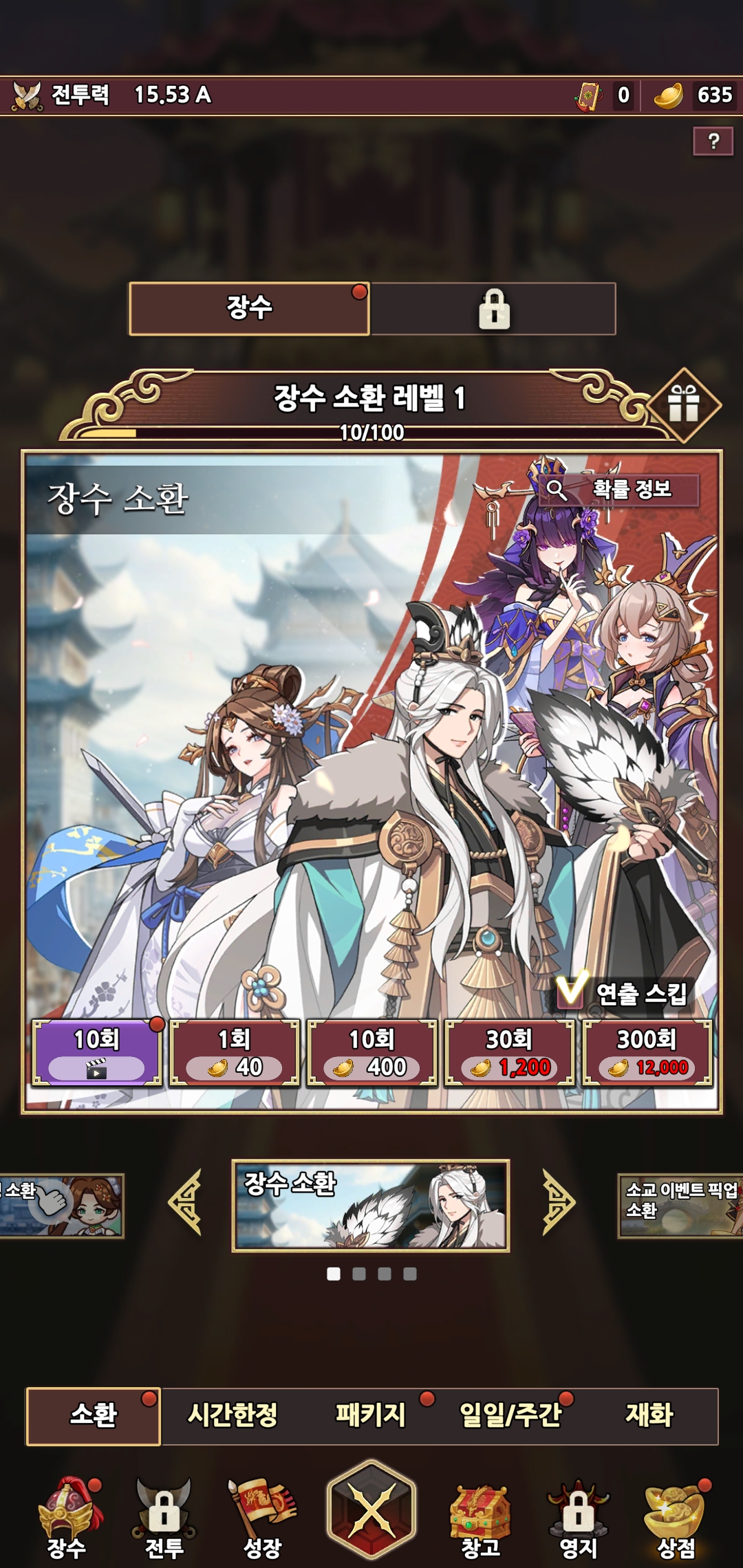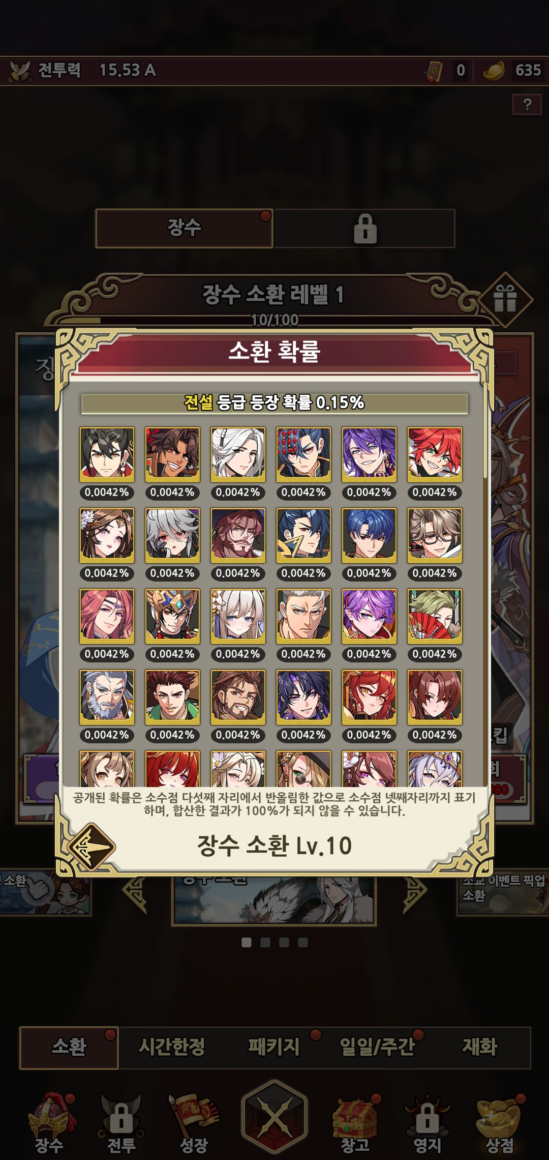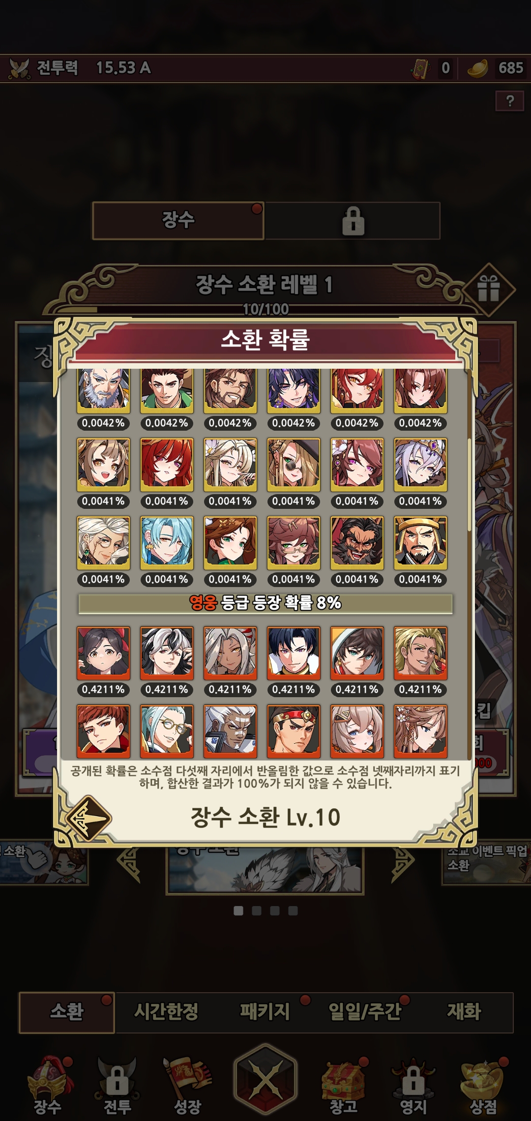 장수 소환의 겨우 300회 뽑기에 12000금괴가 들어간다. 딱히 가격적인 할인은 없어서 그냥 되는 대로 뽑으면 되었고 장수 소환 레벨이 있는데 10레벨이 MAX이다. 10레벨일 때 전설 등급 등장 확률은 0.15%이고 개별로 보면 0.0041%~0.0042%까지 있었다.