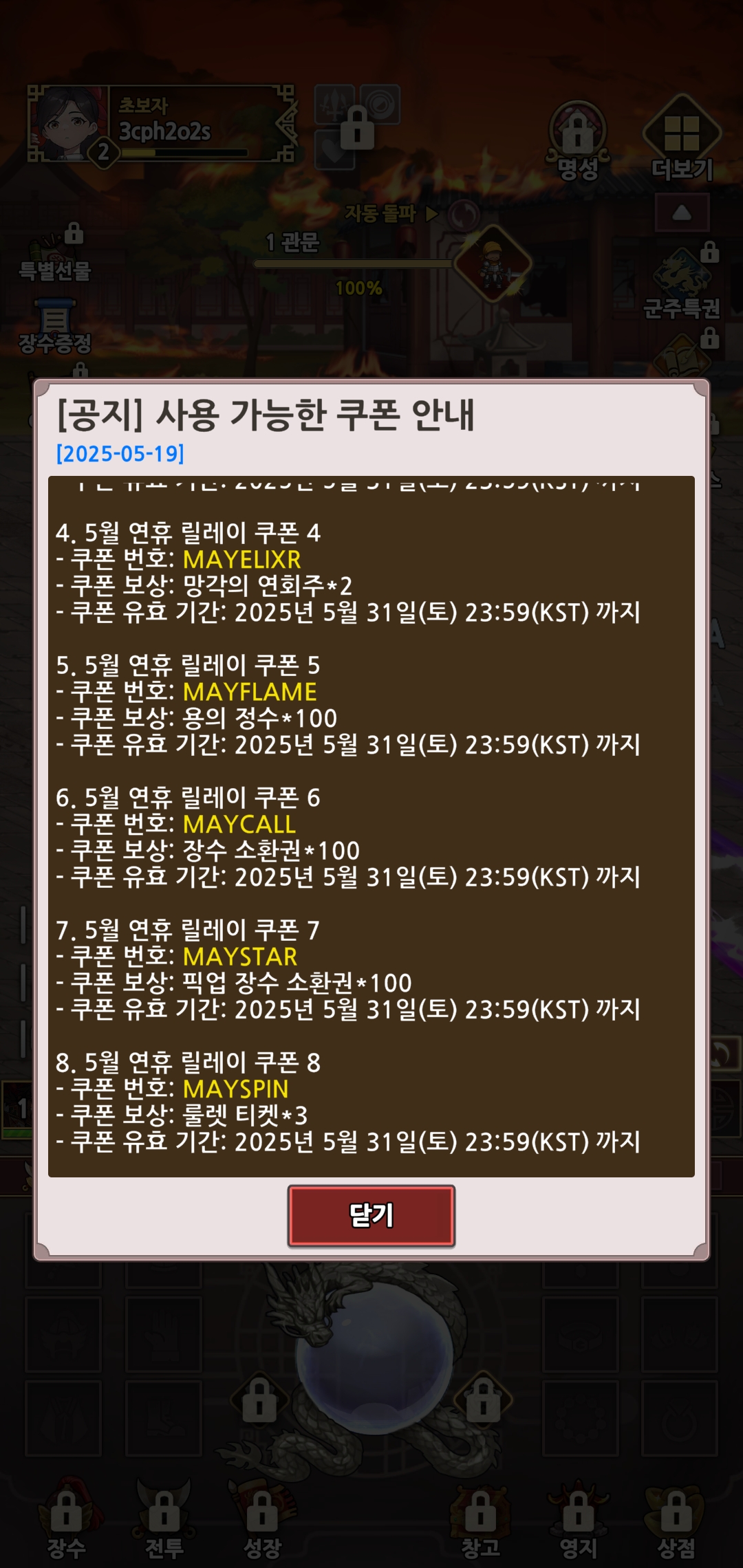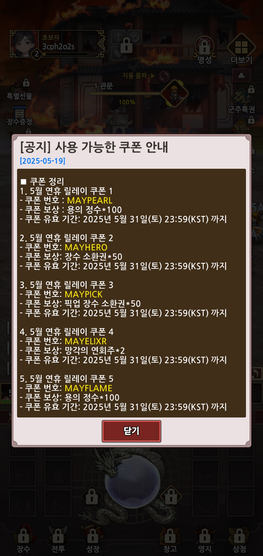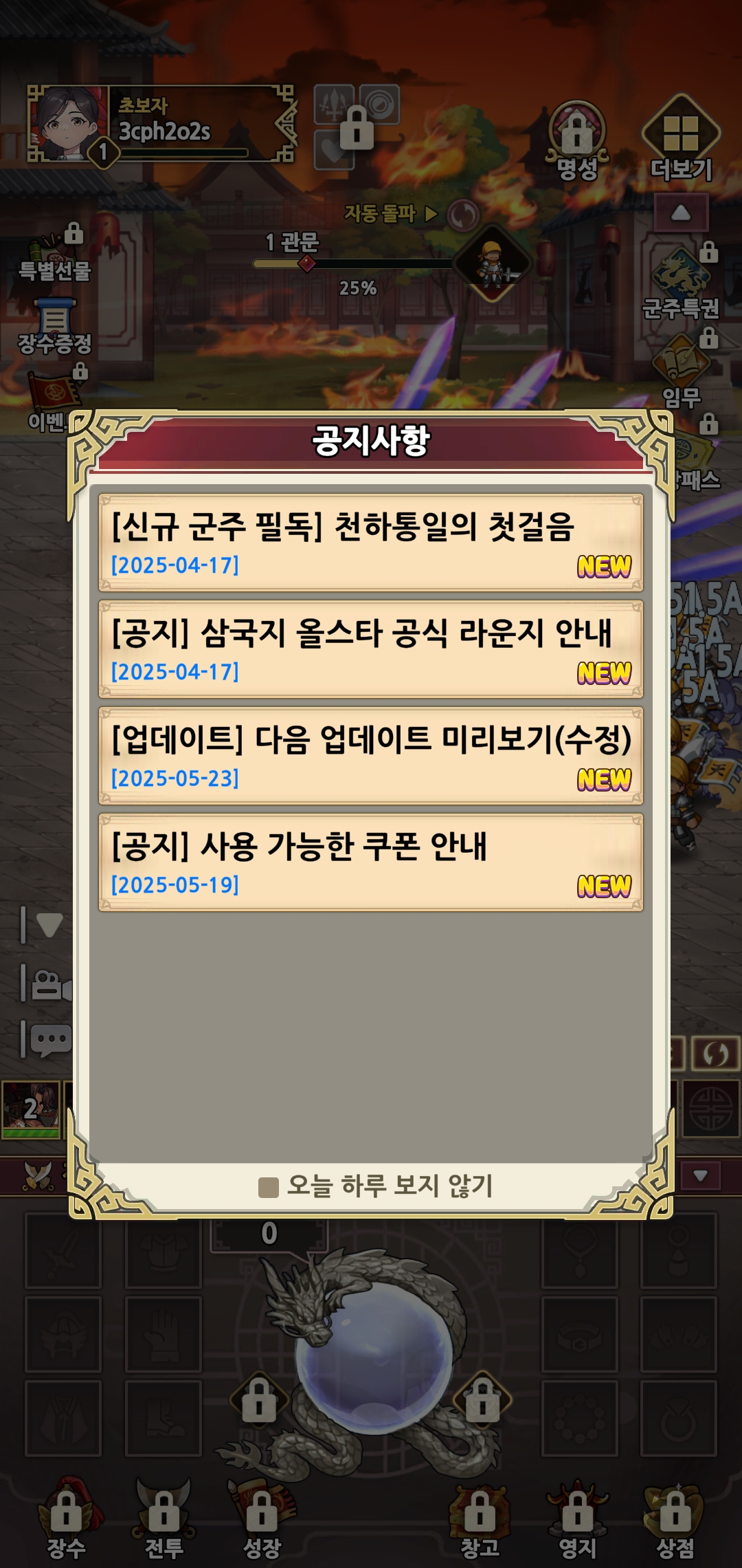 삼국지 인물들을 가지고 캐릭터화한 방치형RPG로 무난했던 것 같다. 출시일 2025년 4월 17일이고 제작 '엔게이트', 배급 '하이브로(highbrow)'로 배급사의 게임은 여럿 해보긴 했어서 낯이 익었다. 이용등급은 전체이용가이다. 최근까지도 업데이트는 하고 있는 것 같고 쿠폰은 아예 인게임 공지사항으로 띄어준다.