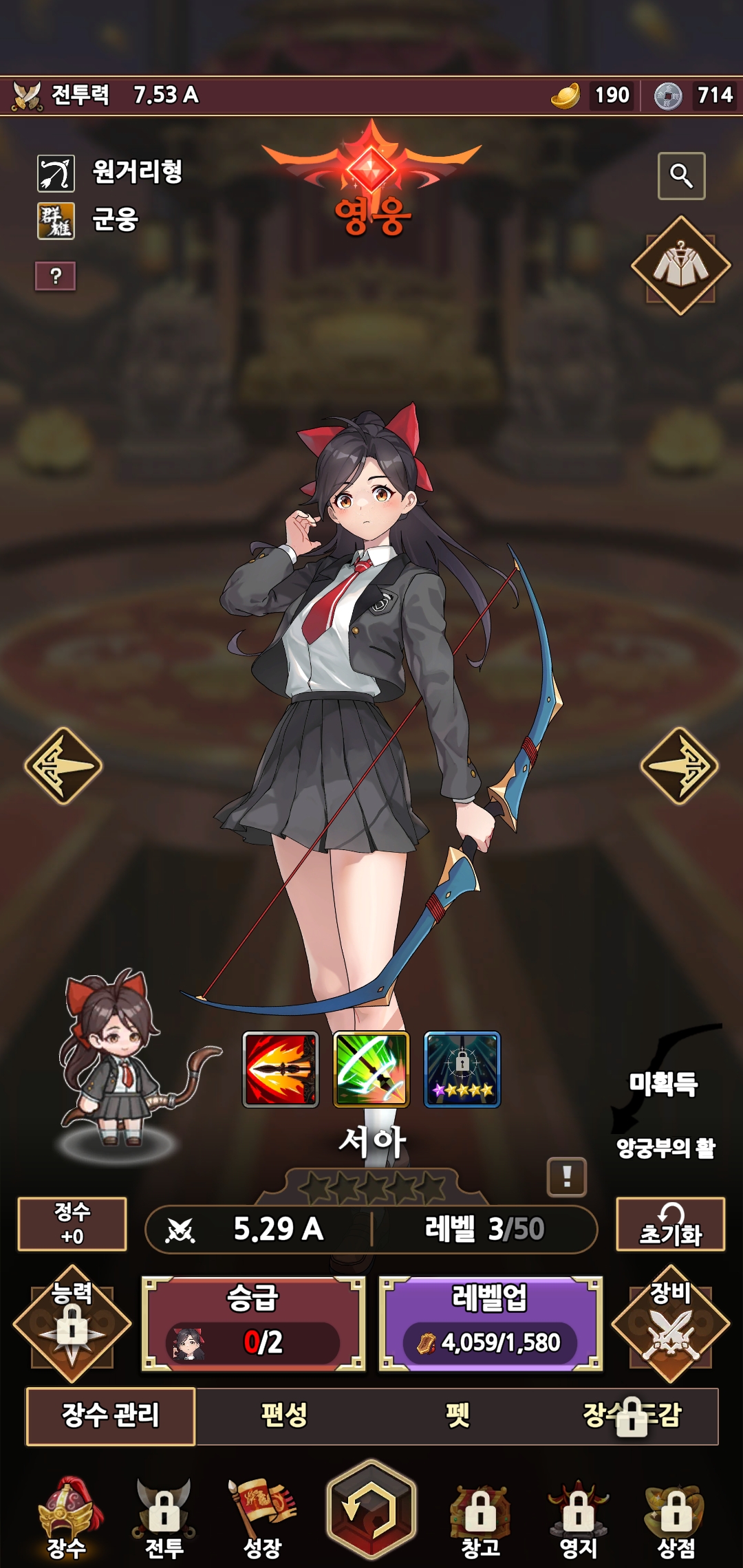 기본 지급 캐릭터로 '영웅' 등급과 '전설' 등급을 준다. 전설 등급으로는 '장비', 영웅 등급으로는 '서아'를 준다. 서아는 교복 복장을 하고 있는 여학생 캐릭터였고 활을 사용한다. 보니까 캐릭터마다 '스킨'도 있고 대략 살펴보니 역시 퀄리티 좋은 게 많아서 스킨은 상당히 수집욕구를 불러일으키기는 했다. 흔한 방치형RPG의 구성으로 다 너무 많이봤던 것들이라 매우 익숙했다. 스탯의 경우는 공격력, 방어력, 생명력이 있는데 맥시멈 찍고 다음 단계로 넘어가는 방식이다.