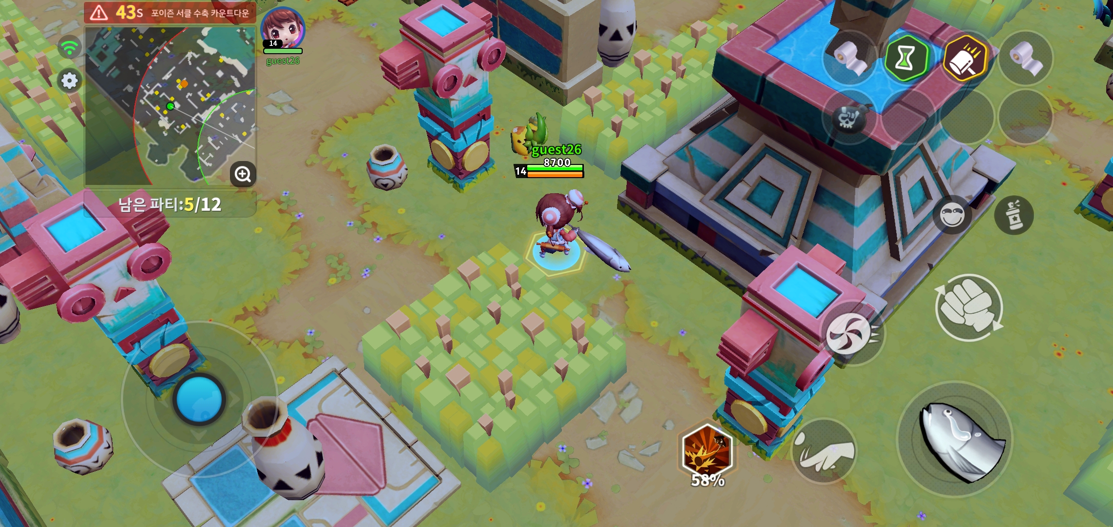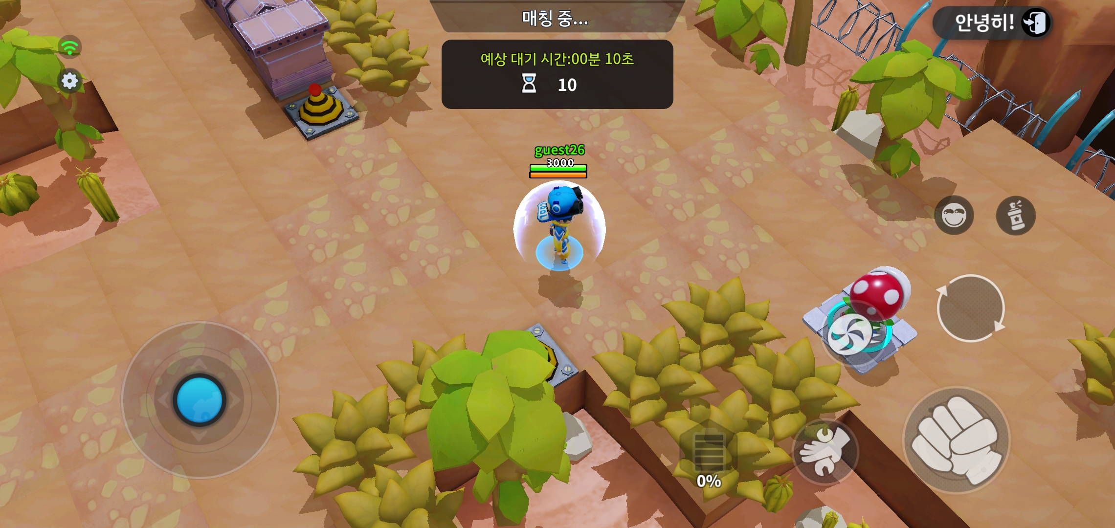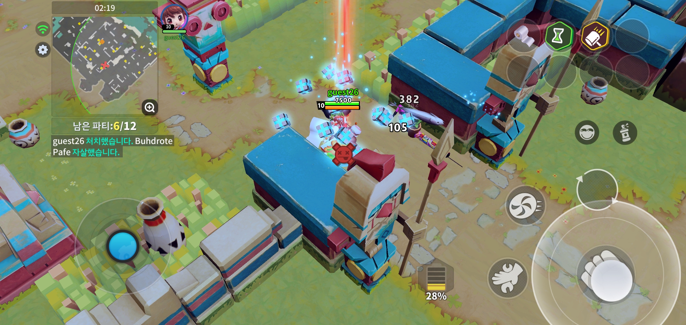 4vs4도 있고 3vs3, 개인전 등등 다양한 모드들이 존재했다. 화면은 가로 화면이고 조작은 생각보다 괜찮았다. 나쁘진 않았다. 왼쪽 이동 조이스틱, 오른족 기능이다. 게임 방식은 아이템전을 기본적으로 지향한다. 필드에 떨어진 아이템을 파밍해서 전투를 한다. 손에 들고 있는 주무기도 있고 패시브 역할을 하는 것도 있다.