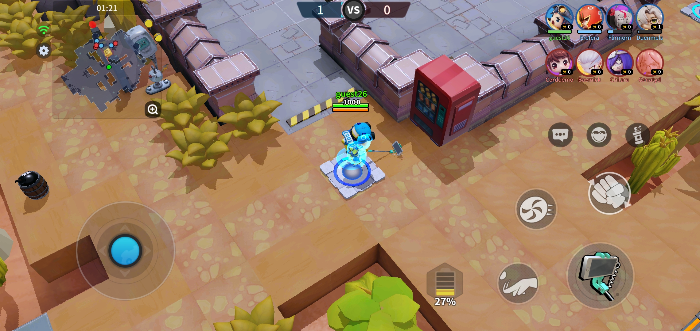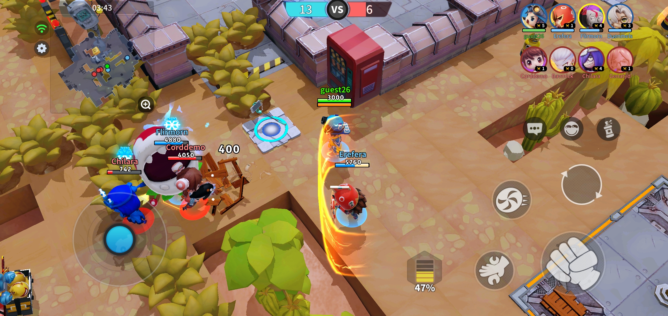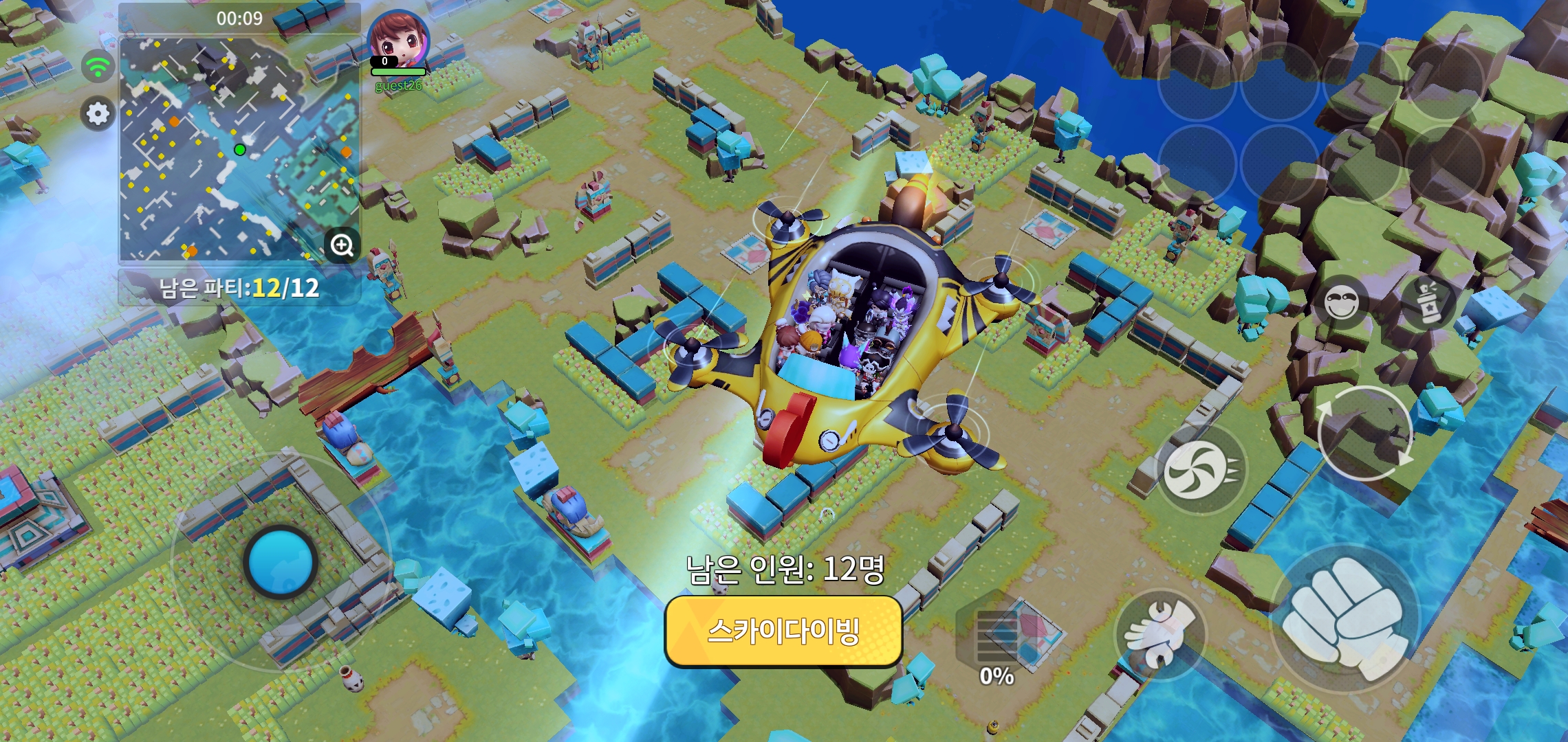 4vs4도 있고 3vs3, 개인전 등등 다양한 모드들이 존재했다. 화면은 가로 화면이고 조작은 생각보다 괜찮았다. 나쁘진 않았다. 왼쪽 이동 조이스틱, 오른족 기능이다. 게임 방식은 아이템전을 기본적으로 지향한다. 필드에 떨어진 아이템을 파밍해서 전투를 한다. 손에 들고 있는 주무기도 있고 패시브 역할을 하는 것도 있다.