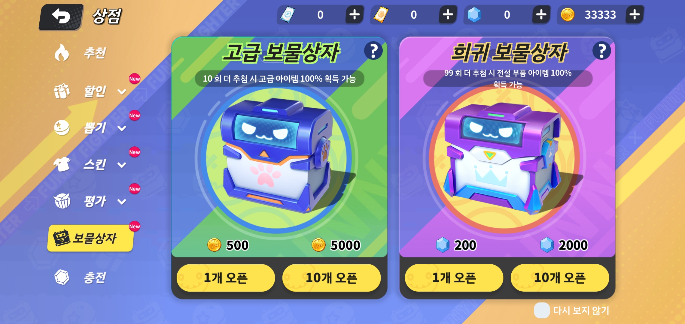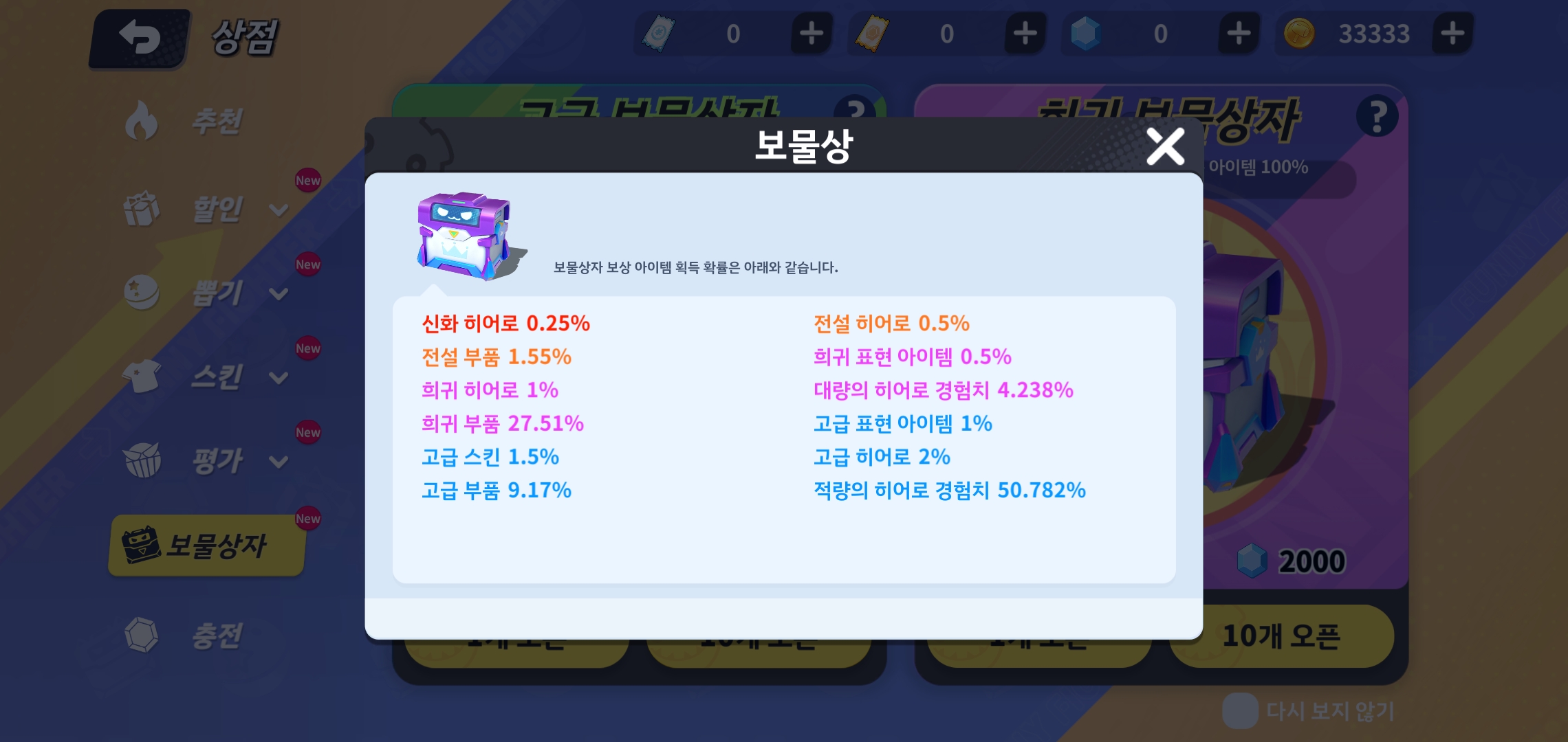 상자깡은 고급 보물상자와 희귀 보물상자가 있다. 희귀 보물상자의 확률을 보면 고급, 희귀, 전설, 신화 등급의 히어로나 부품들이 나오기도 한다. 근데 희귀 보물상자는 사실상... 게임 플레이로 오픈할 수는 없는 것 같고 고급 보물상자는 코인으로 오픈을 할 수 있어서 무과금은 고급 보물상자를 까야할 것으로 보인다.